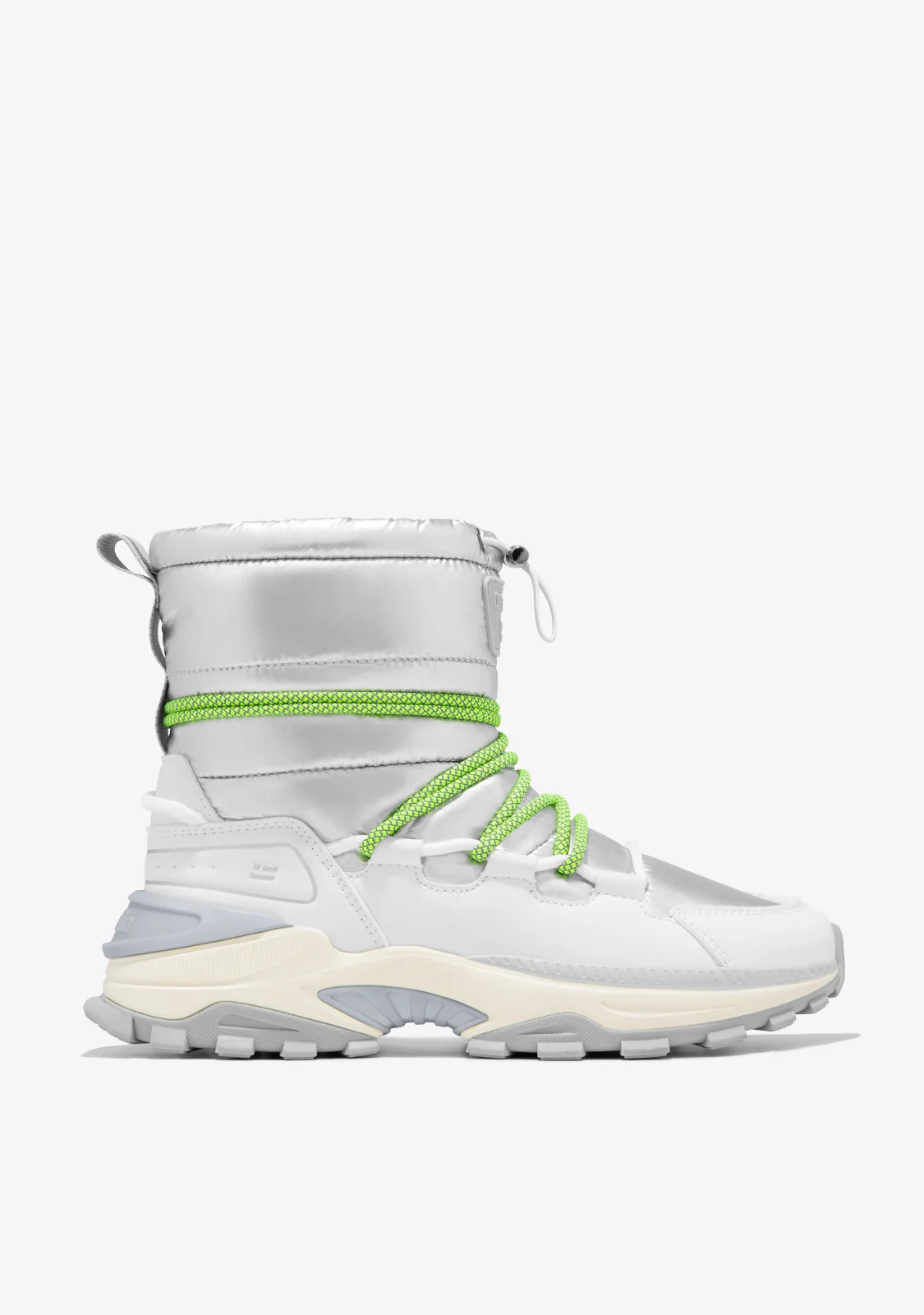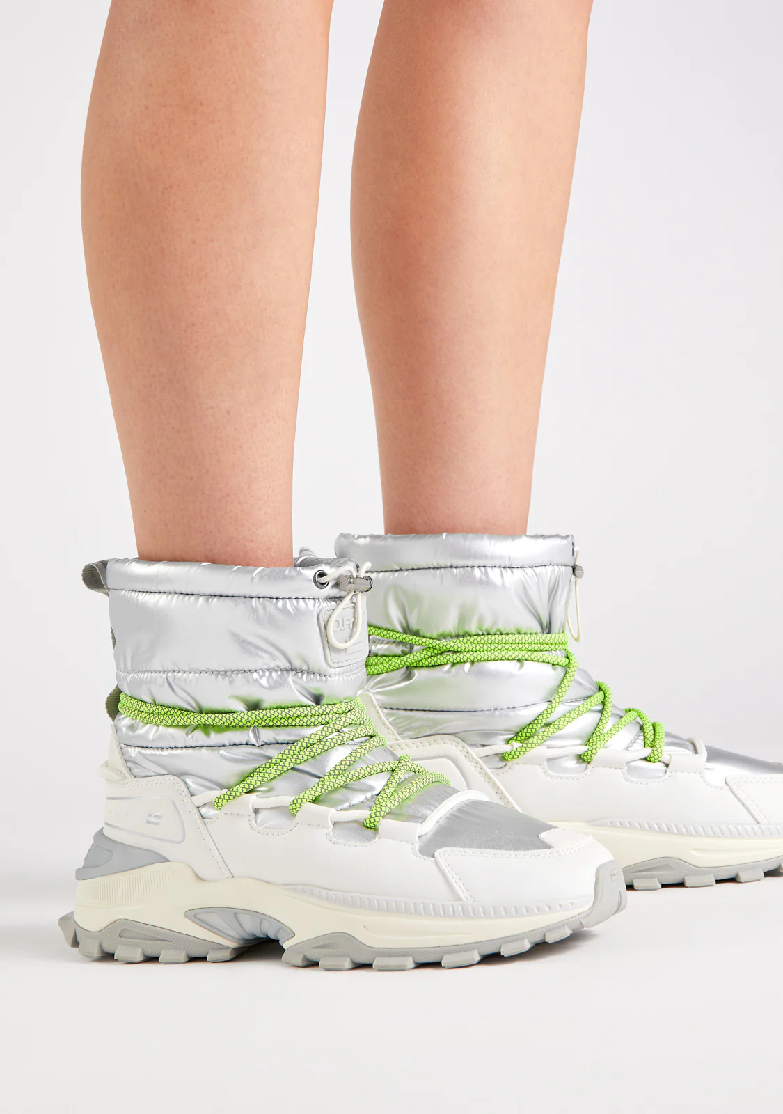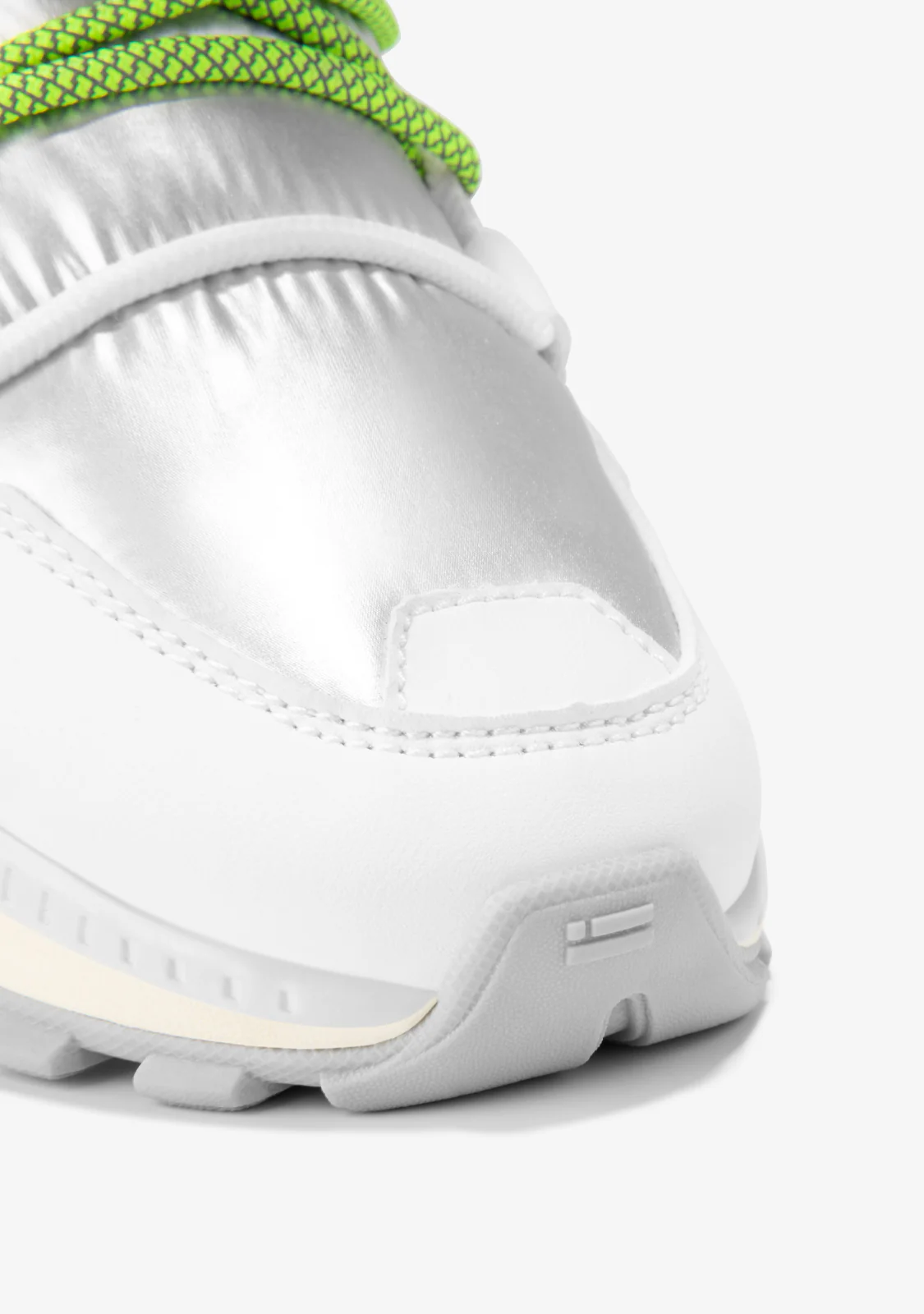 Design alto realizzato con materiali flessibili e leggeri. Questo design presenta una finitura imbottita in tonalità argentate con lacci verdi multi-posizione. Mostra la nostra bandiera e la scritta sia sul tallone che sulla parte anteriore, oltre a una chiusura regolabile nella parte superiore.