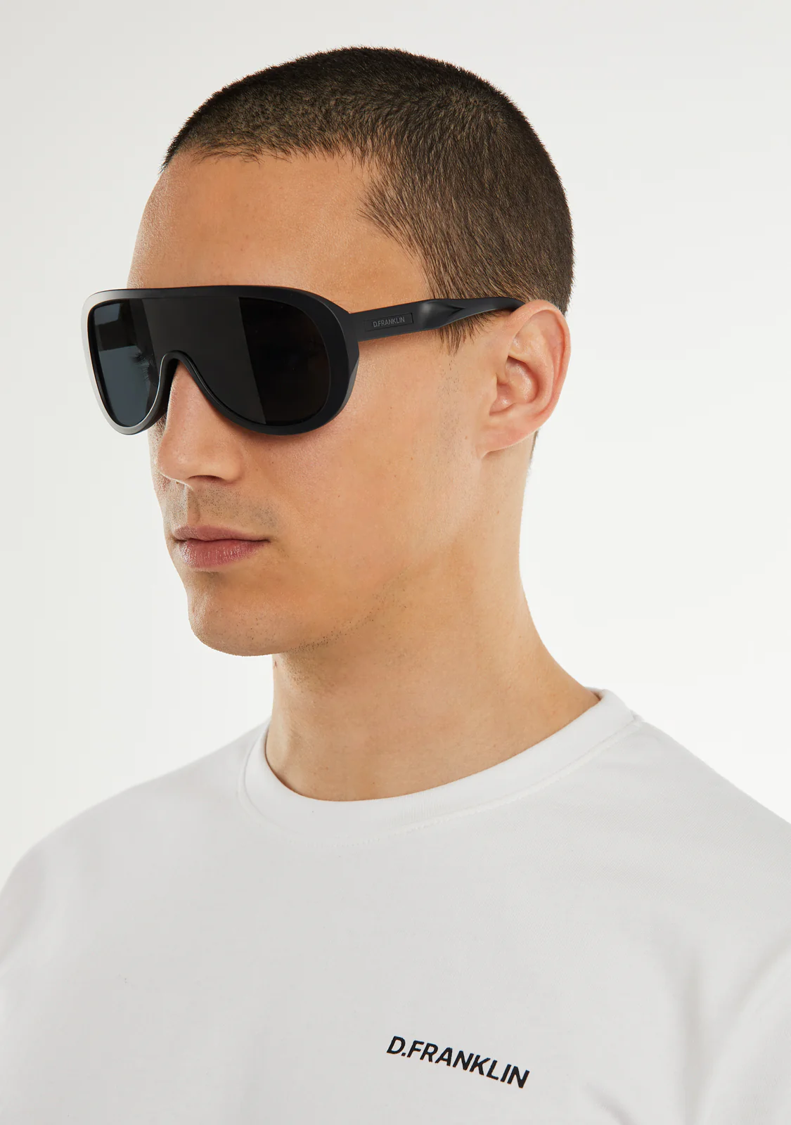 Questo modello presenta una montatura nera opaca con un’estetica leggermente curvata. Ha lenti fumé e il nostro emblema distintivo sul lato delle tempie. La larghezza uniforme delle lenti di 131 mm e il frontale di 147 mm sono uniti da una tempia di 135 mm.