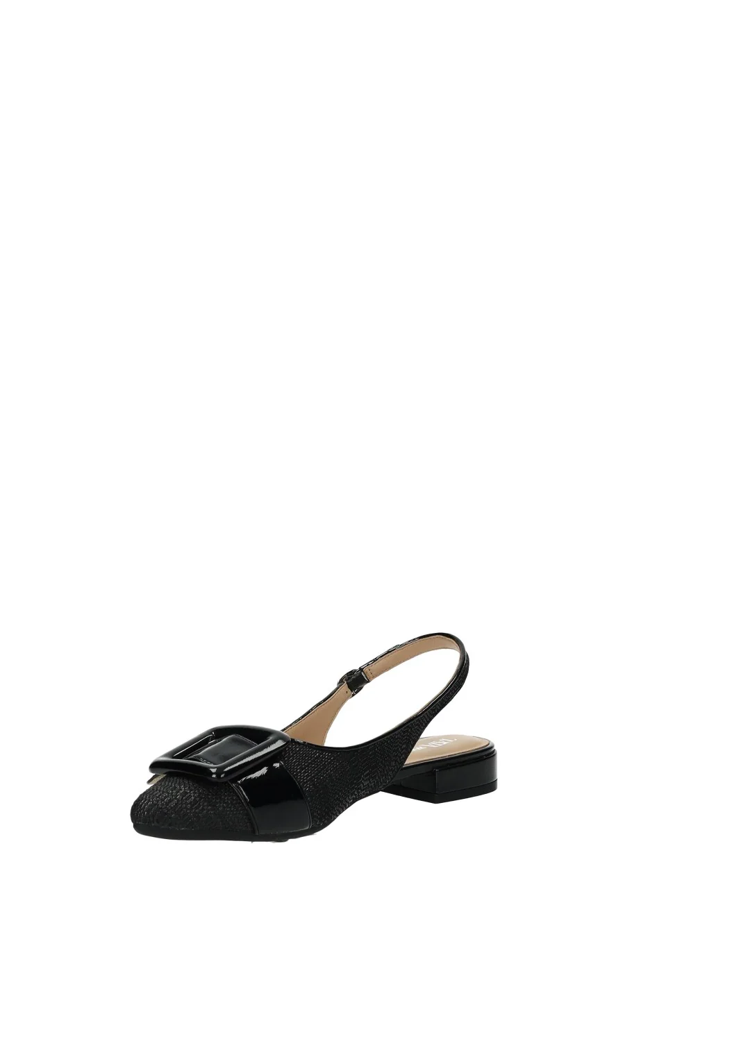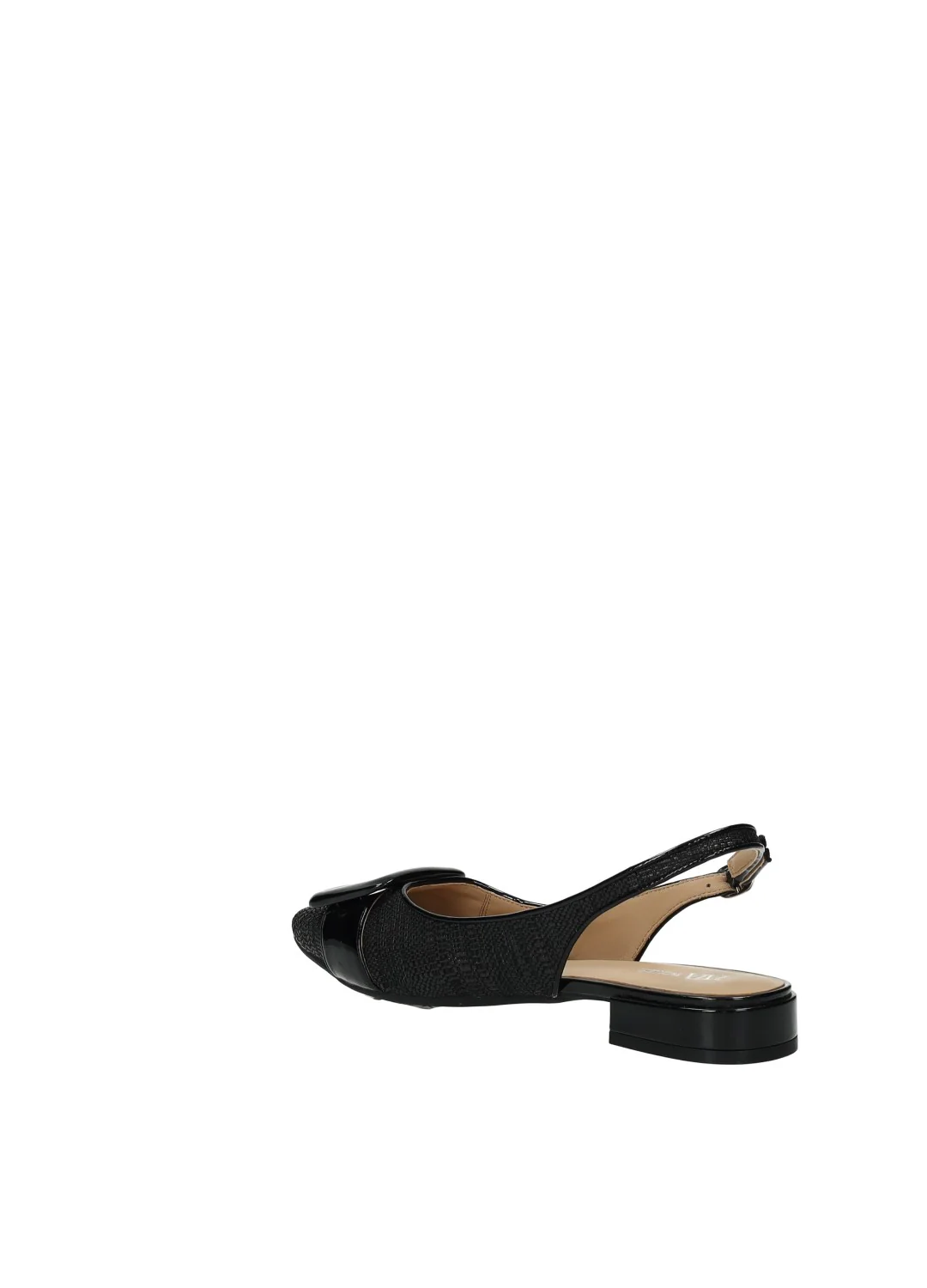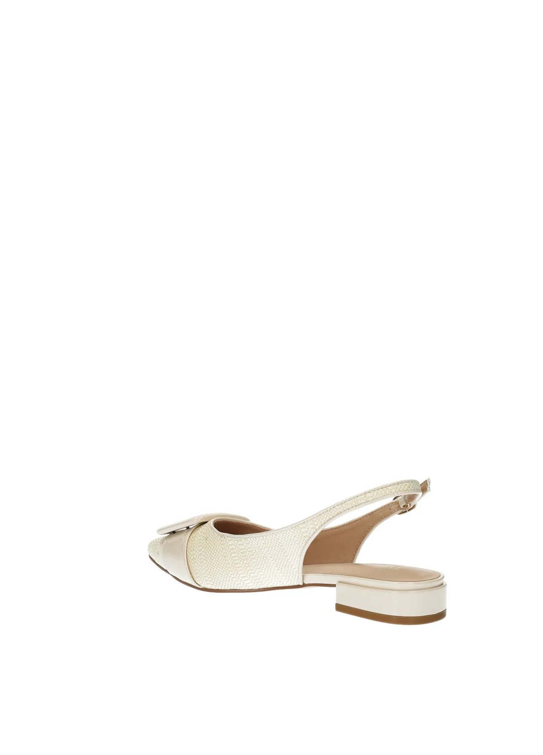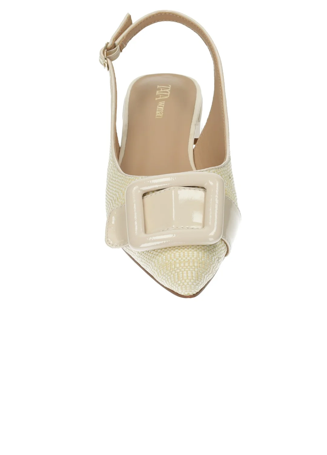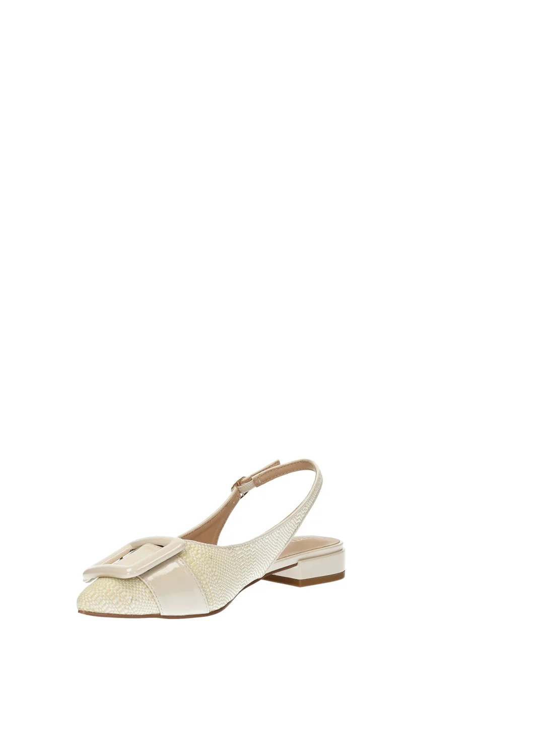 Ballerine con tomaia in rafia. fibbia quadrata e fondo in gomma.