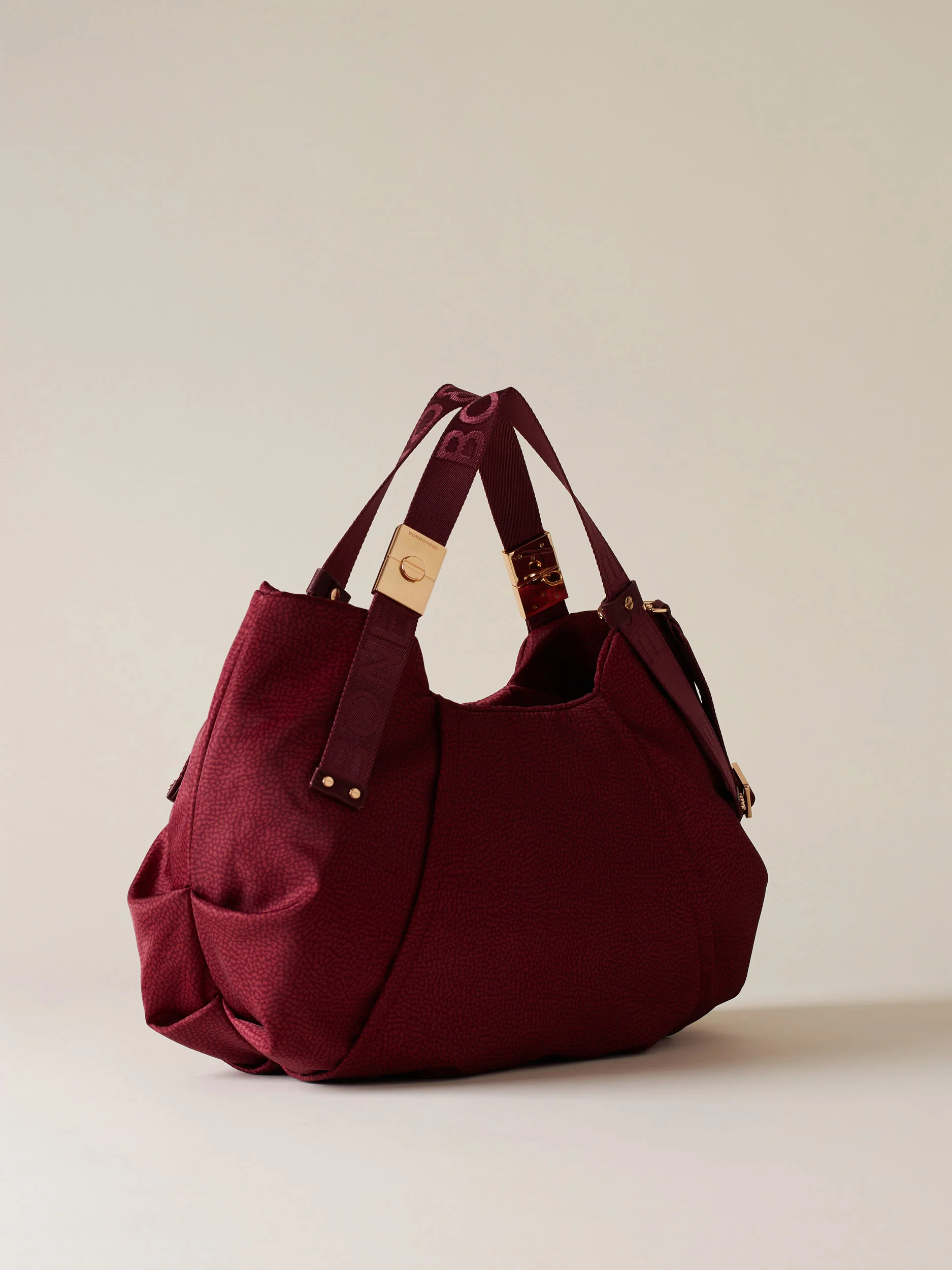 - Impugnatura a doppio manico di tessuto logato a jacquard decorato con elementi metallici d’archivio