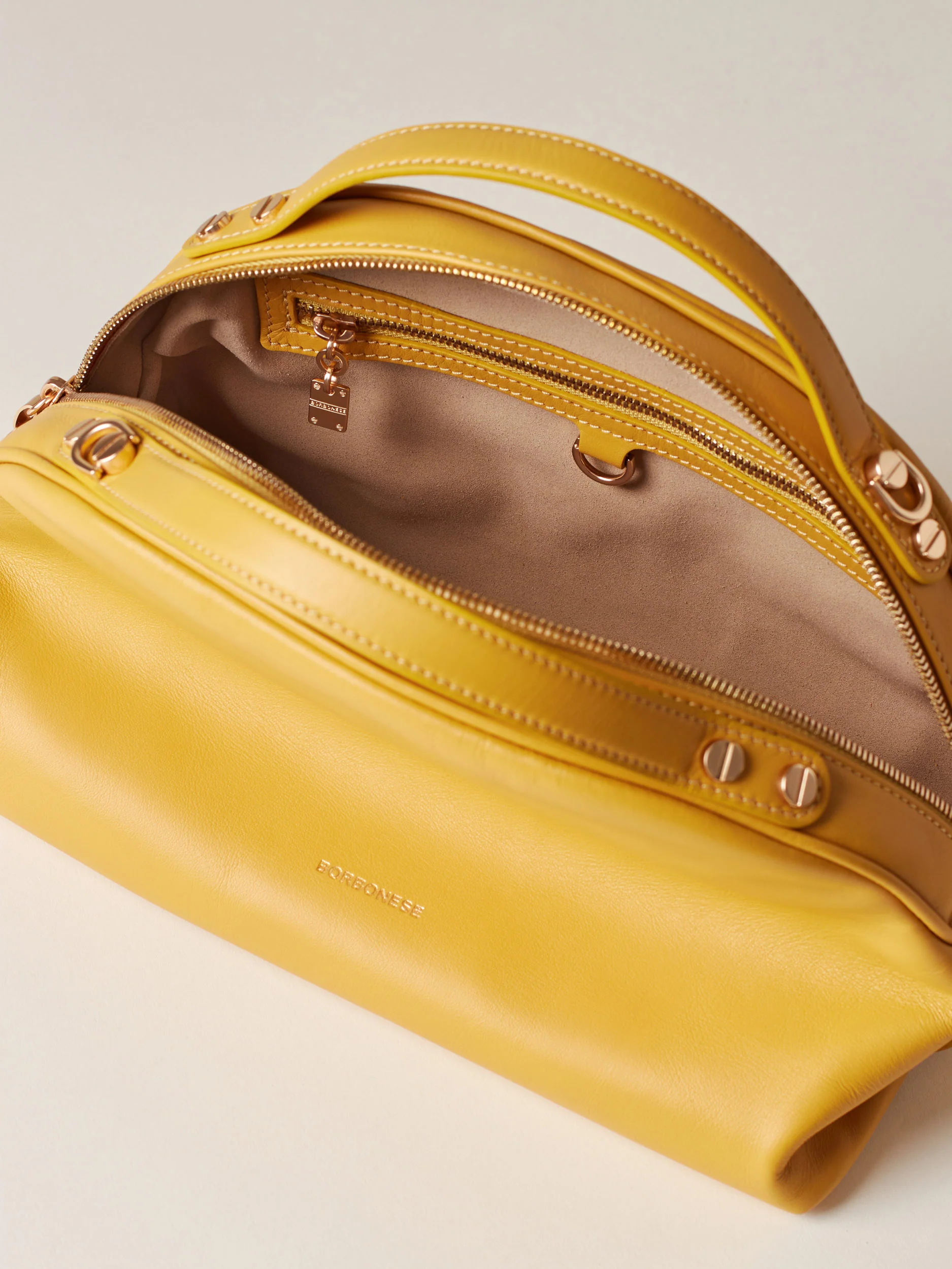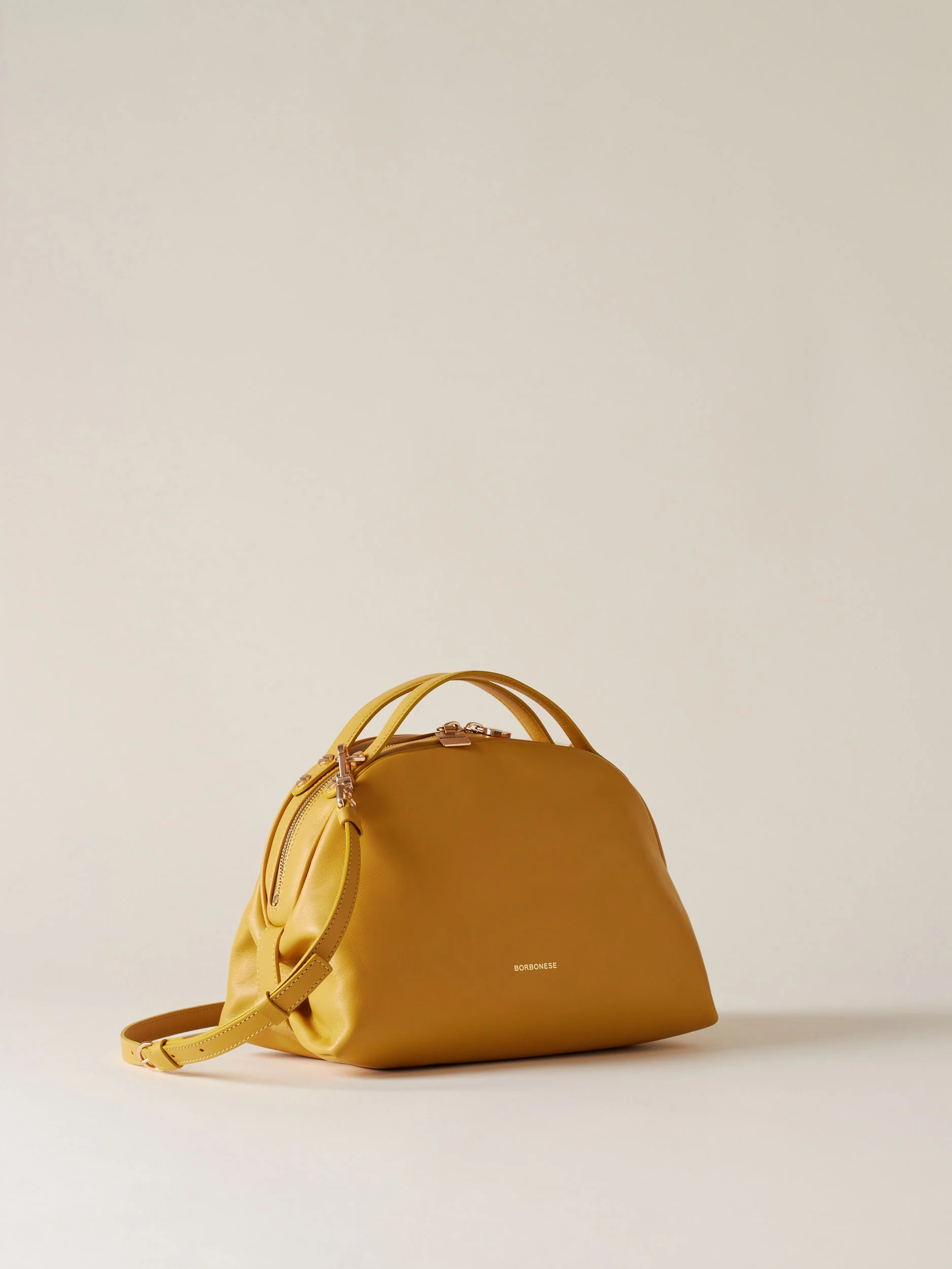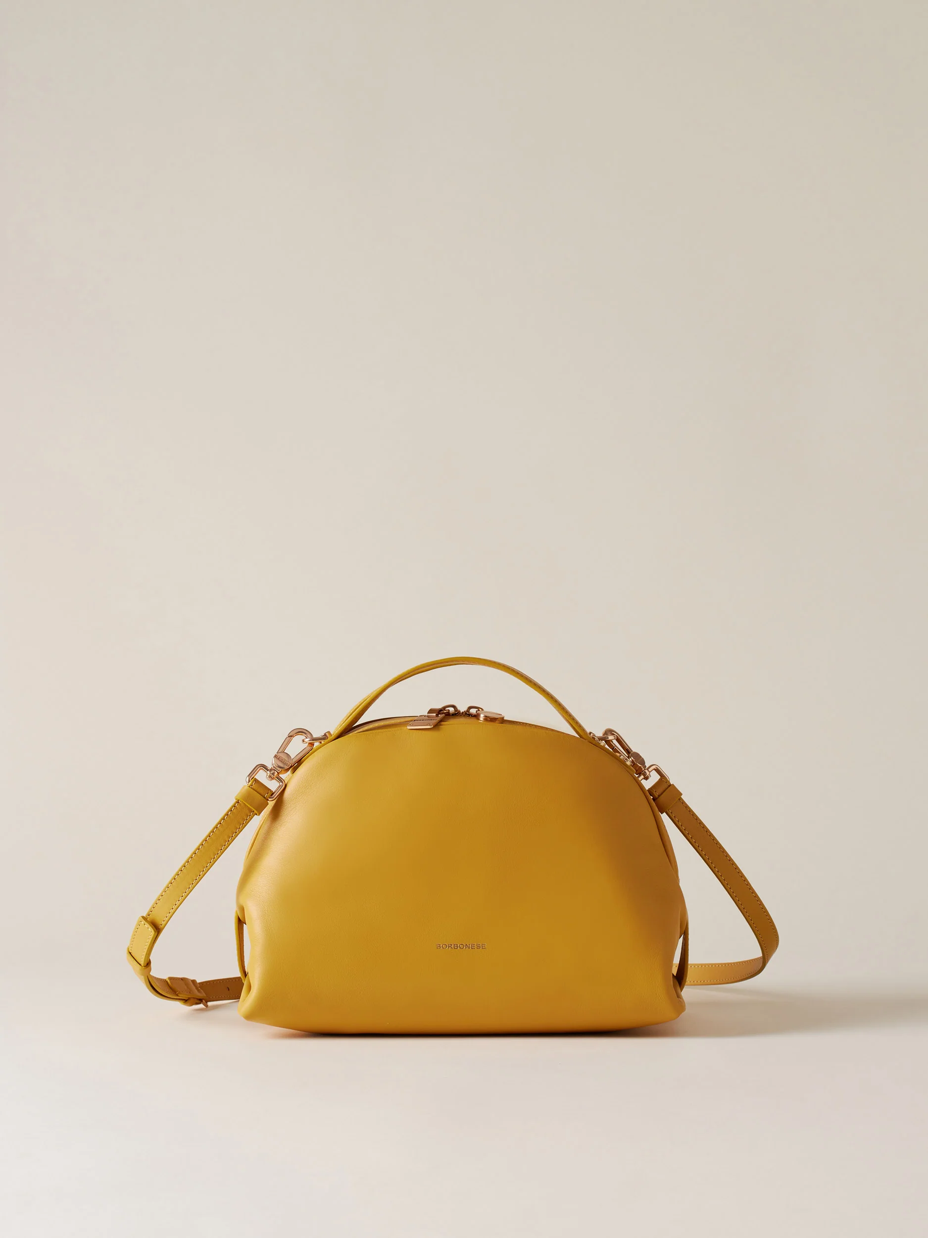 Vitello Nappato Fodera in tessuto effetto camoscio Chiusura con zip metallo e doppio cursore con tirazip vite e piastrina logata Una tasca interna chiusa con zip metallo e tirazip piastrina logata Una tasca interna aperta Tracolla regolabile con fibbia e removibile con moschettoni Metallerie oro chiaro opaco Misura small Made in Italy