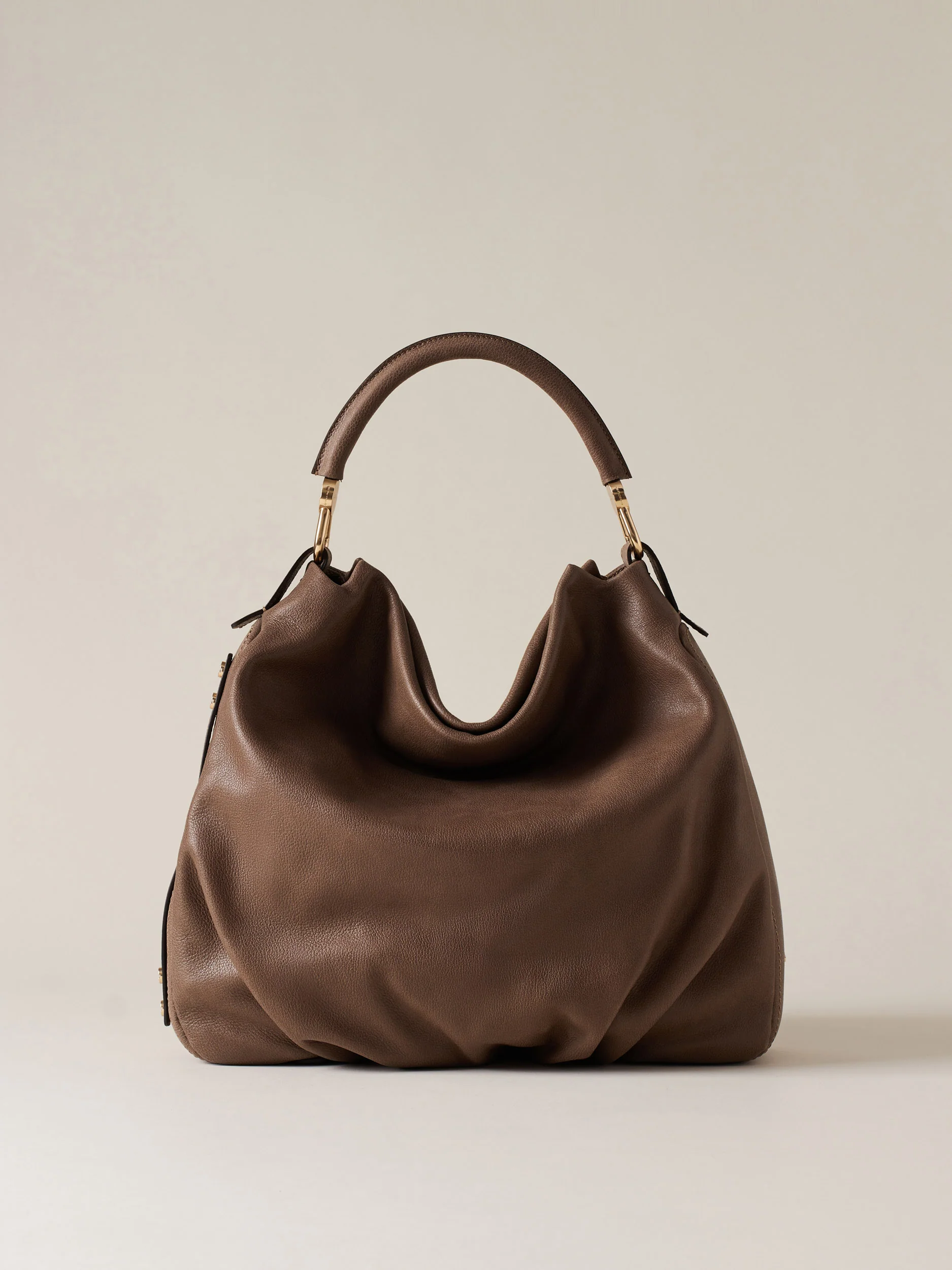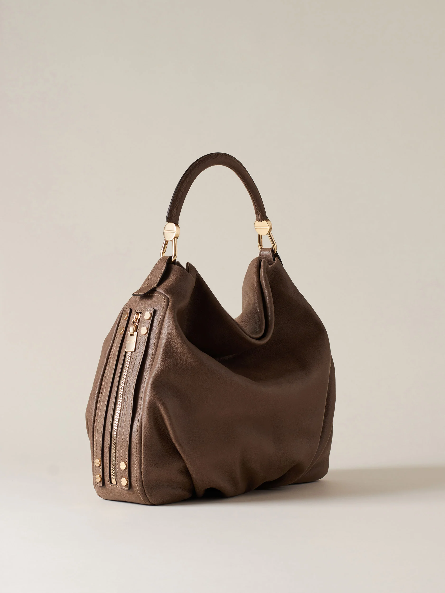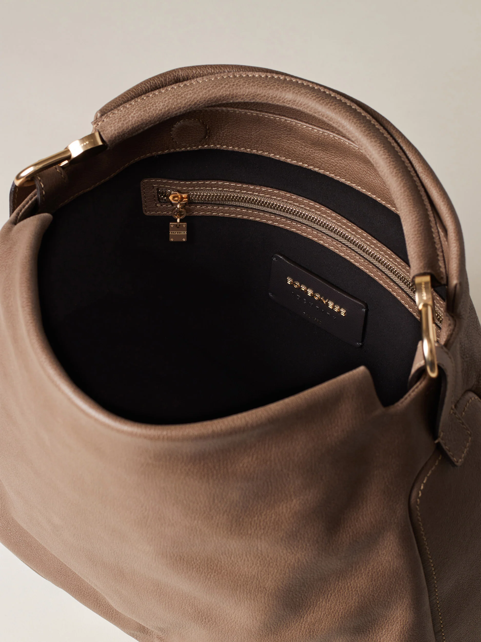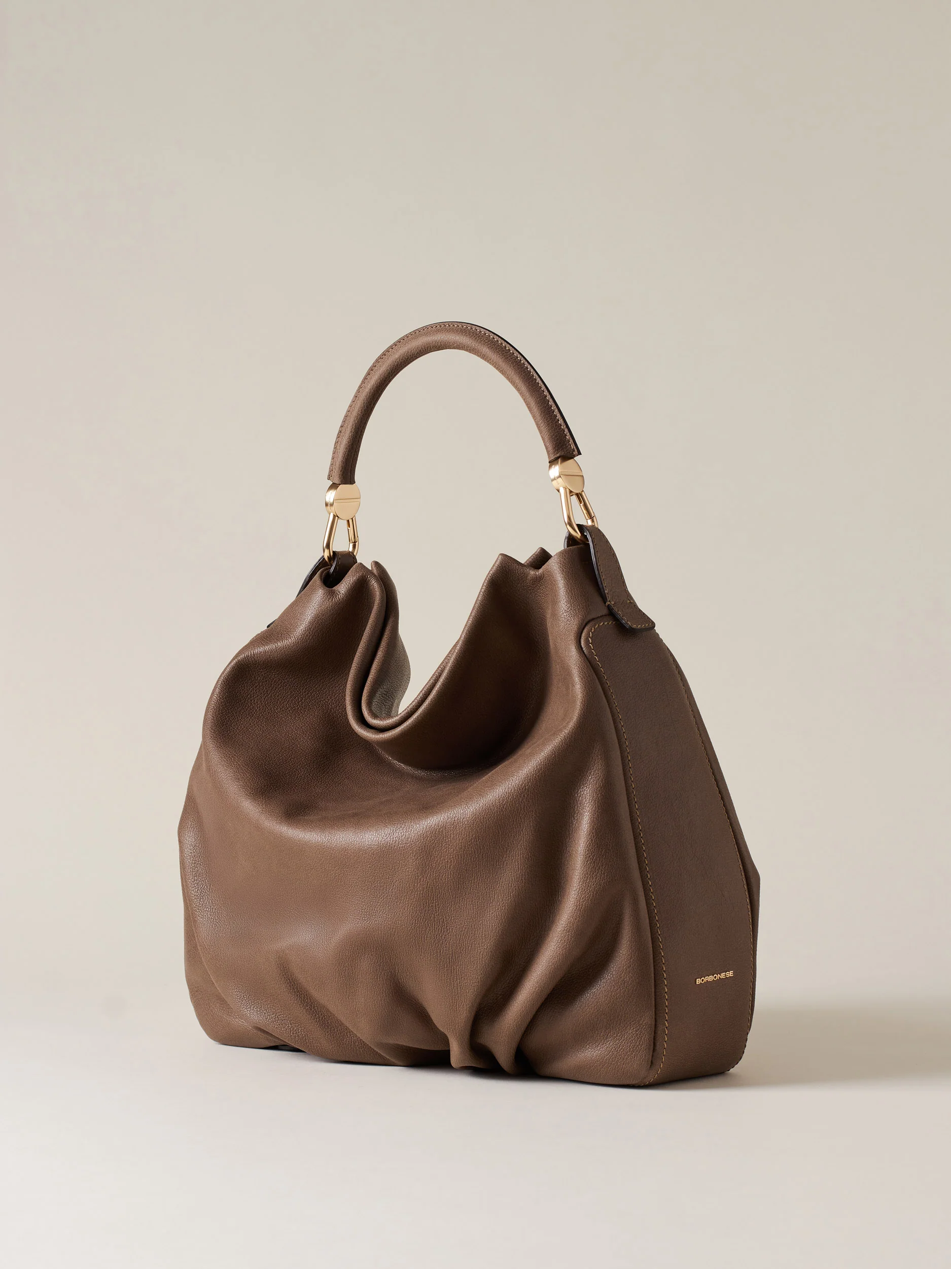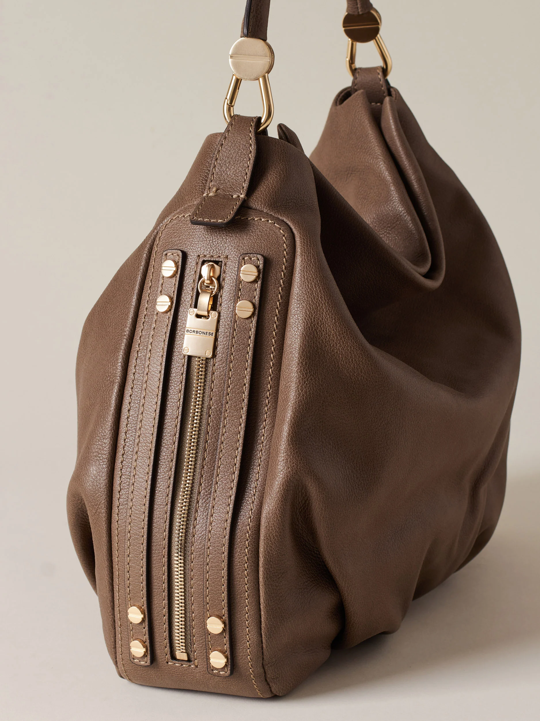 Vitello stampato effetto nabuk Fodera in tessuto effetto camoscio Chiusura con calamita invisibile Su fianco una tasca laterale chiusa con zip metallo e tiralampo piastrina logata Una tasca interna aperta Una tasca interna chiusa con zip metallo e tirazip vite Manico tubolare in vitello con moschettoni logati Sul fianco Lettering Borbonese in metallo Metallerie oro […]