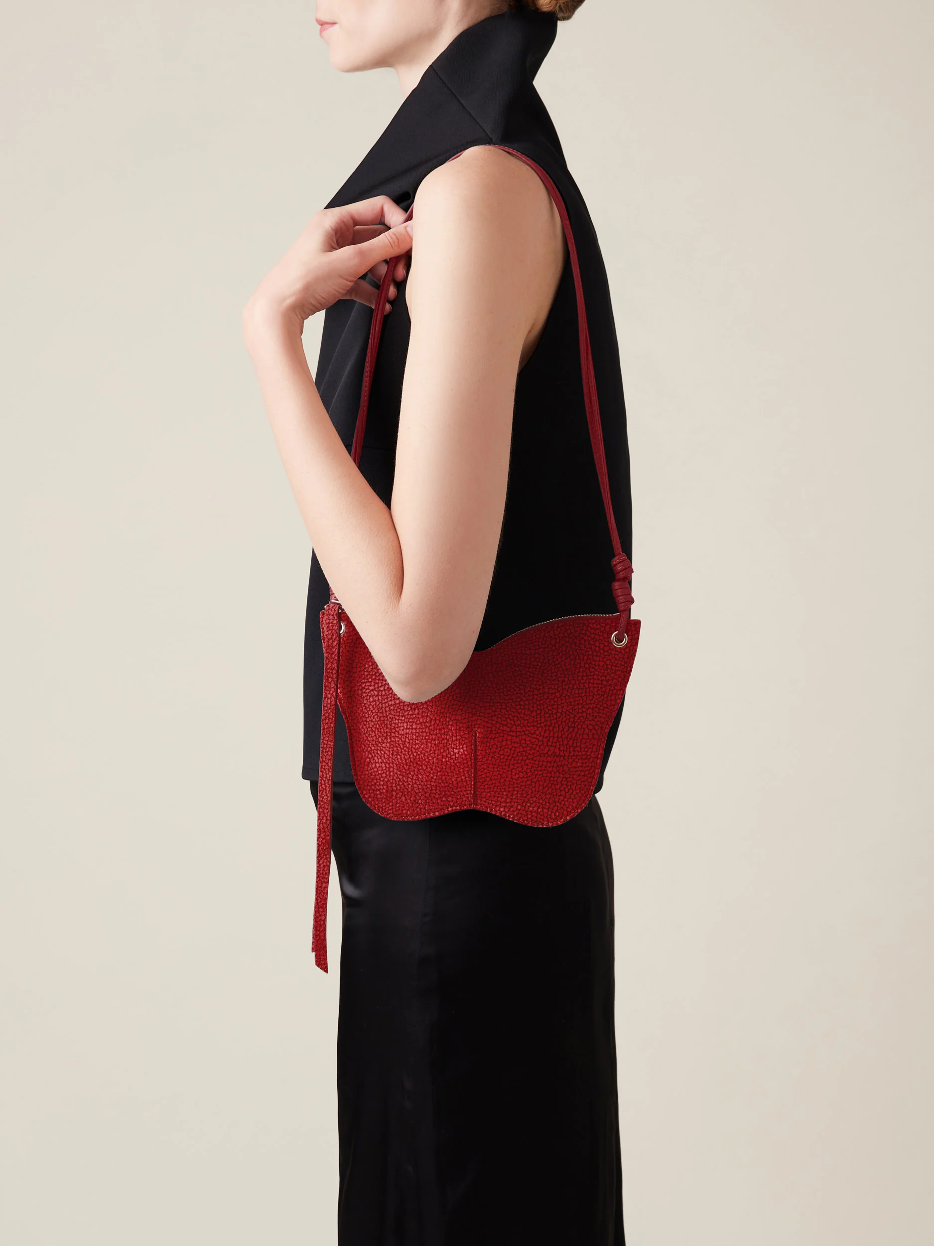 Design a forma di farfalla Camoscio OP Chiusura con zip esterna e tiralampo con vite Interno con fodera accoppiata effetto tessuto Taschina interna aperta Tracolla regolabile tramite due piccoli nodi posti all’estremità Metallerie oro chiaro Misura Mini