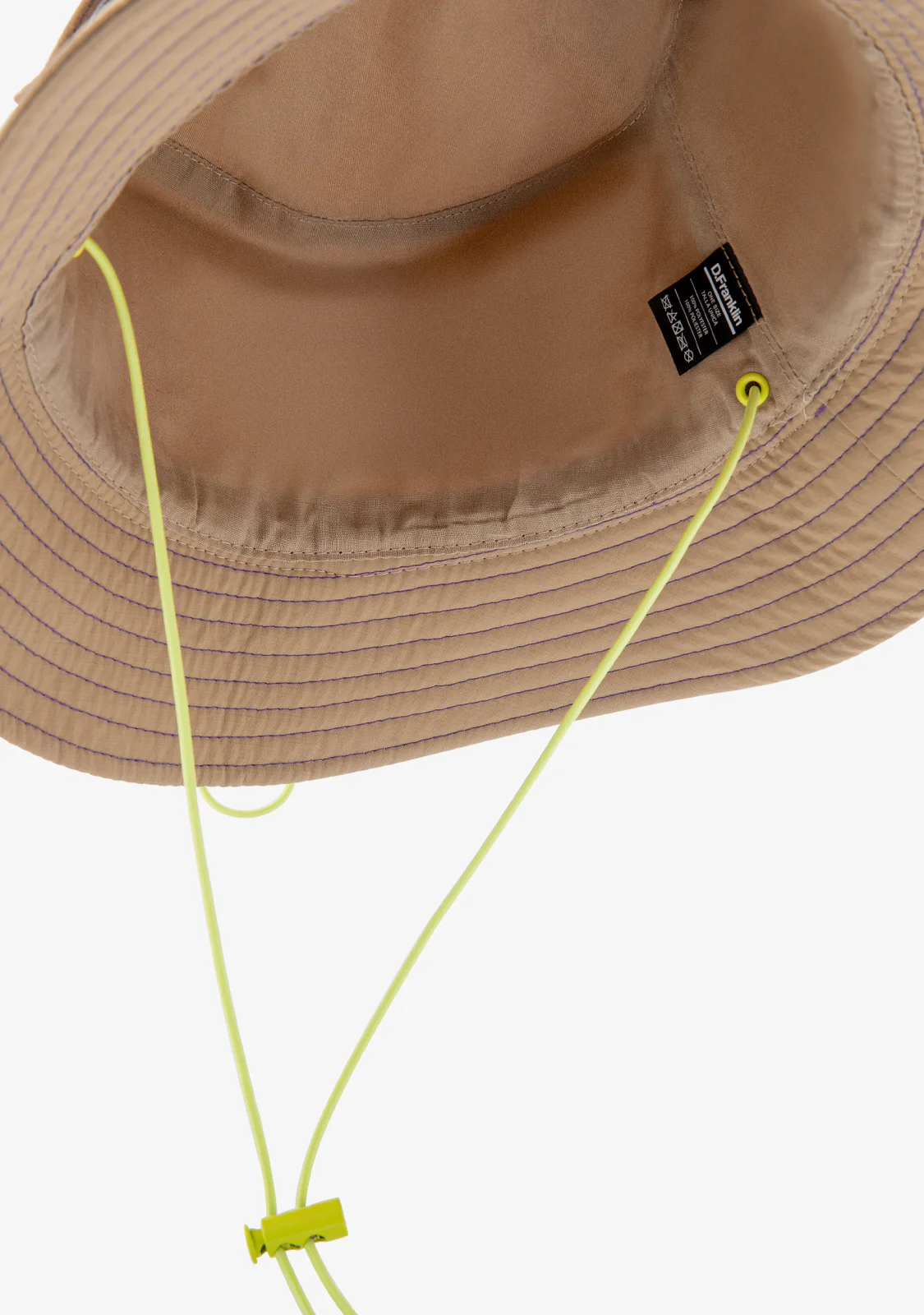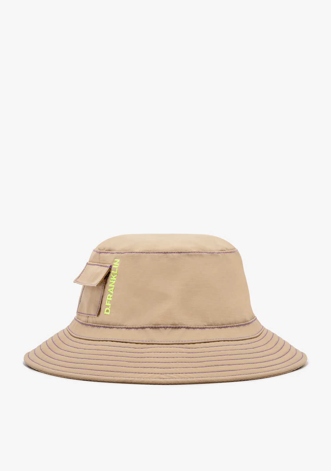 Cappello a secchiello beige per esplorare le strade, ovunque tu vada. Un accessorio quotidiano con un’essenza di streetstyle. Realizzato con dettagli di cucitura viola. Corda elastica regolabile sul retro e al collo in lime. Logo ricamato D.Franklin accanto alla tasca laterale.