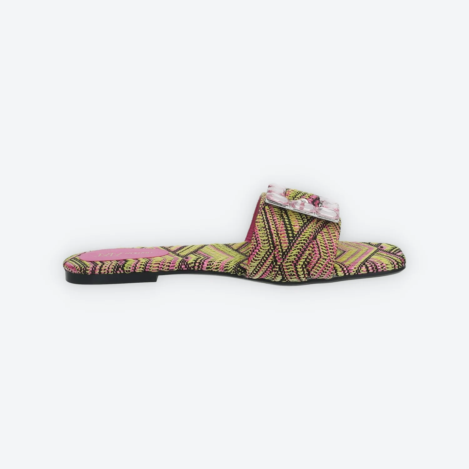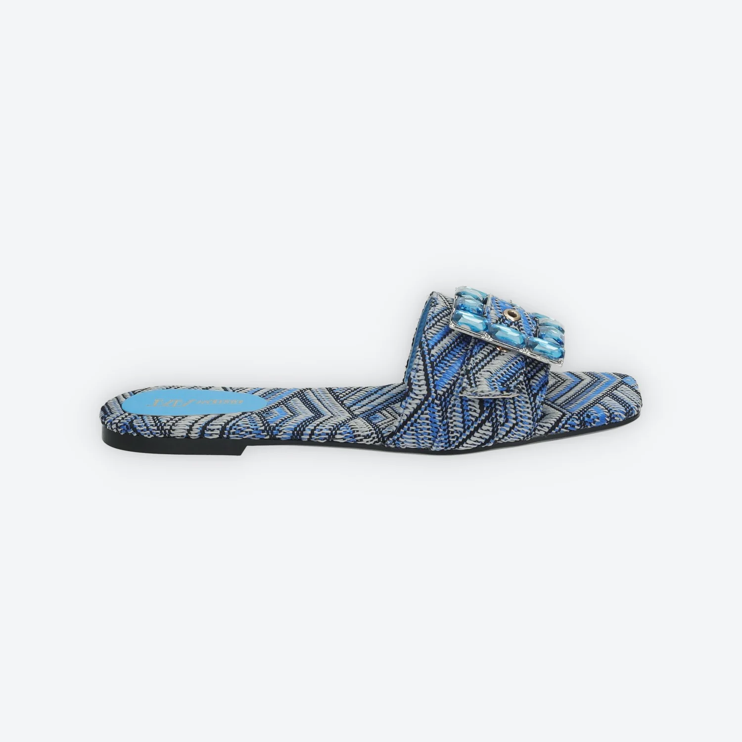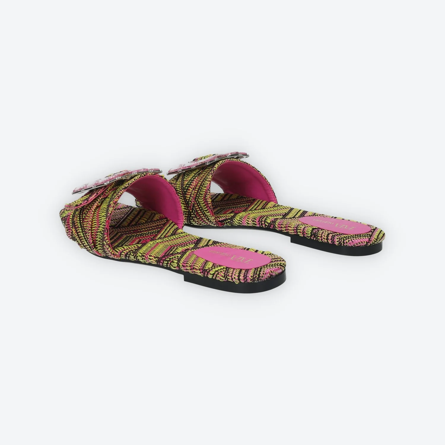 Sandali flat con citurino ricamato avvolgente.Dettaglio tessuto paglia