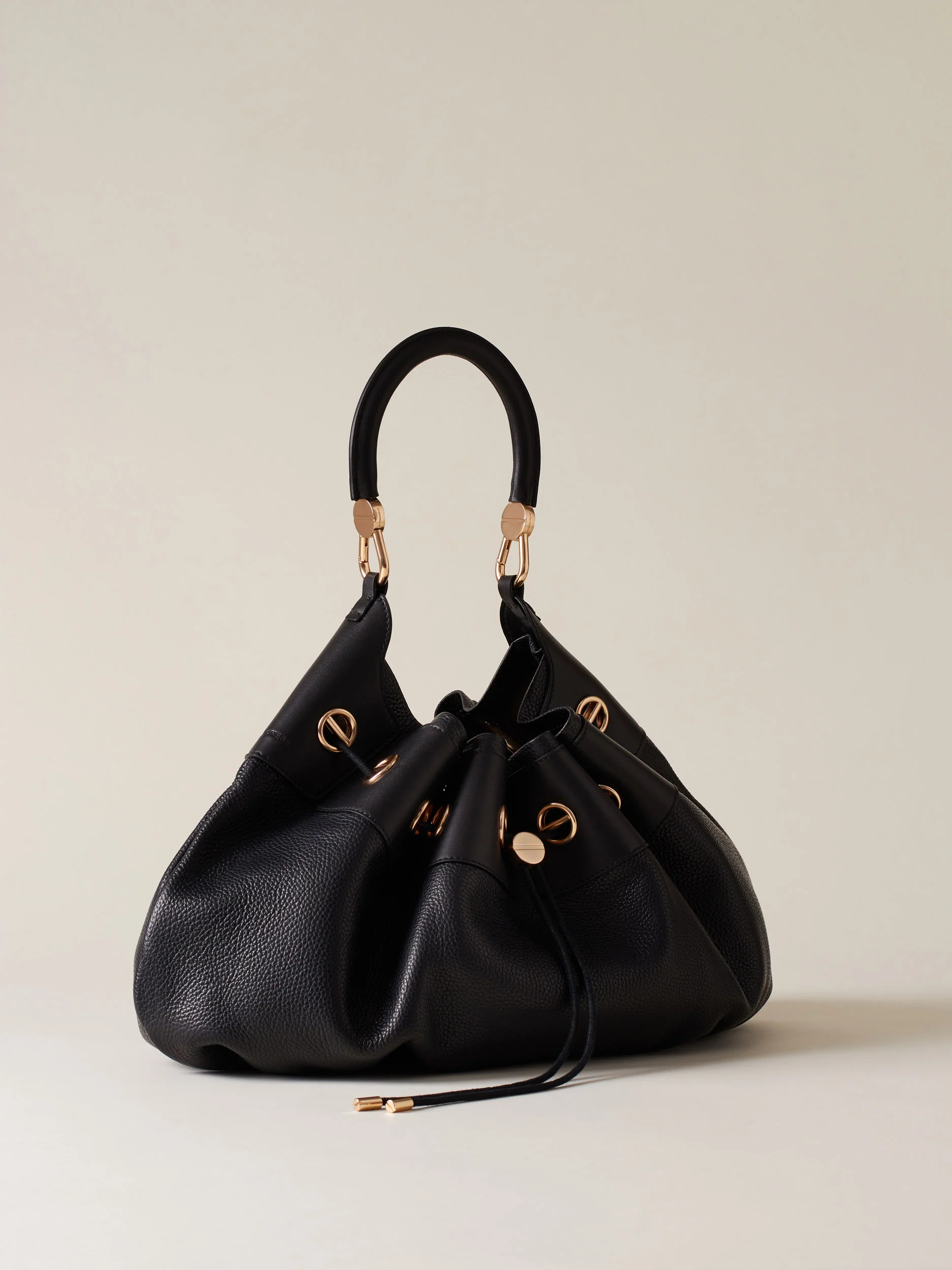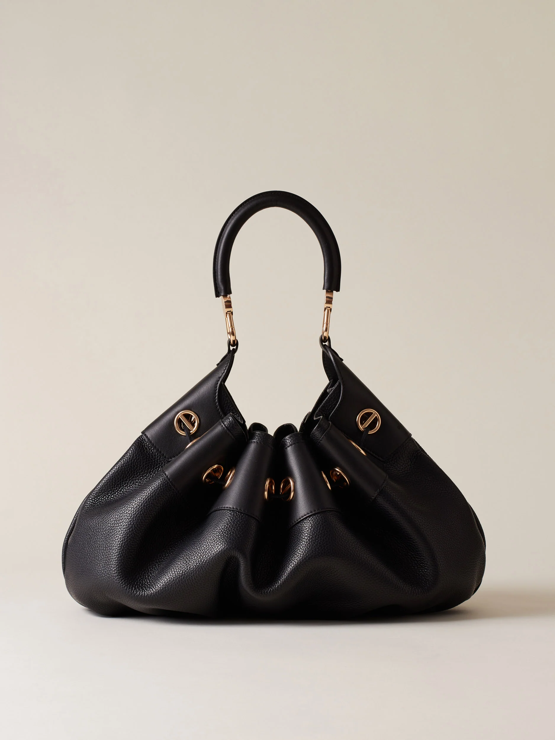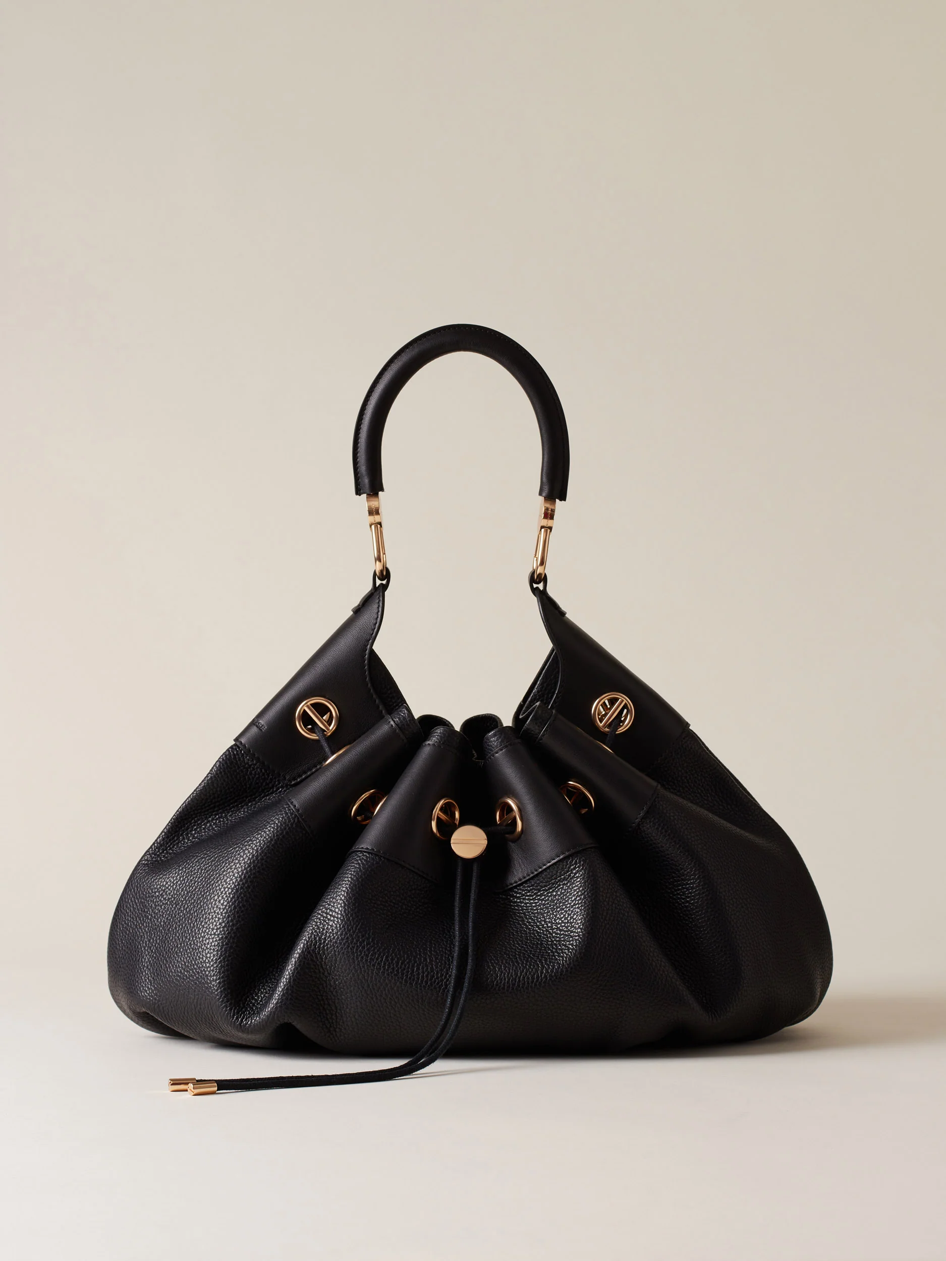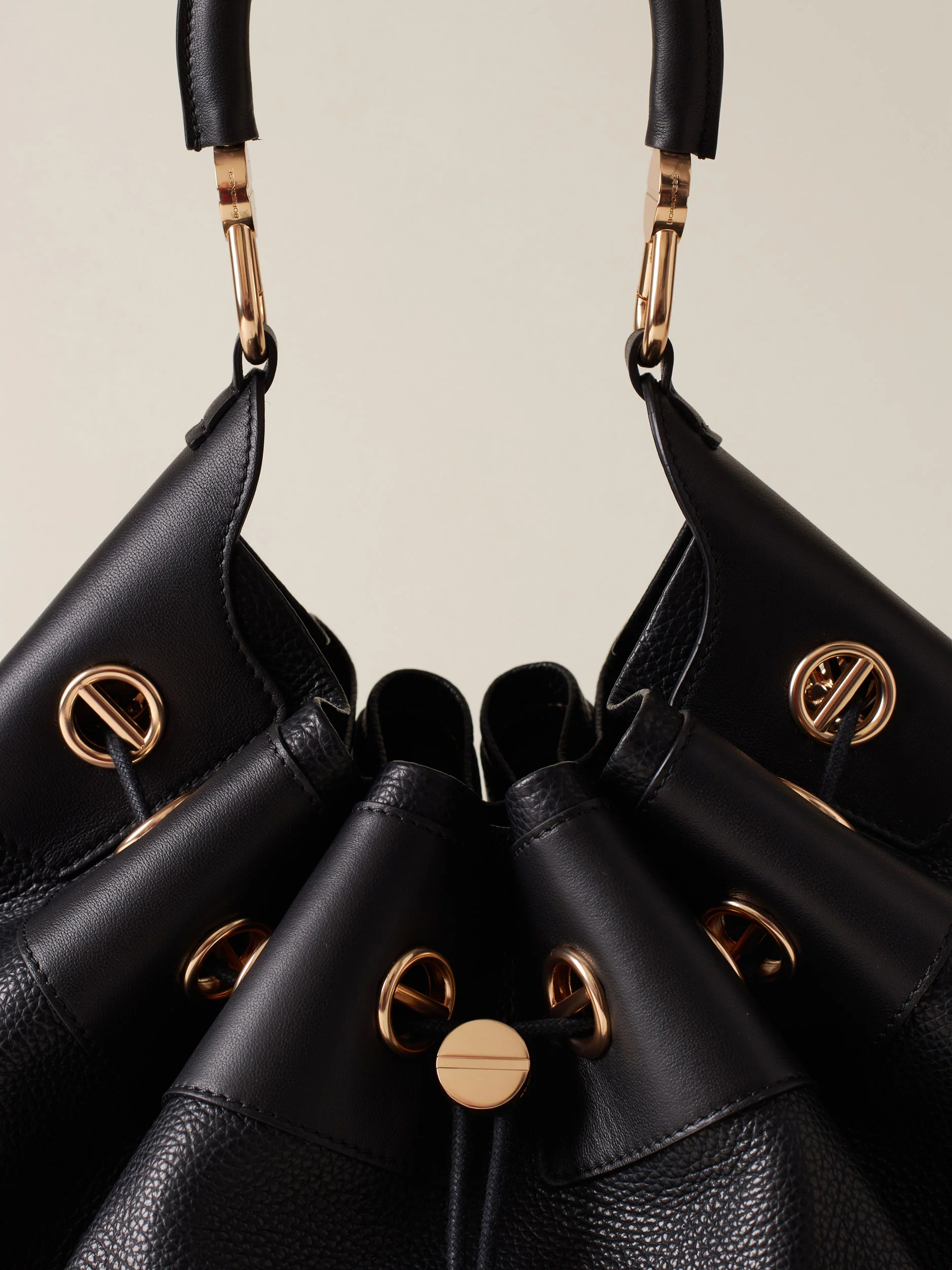 Vitello stampato bottalato Dettagli in vitello con elementi decorativi a vite Sfoderata Chiusura a coulisse Manico tubolare con moschettoni logati Una pouch interna chiusa con zip metallo e tirazip vite removibile con moschettone Metallerie oro chiaro opaco Misura large Made in Italy
