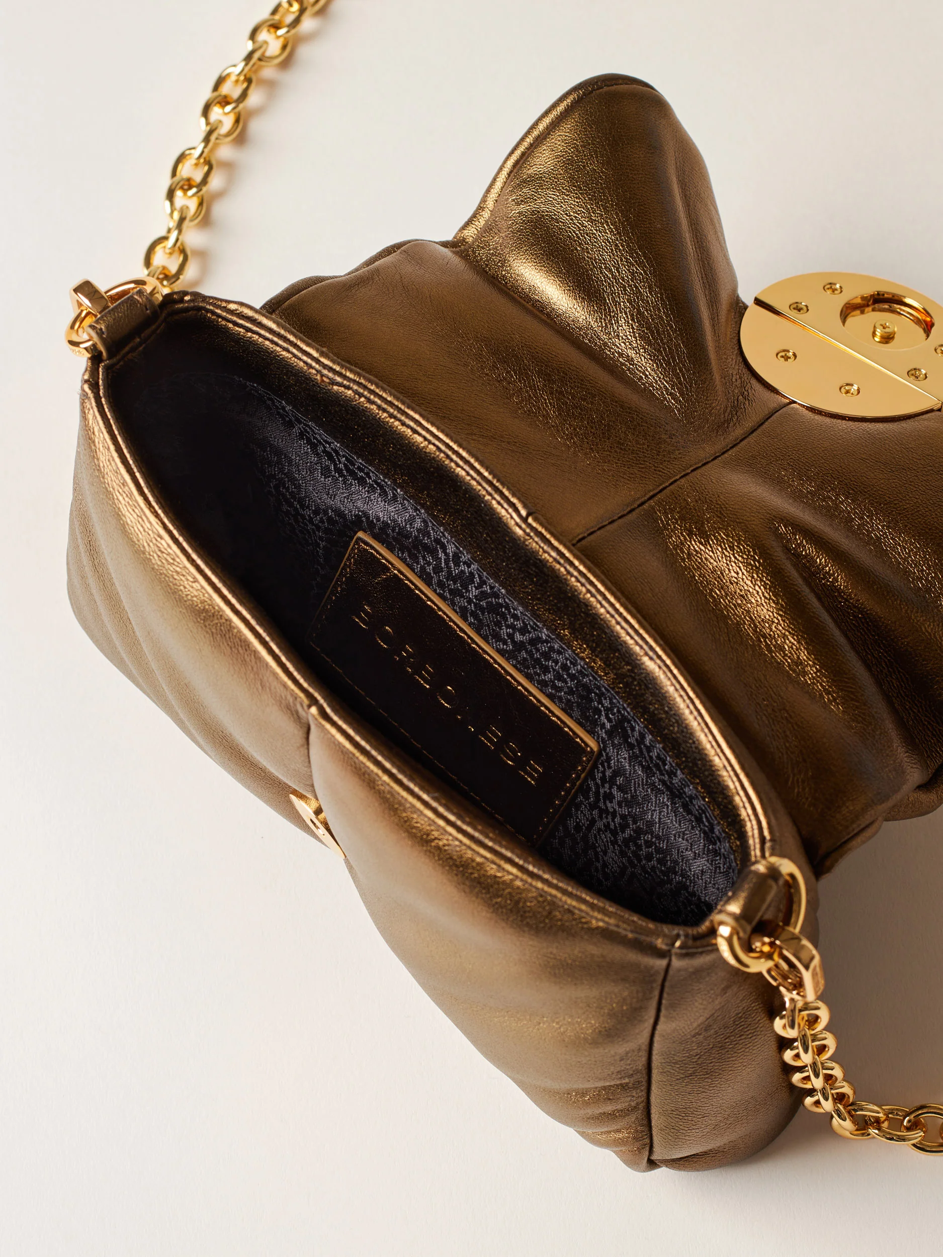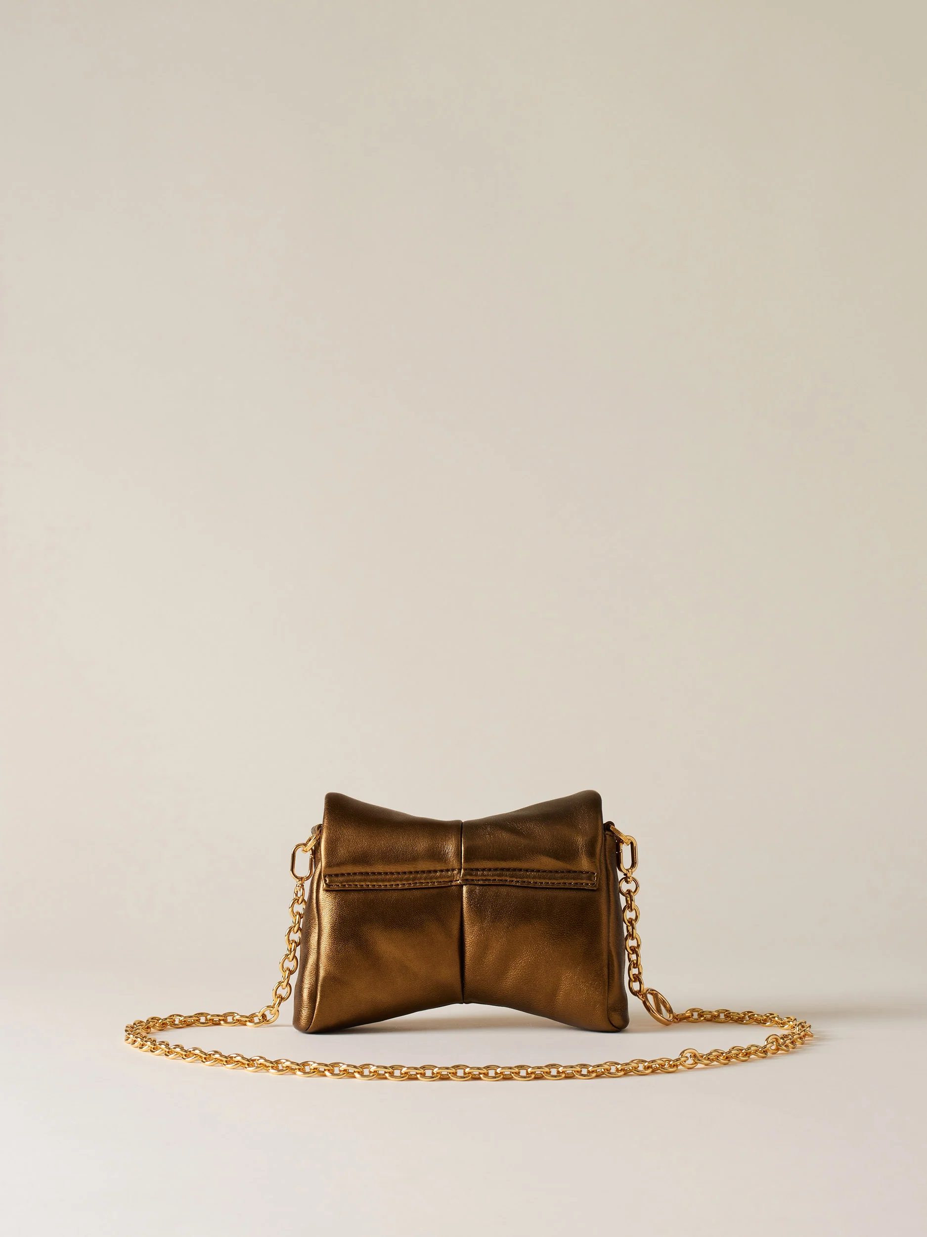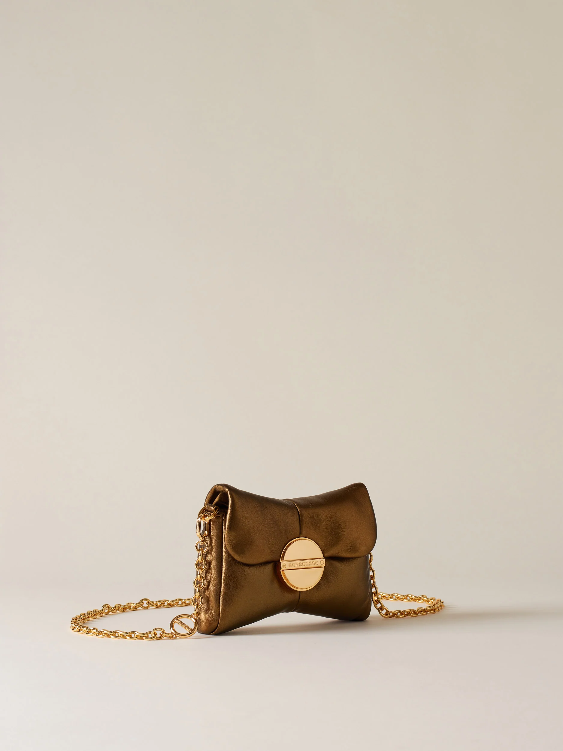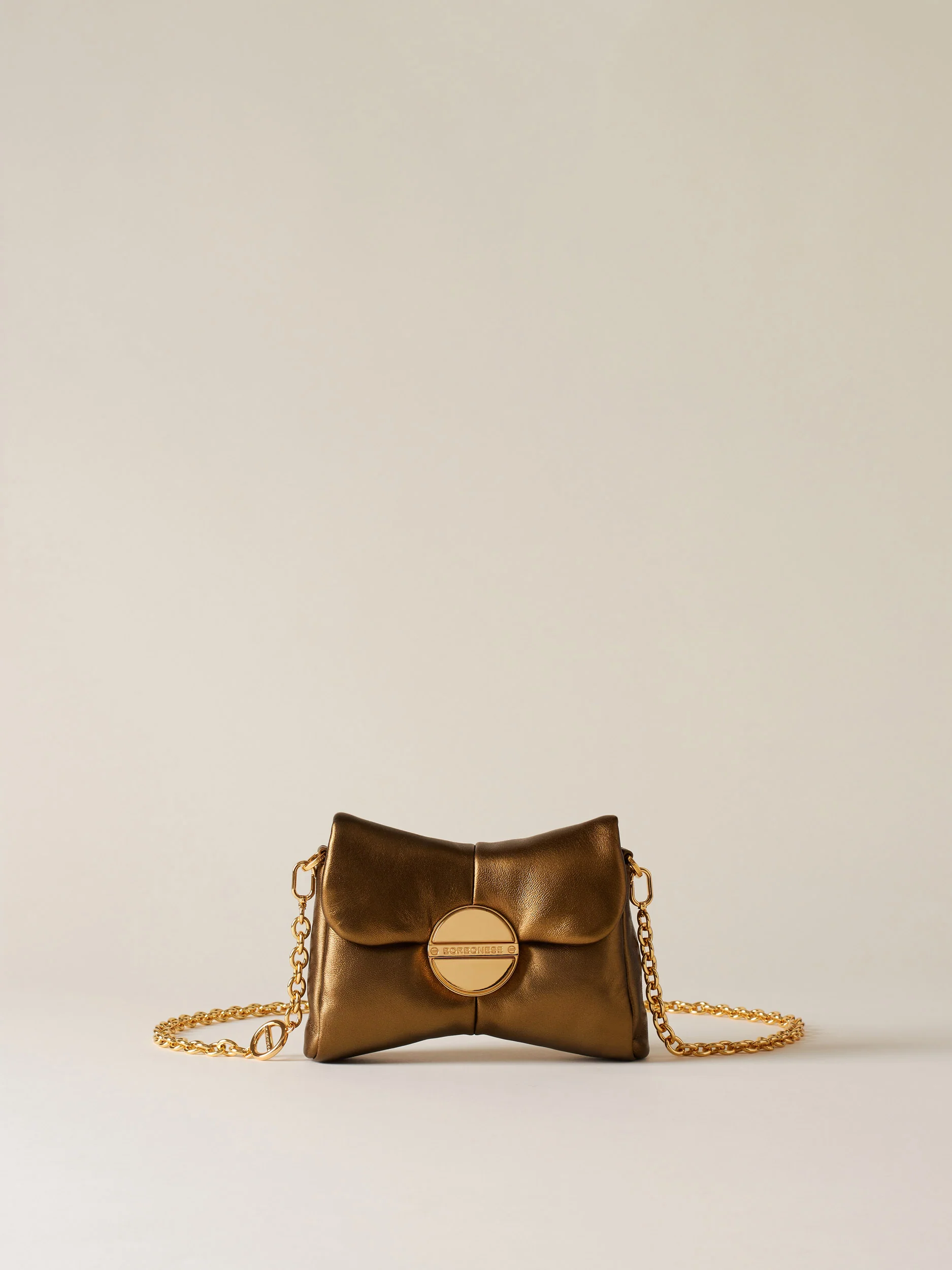 Nappa laminata Fodera di tessuto jacquard riciclato Tracolla di catena con elemento vite logato, removibile con moschettoni Chiusura con patta e magnete Metallerie oro Misura mini