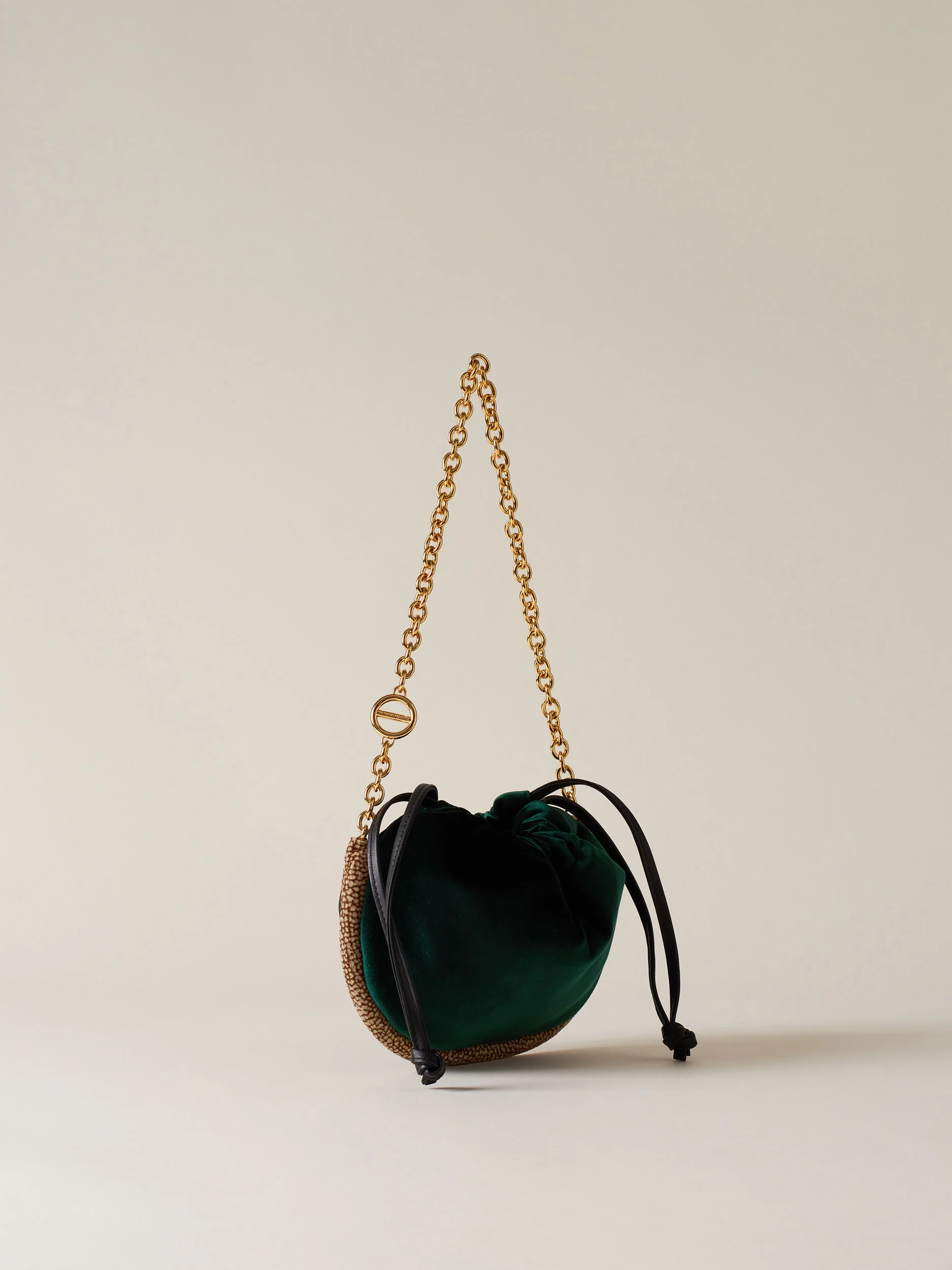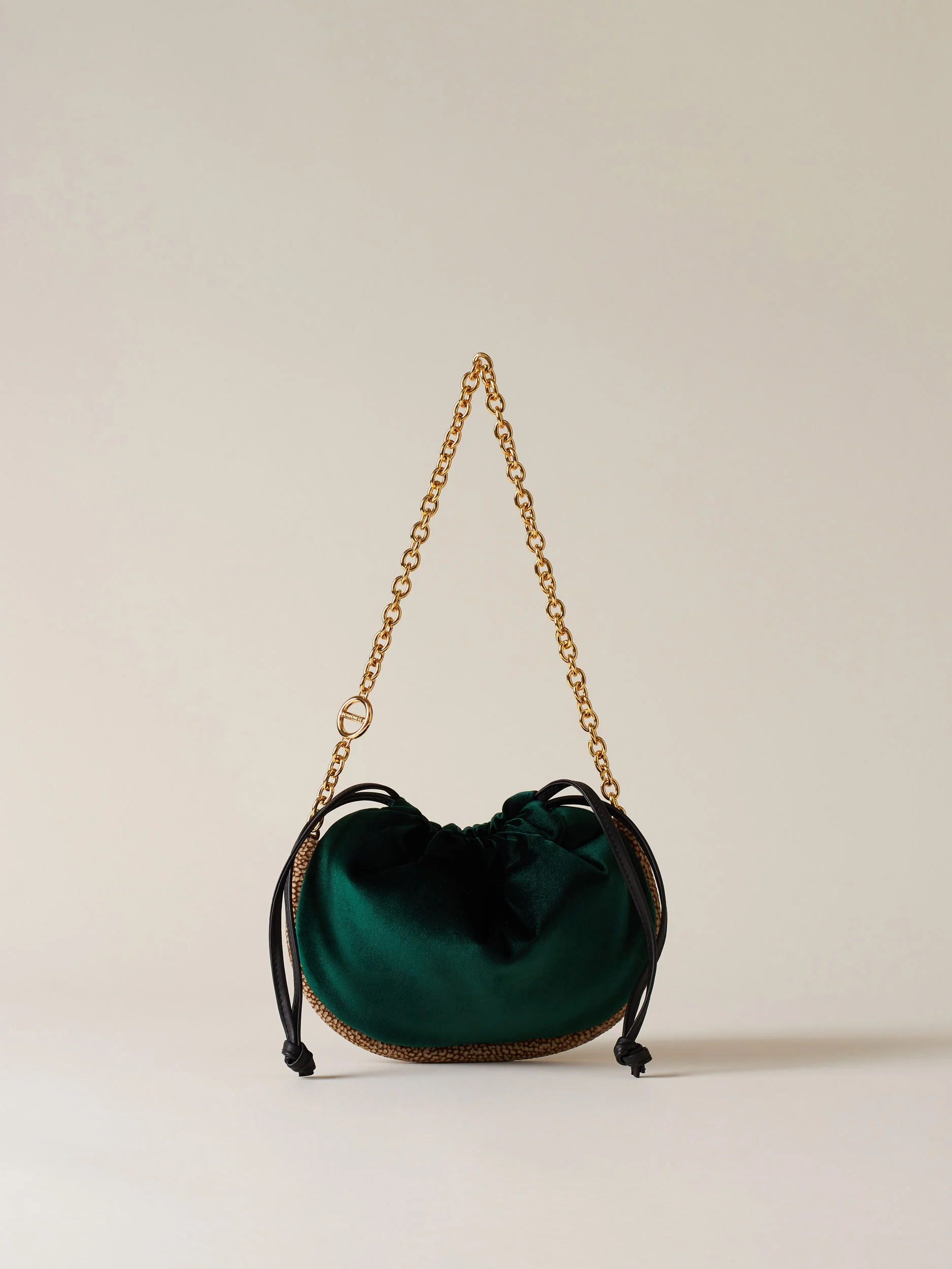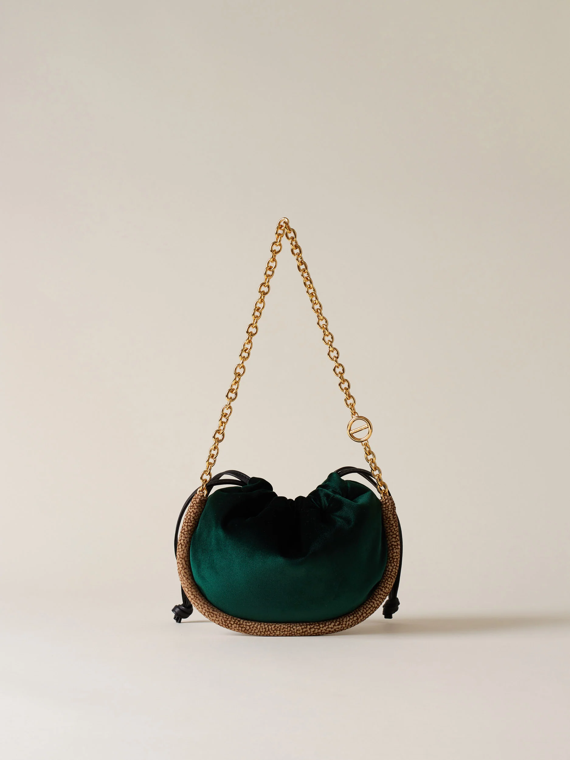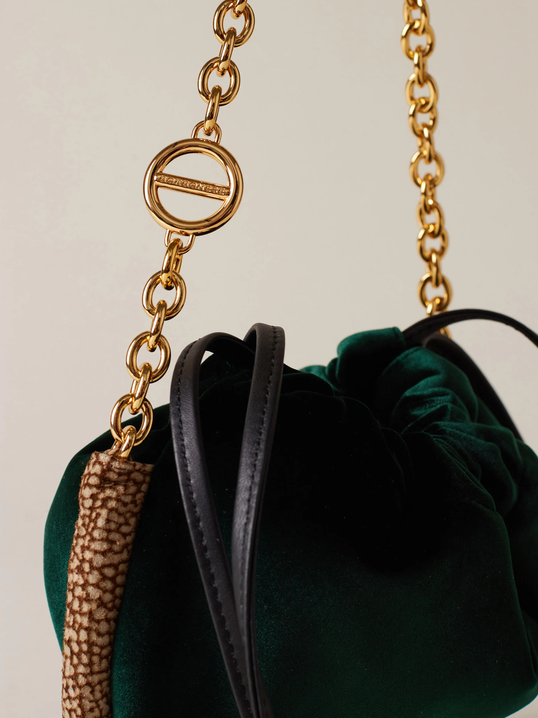 Velluto Dettagli in Camoscio Op Fodera in tessuto jacquard riciclato Tracolla di catena con elemento vite logato Chiusura a coulisse Una taschina interna aperta Metallerie oro Misura small