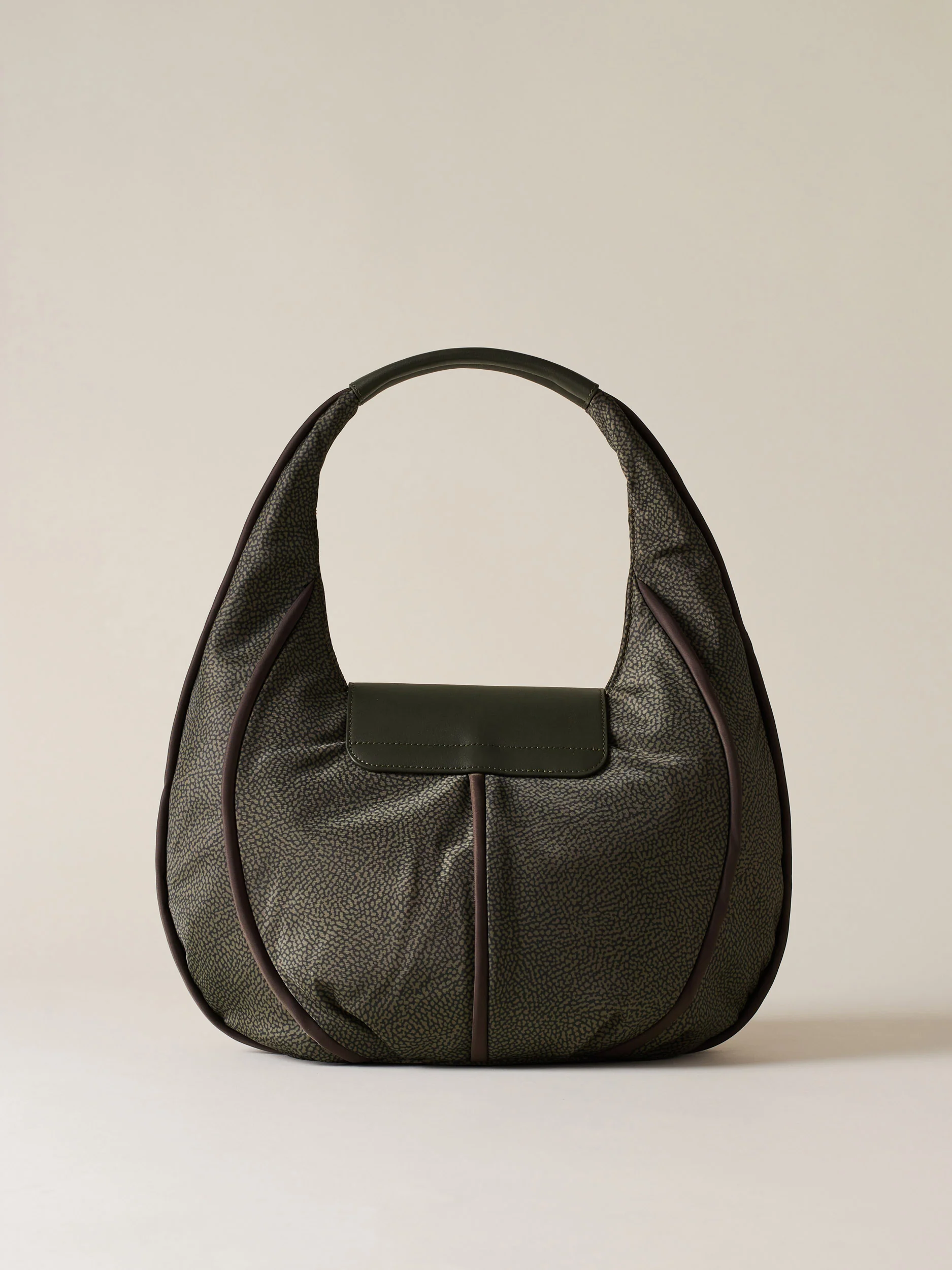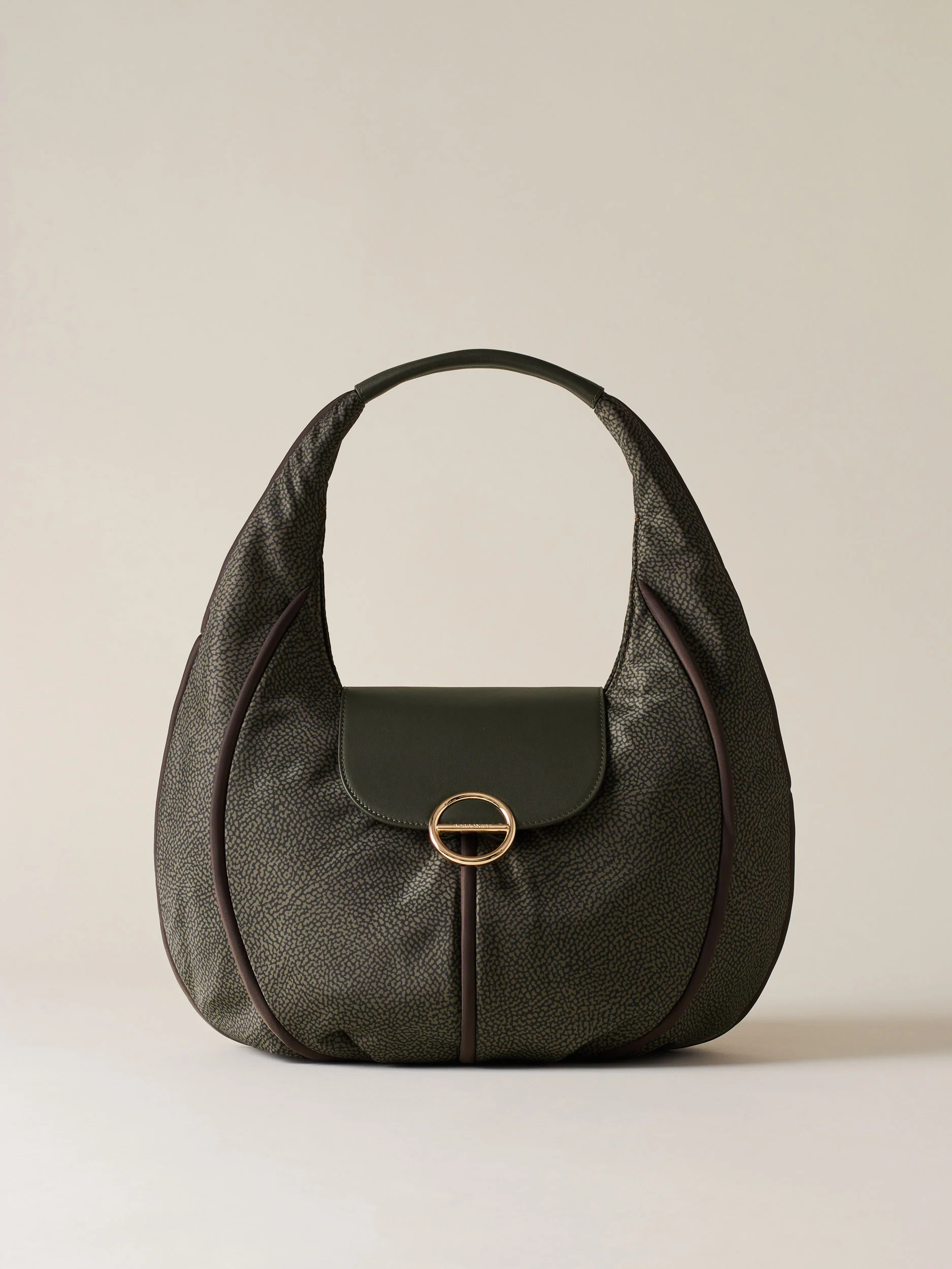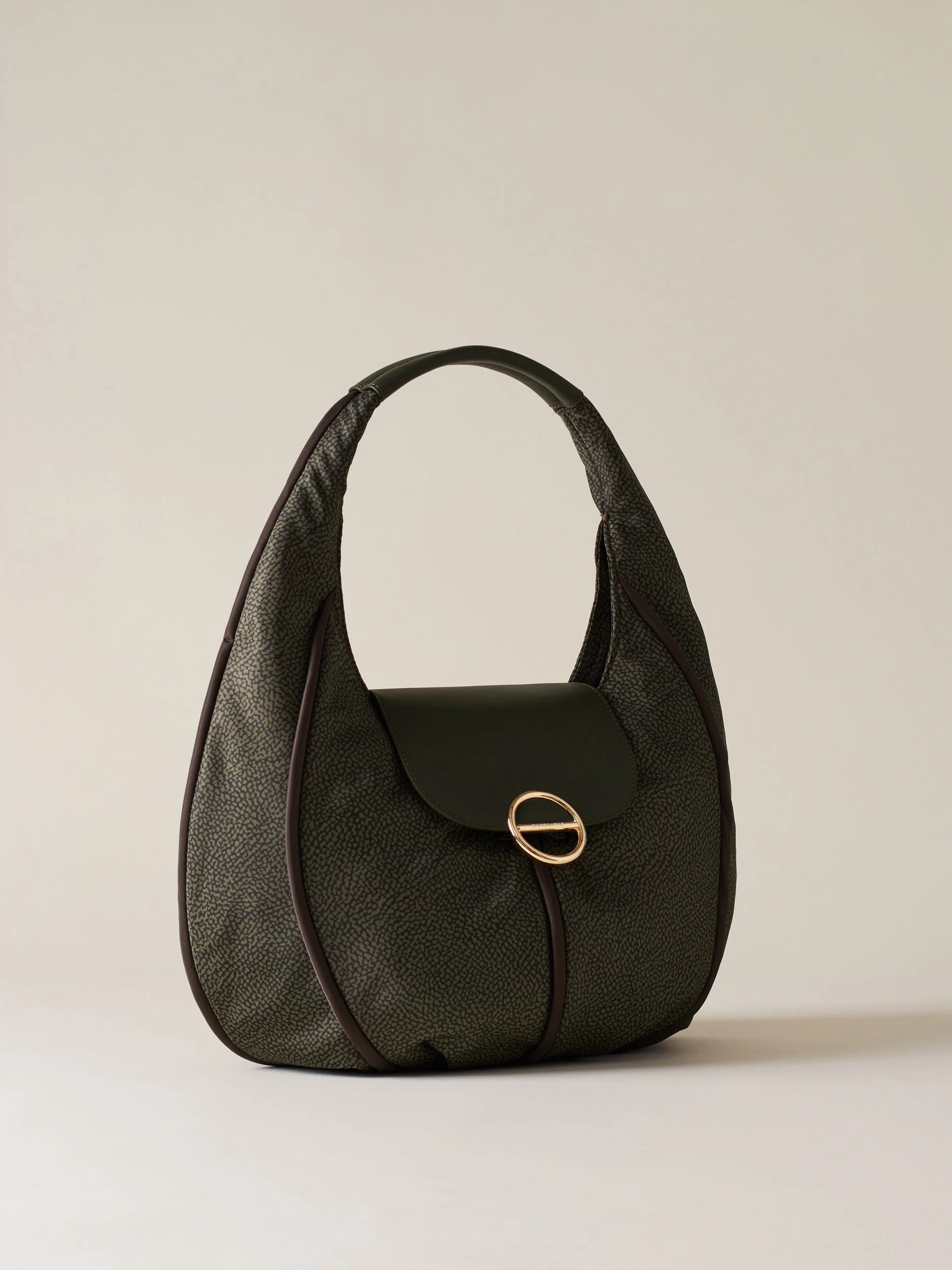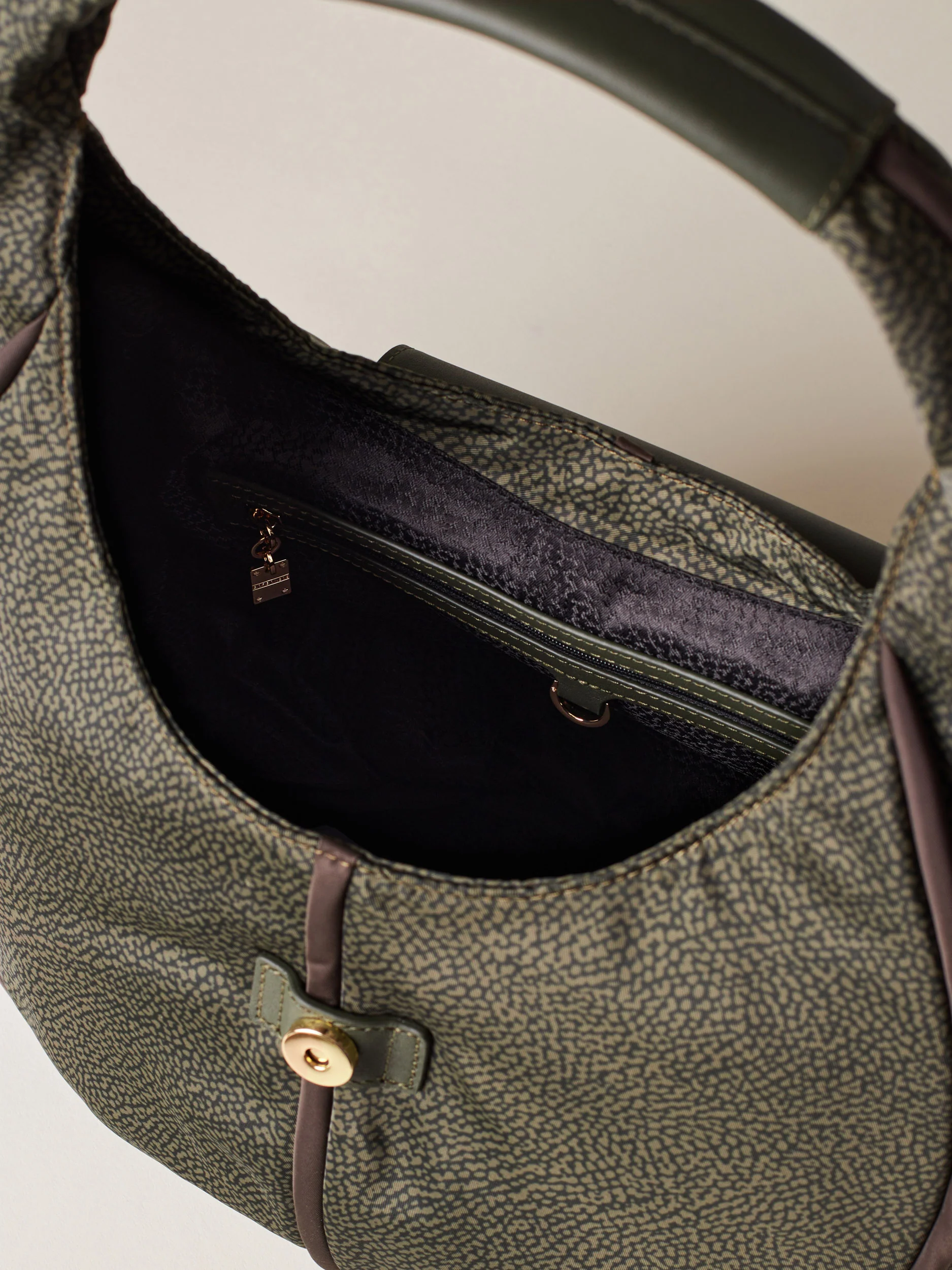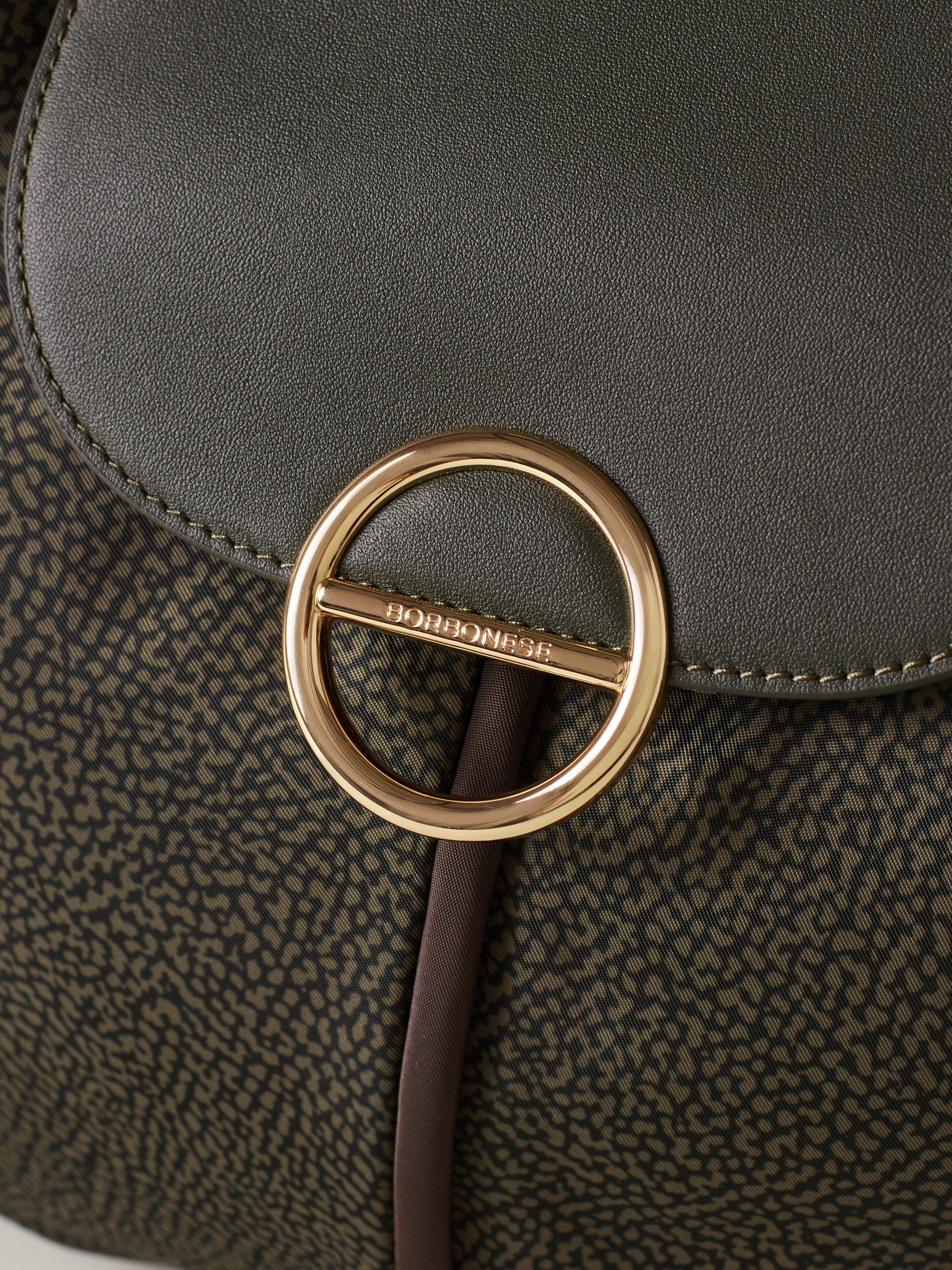 Tessuto riciclato stampa Op Dettagli in pelle e profili in nylon unito Fodera di tessuto jacquard riciclato Chiusura con patta con magnete Una tasca interna aperta Una tasca interna chiusa con zip nylon con tirazip piastrina logata Metallerie oro chiaro Misura medium