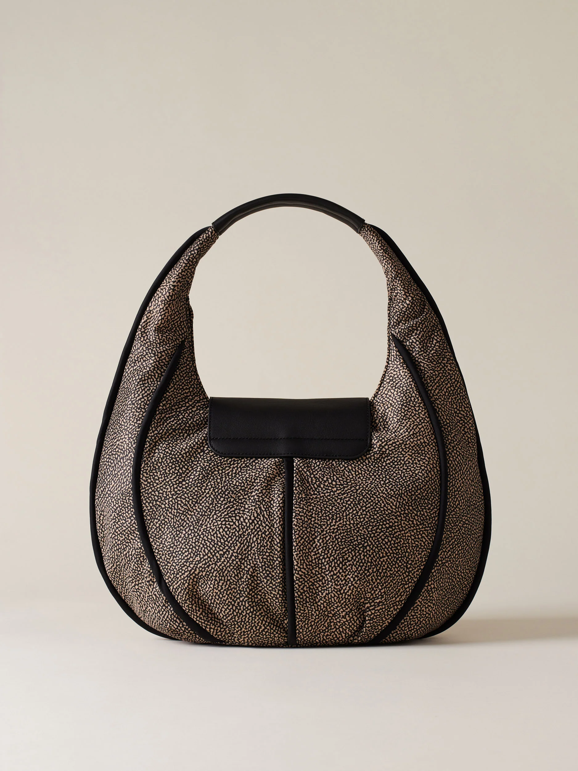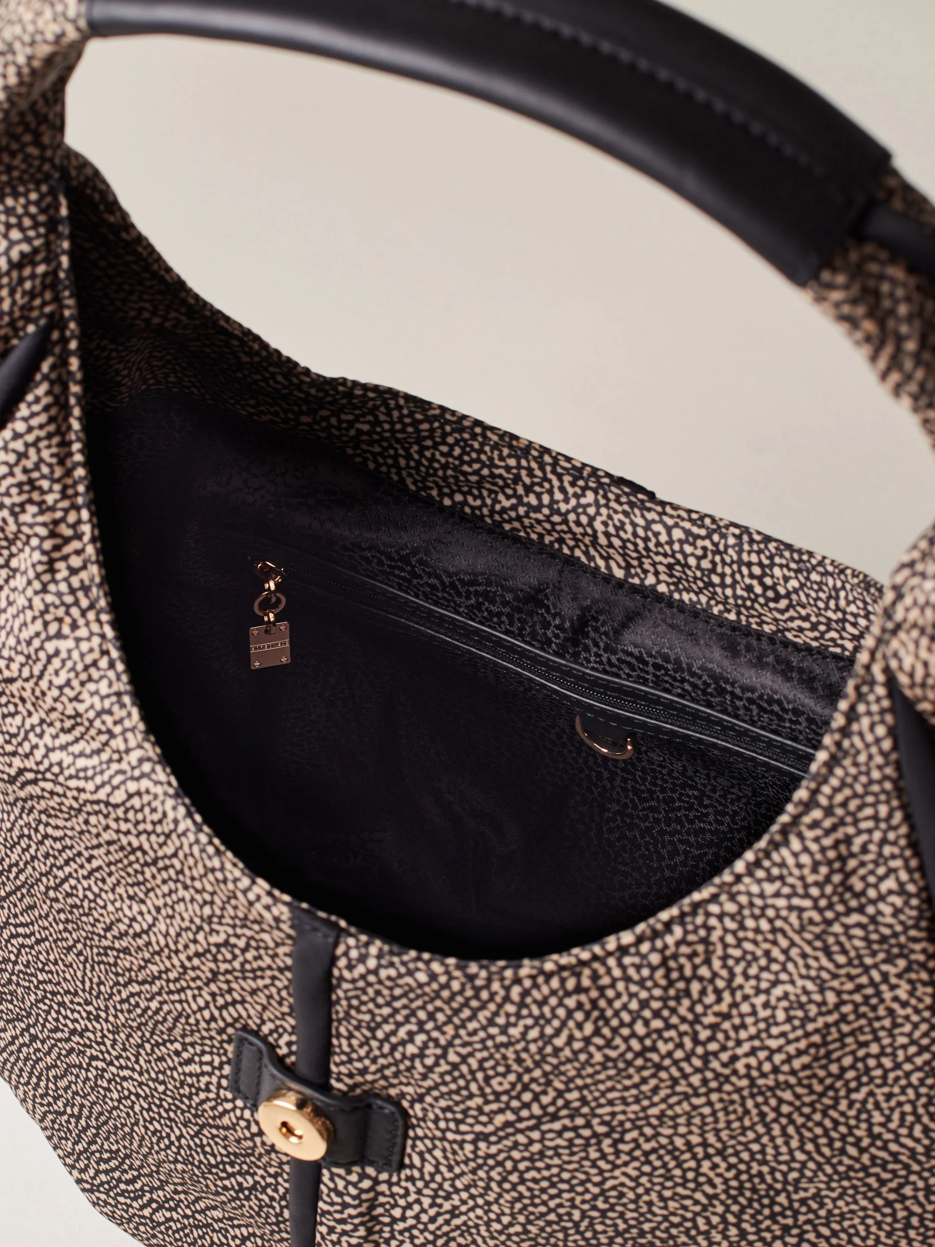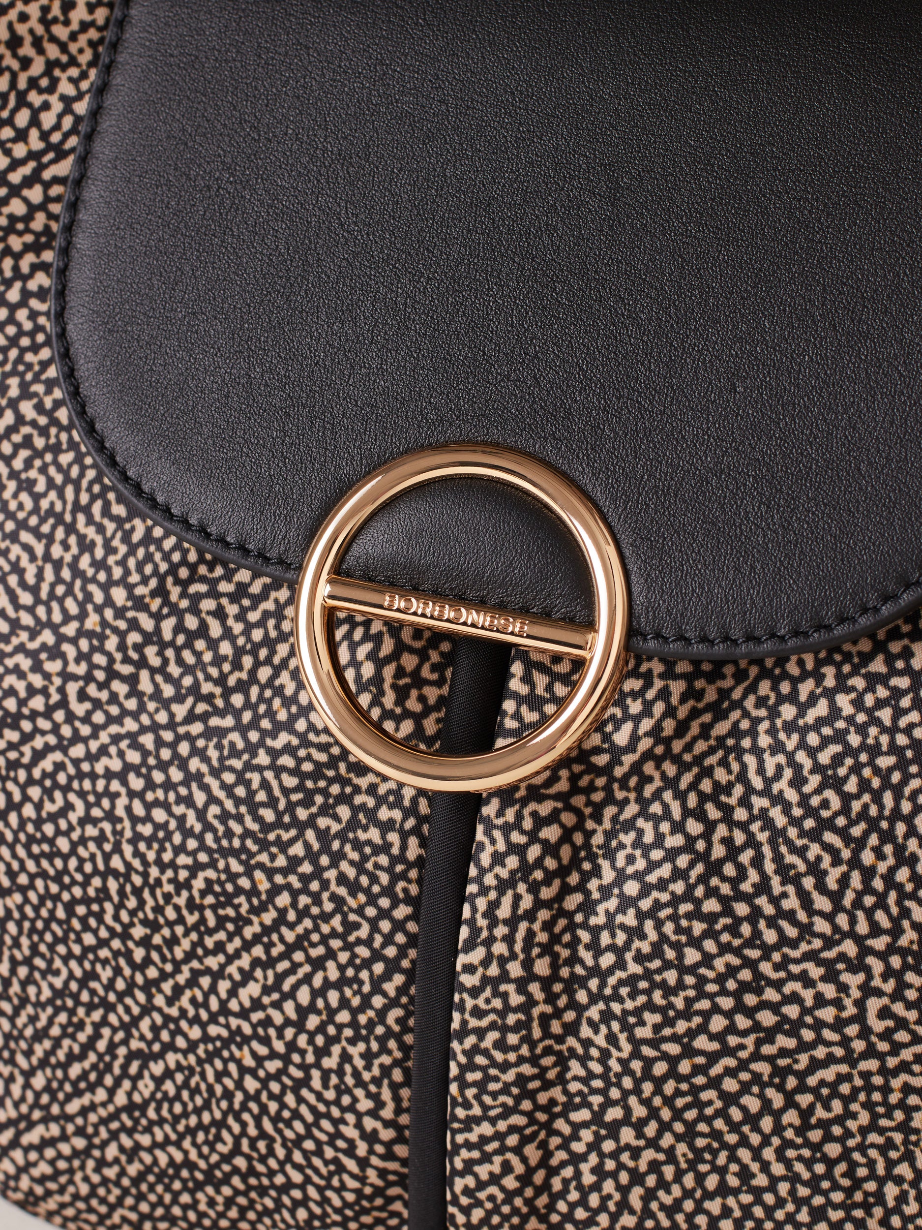 Tessuto riciclato stampa Op Dettagli in pelle e profili in nylon unito Fodera di tessuto jacquard riciclato Chiusura con patta con magnete Una tasca interna aperta Una tasca interna chiusa con zip nylon con tirazip piastrina logata Metallerie oro chiaro Misura medium