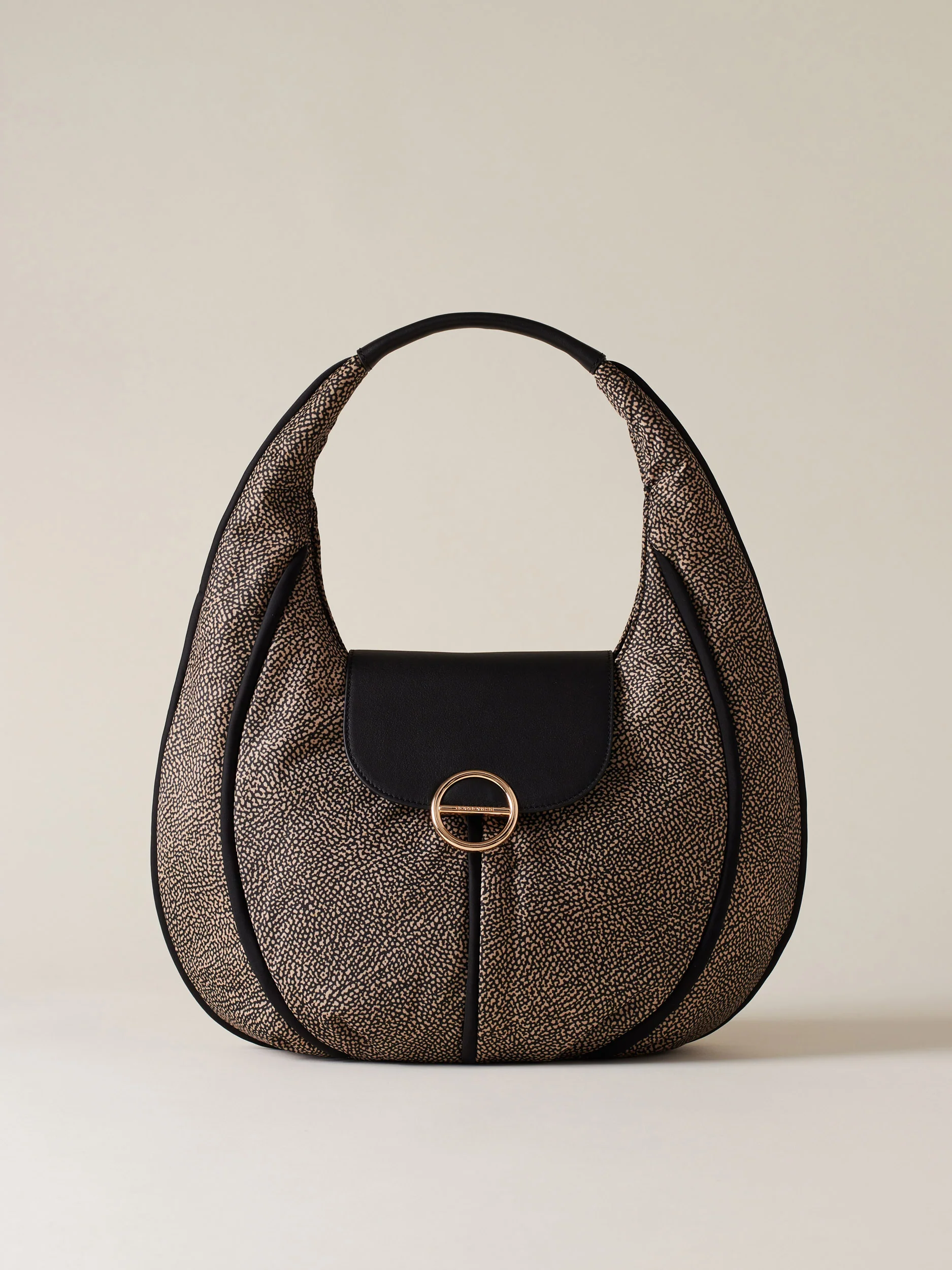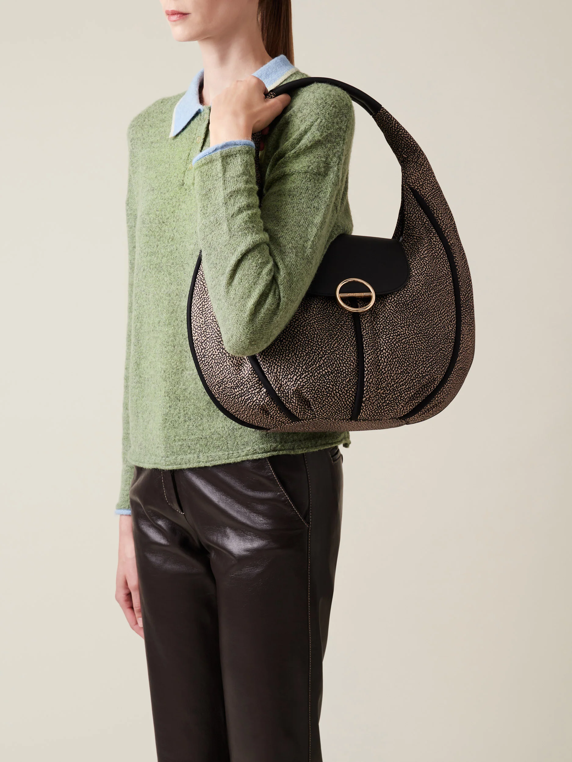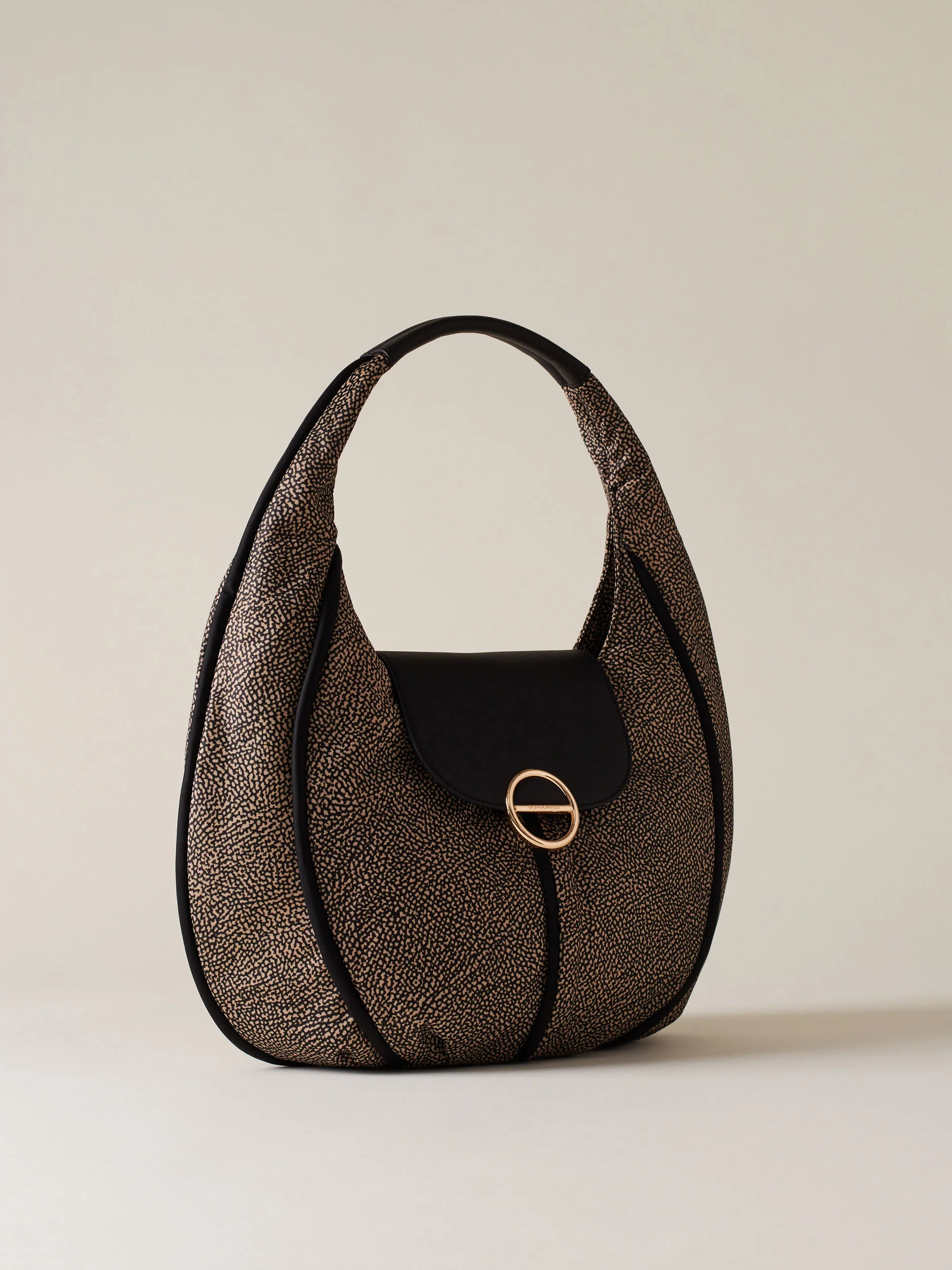 Tessuto riciclato stampa Op Dettagli in pelle e profili in nylon unito Fodera di tessuto jacquard riciclato Chiusura con patta con magnete Una tasca interna aperta Una tasca interna chiusa con zip nylon con tirazip piastrina logata Metallerie oro chiaro Misura medium