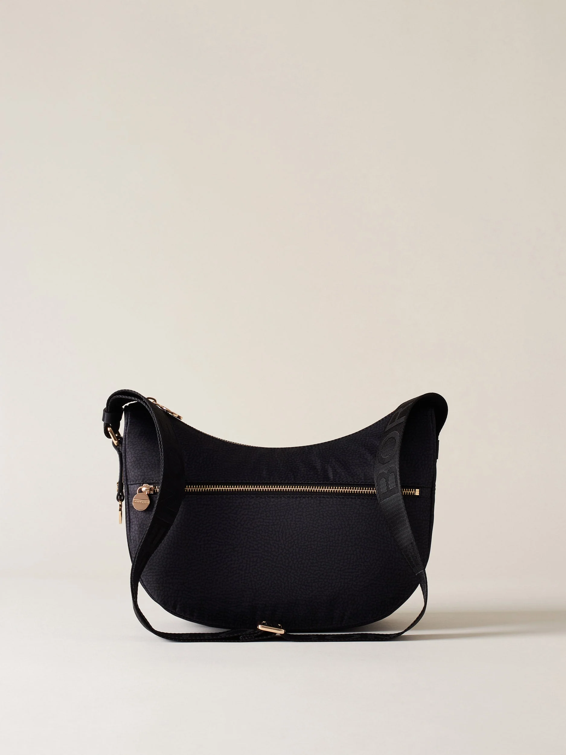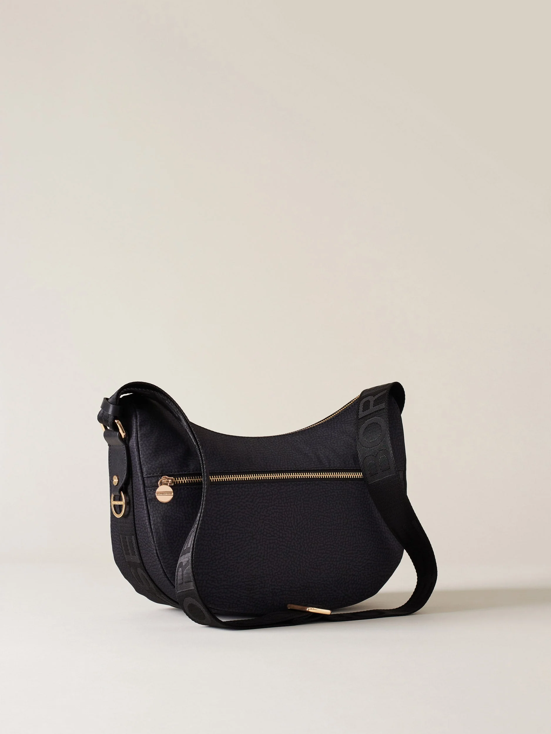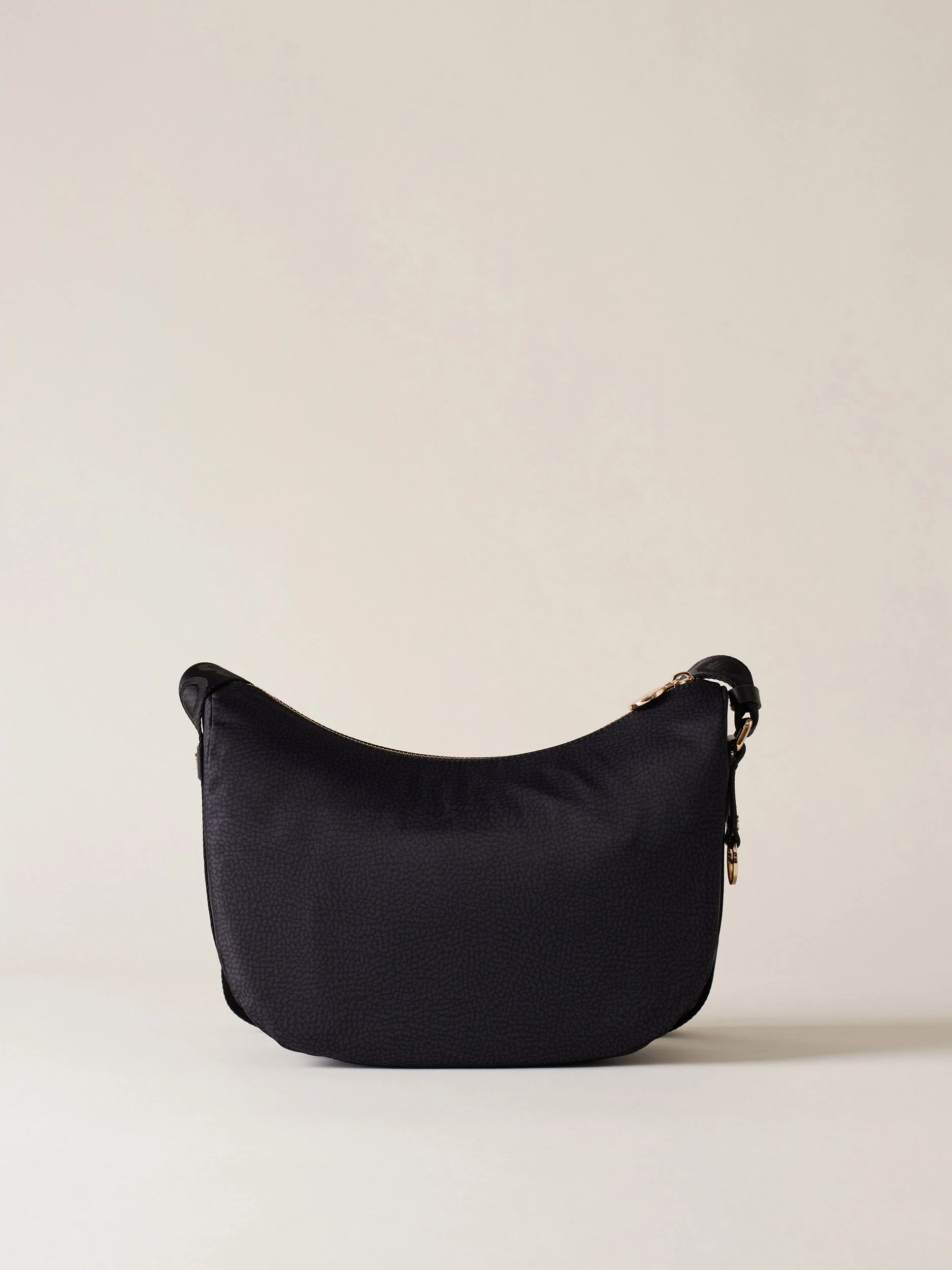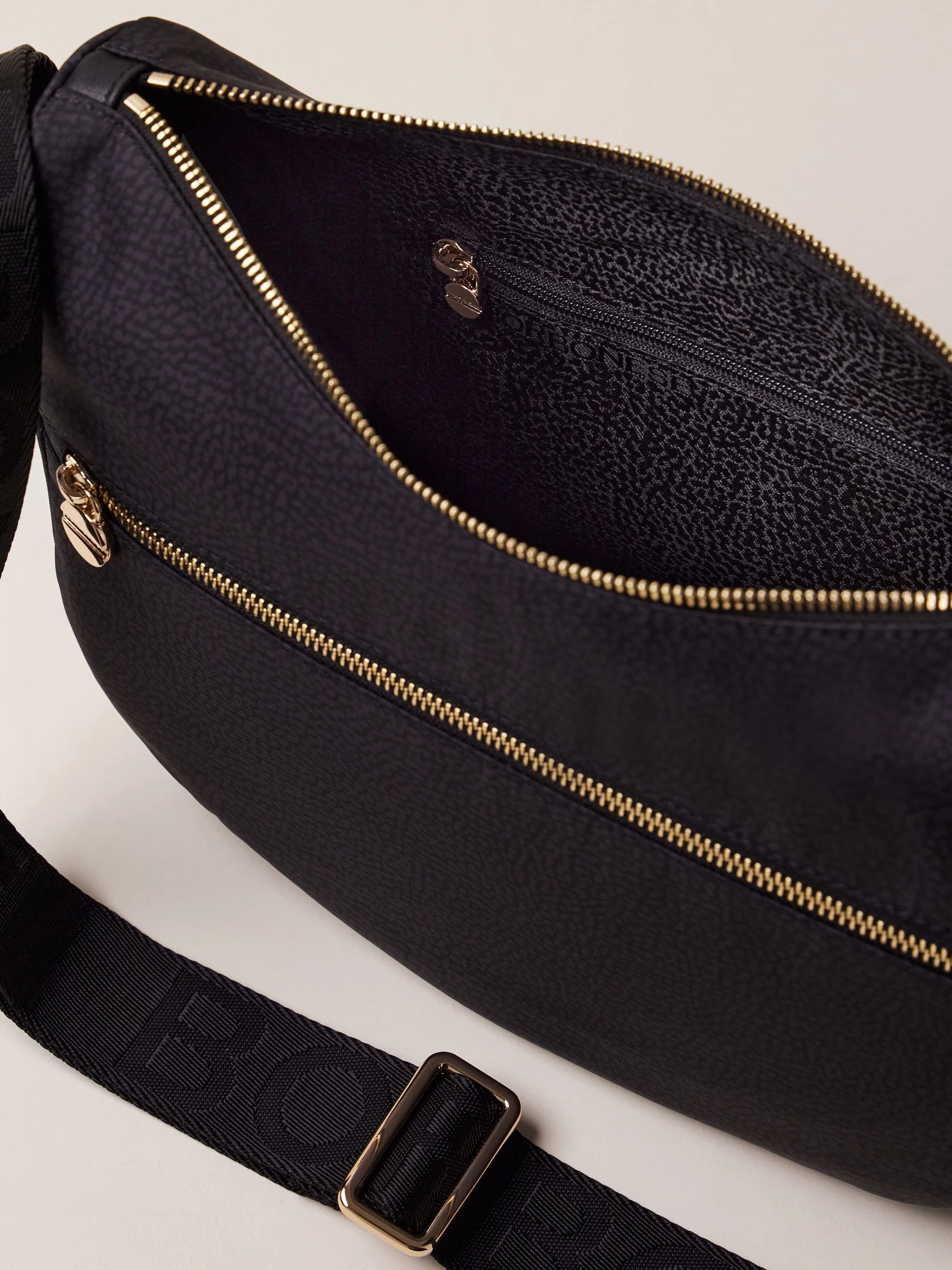 Tessuto riciclato stampa Op Dettagli di pelle Chiusura regolata da zip Tasca esterna con zip Tirazip a forma di vite, simbolo del brand Tracolla regolabile di nastro logato Interno foderato Tre tasche interne di cui una con zip Metallerie oro chiaro Misure tracolla: Min 35 cm Max 67 cm Misura small