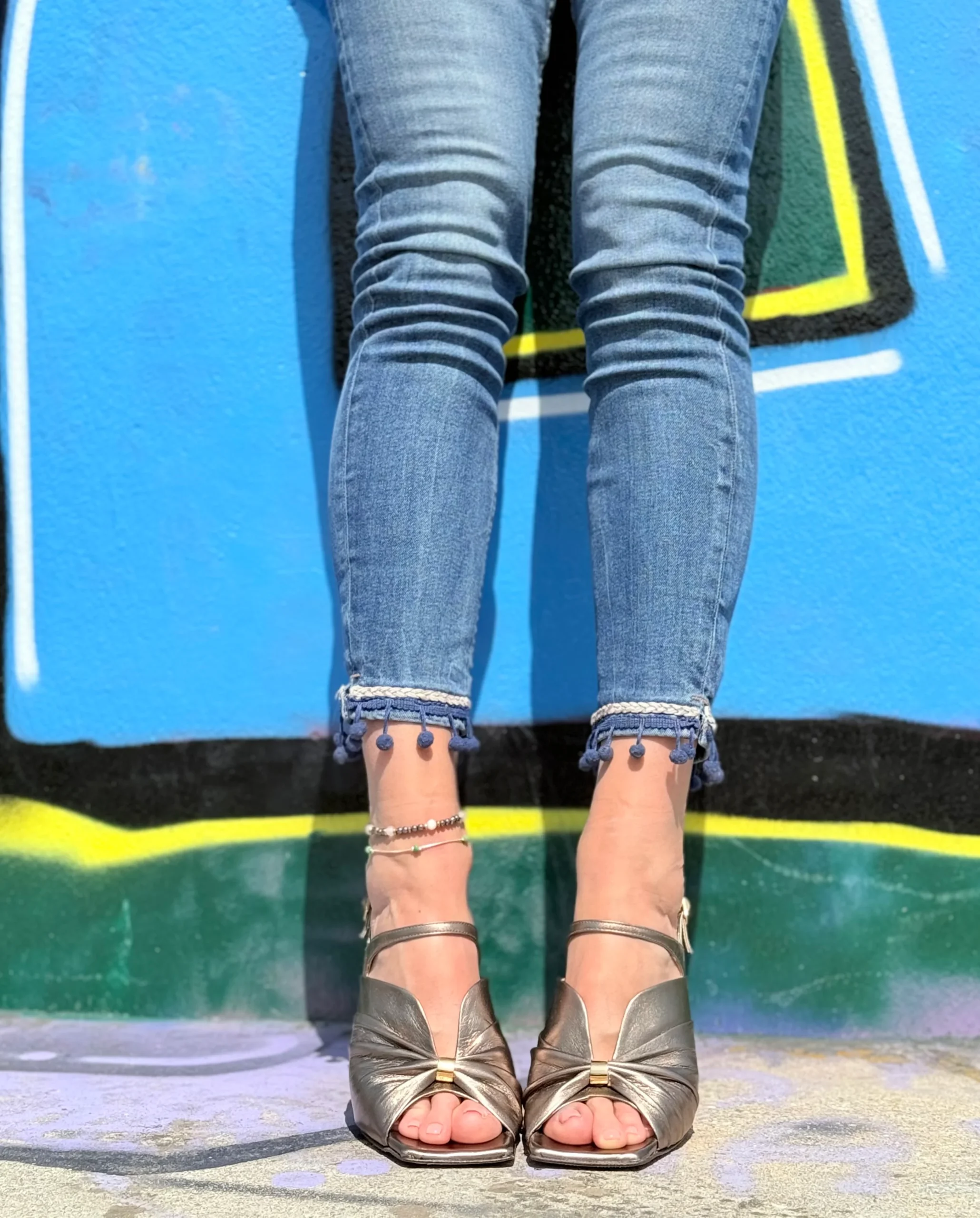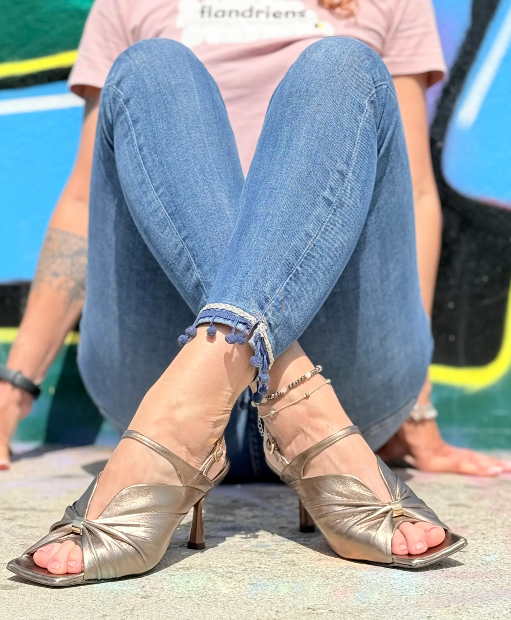 Un sandalo dal fascino delicato, in nappa laminata bronzo, con punta squadrata e tacco slanciato da 8 cm che valorizza la silhouette senza rinunciare al comfort.