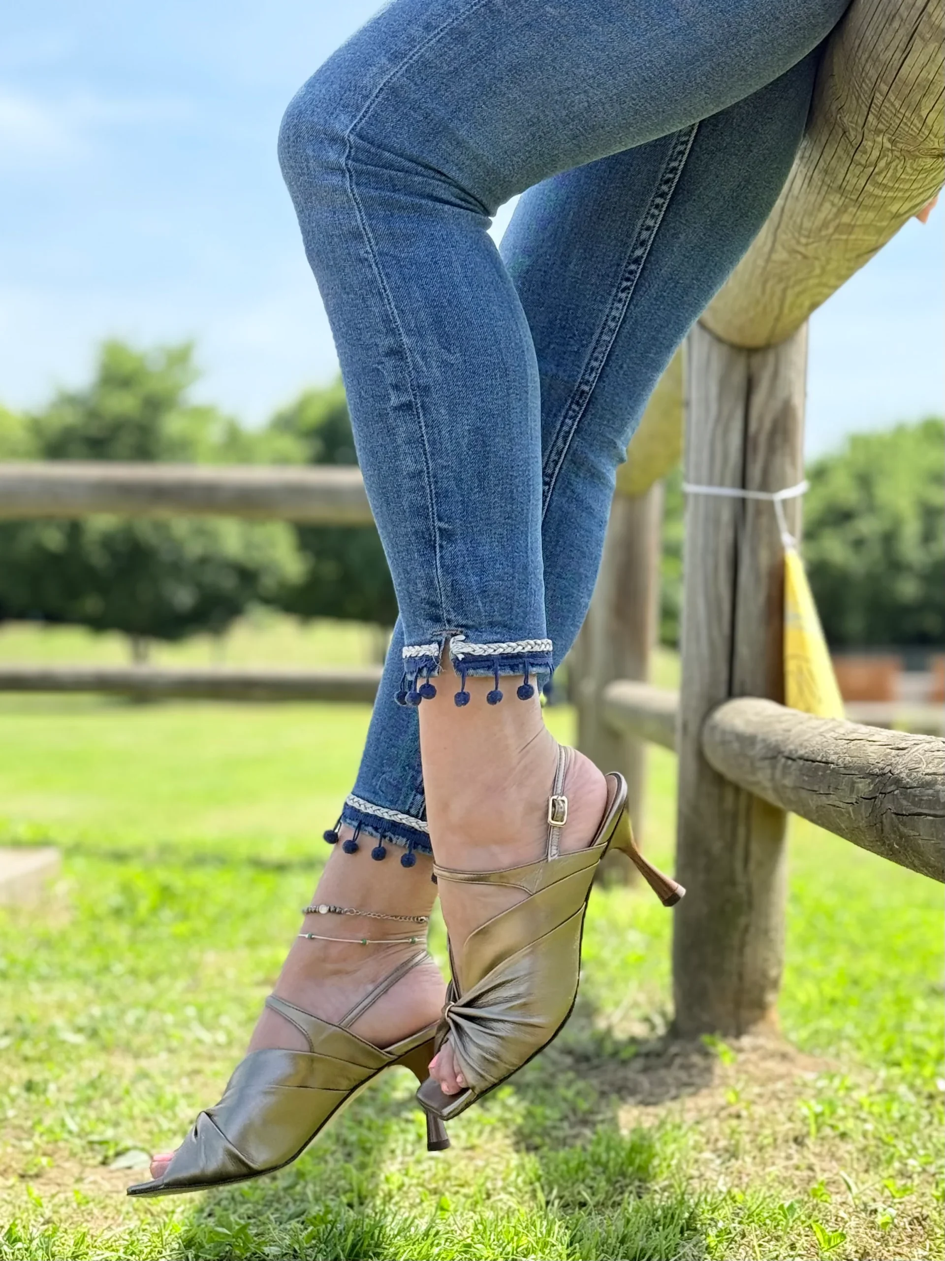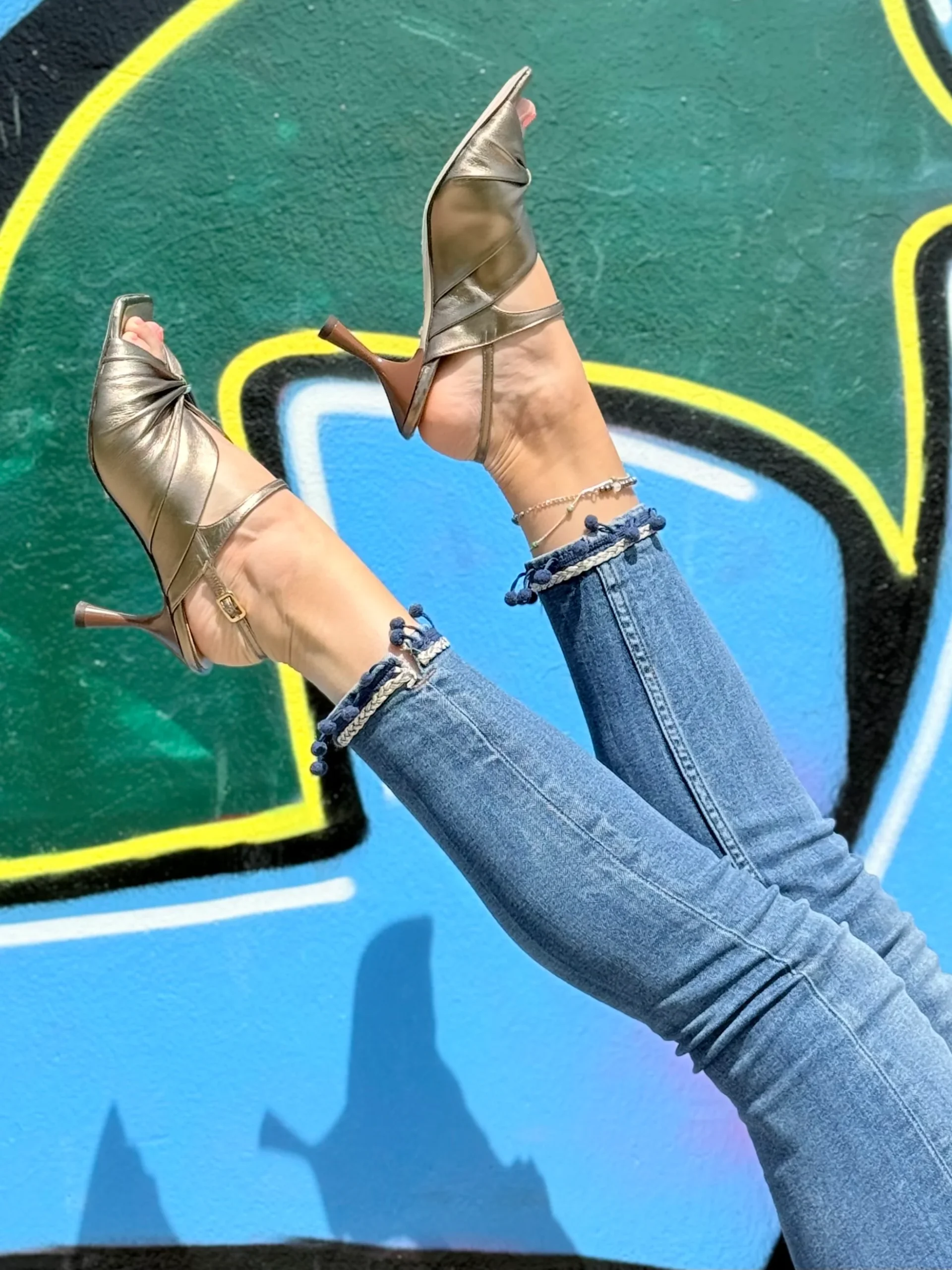 Un sandalo dal fascino delicato, in nappa laminata bronzo, con punta squadrata e tacco slanciato da 8 cm che valorizza la silhouette senza rinunciare al comfort. L’arricciatura in morbida pelle sembra disegnare un fiocco, fermato da un dettaglio color oro: un tocco prezioso, discreto e femminile. Il cinturino sul tallone e la fascetta sul collo […]