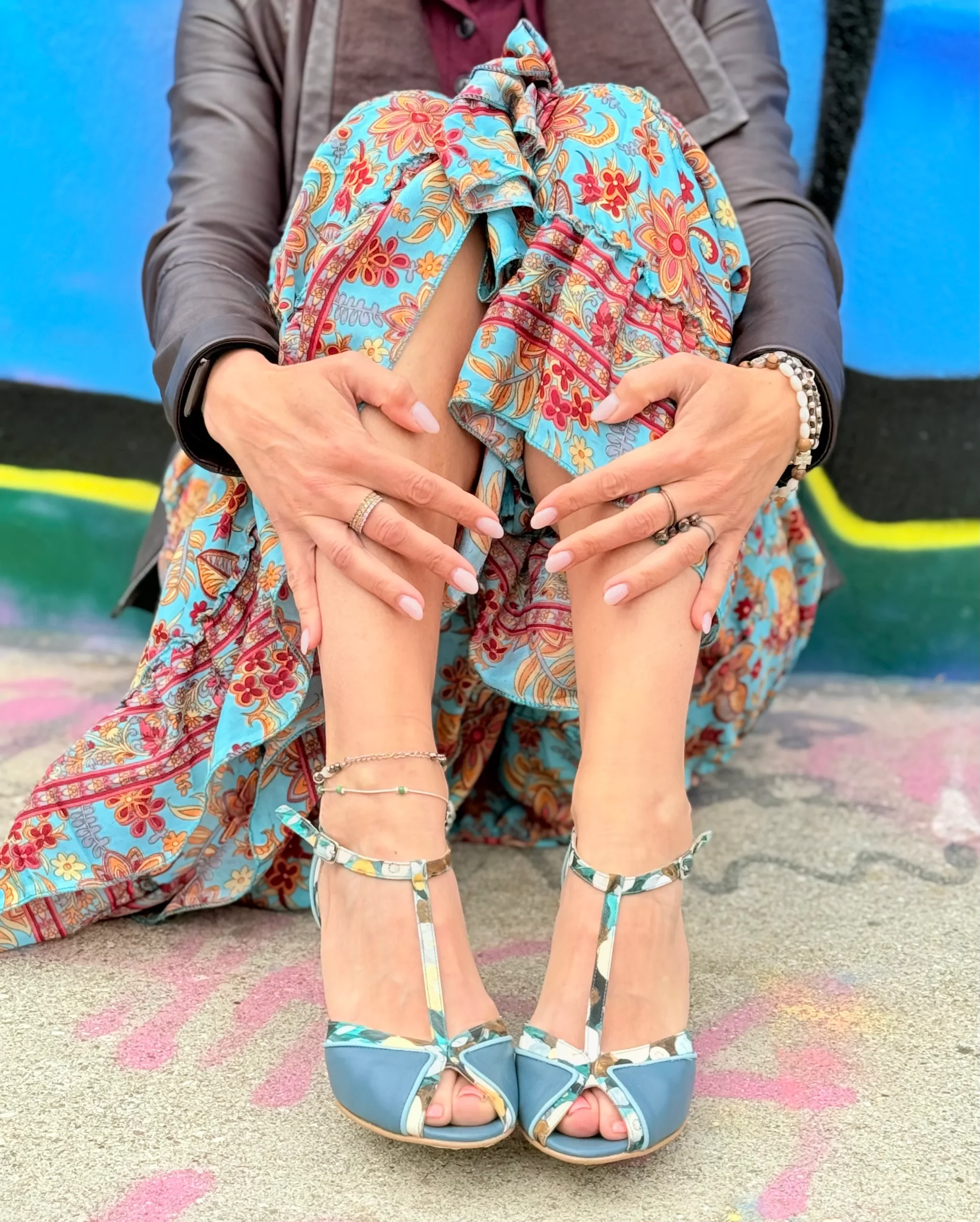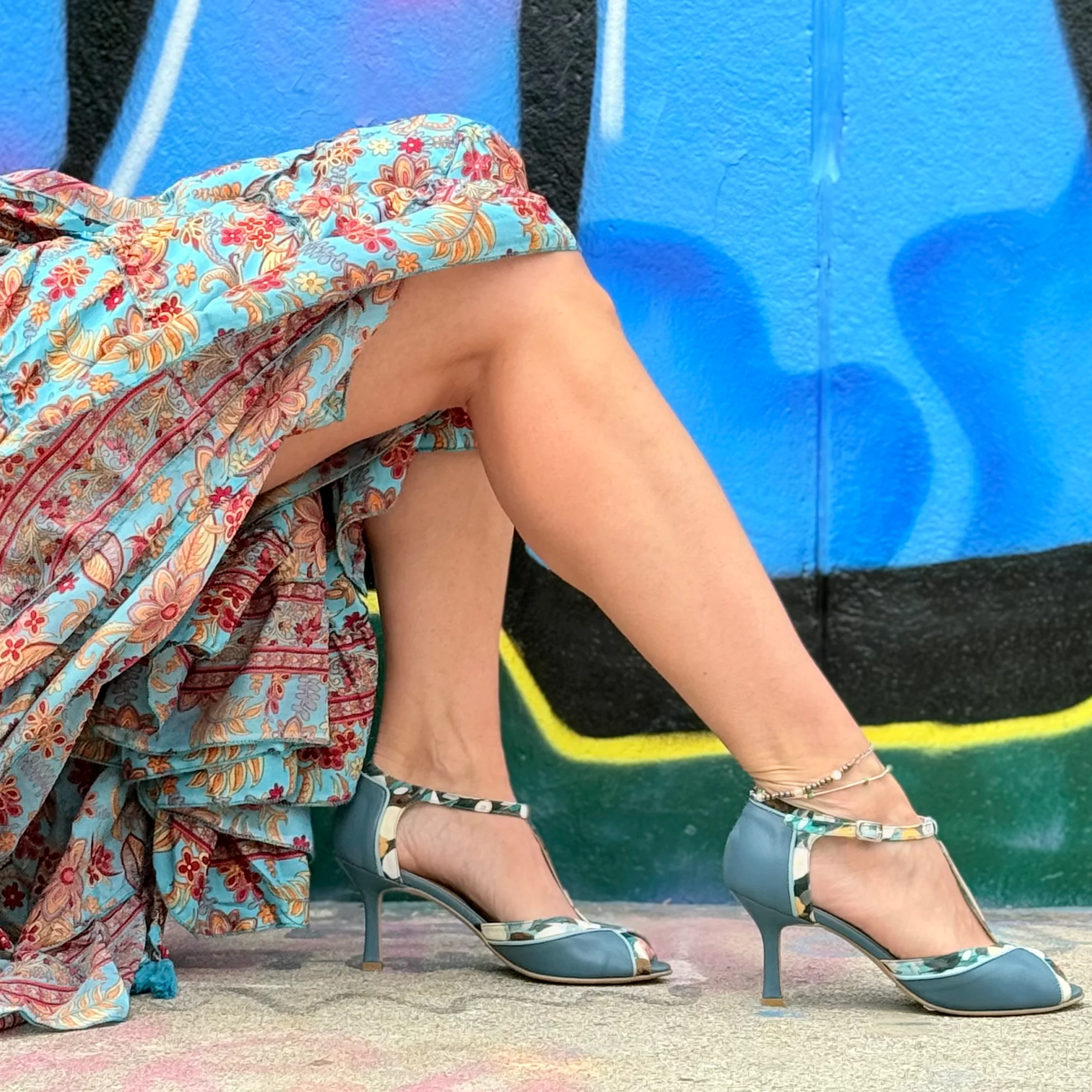 La Nostra tanghera per eccellenza è qui rifinita in una nappa blue ottanio e il profilo piccolo in stampa floreale sugli stessi toni.