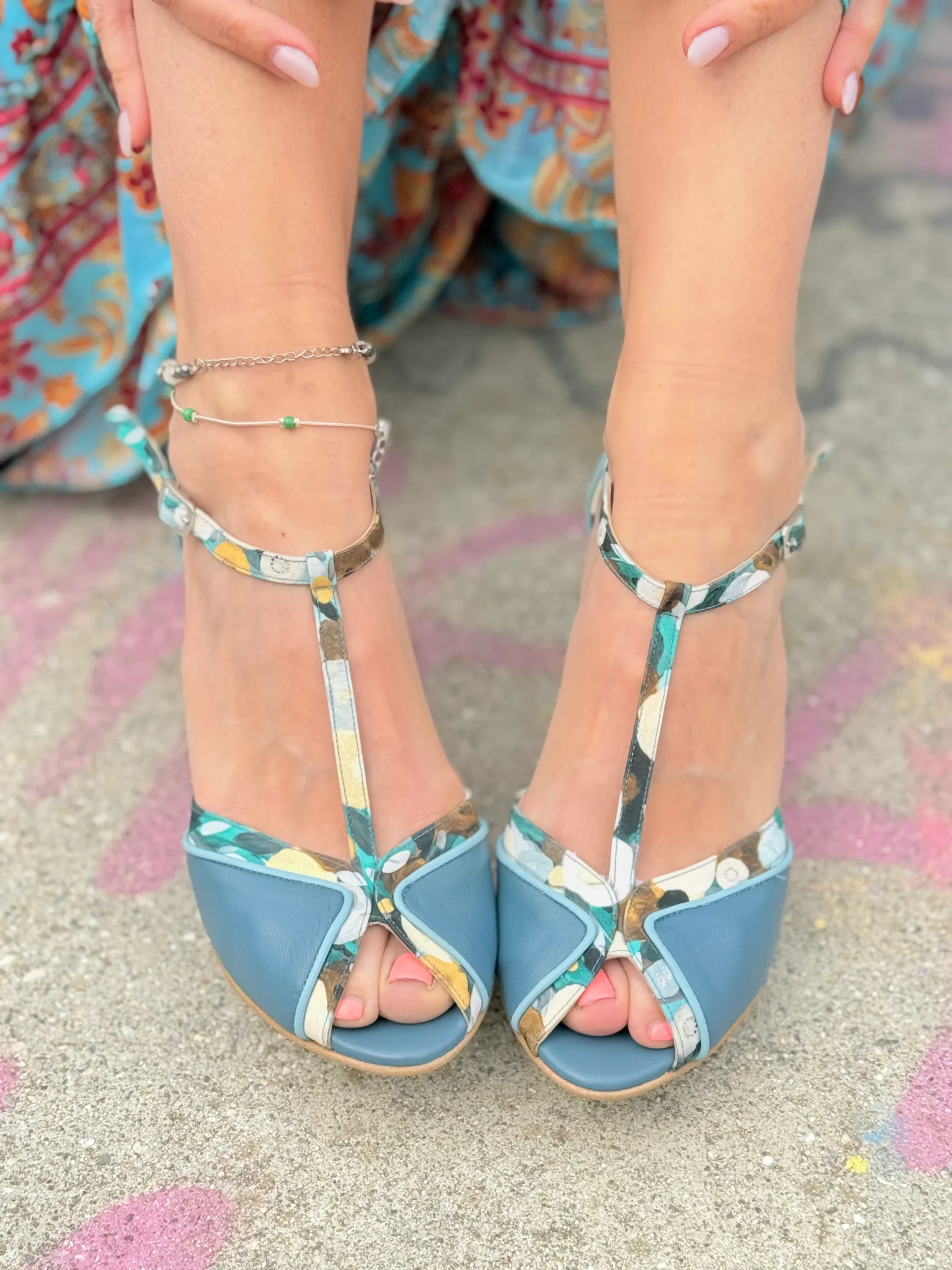 Lanai Blue sandalo t bar in nappa blue e profilo stampa floreale con tacco 7 cm artigianale marchigiano