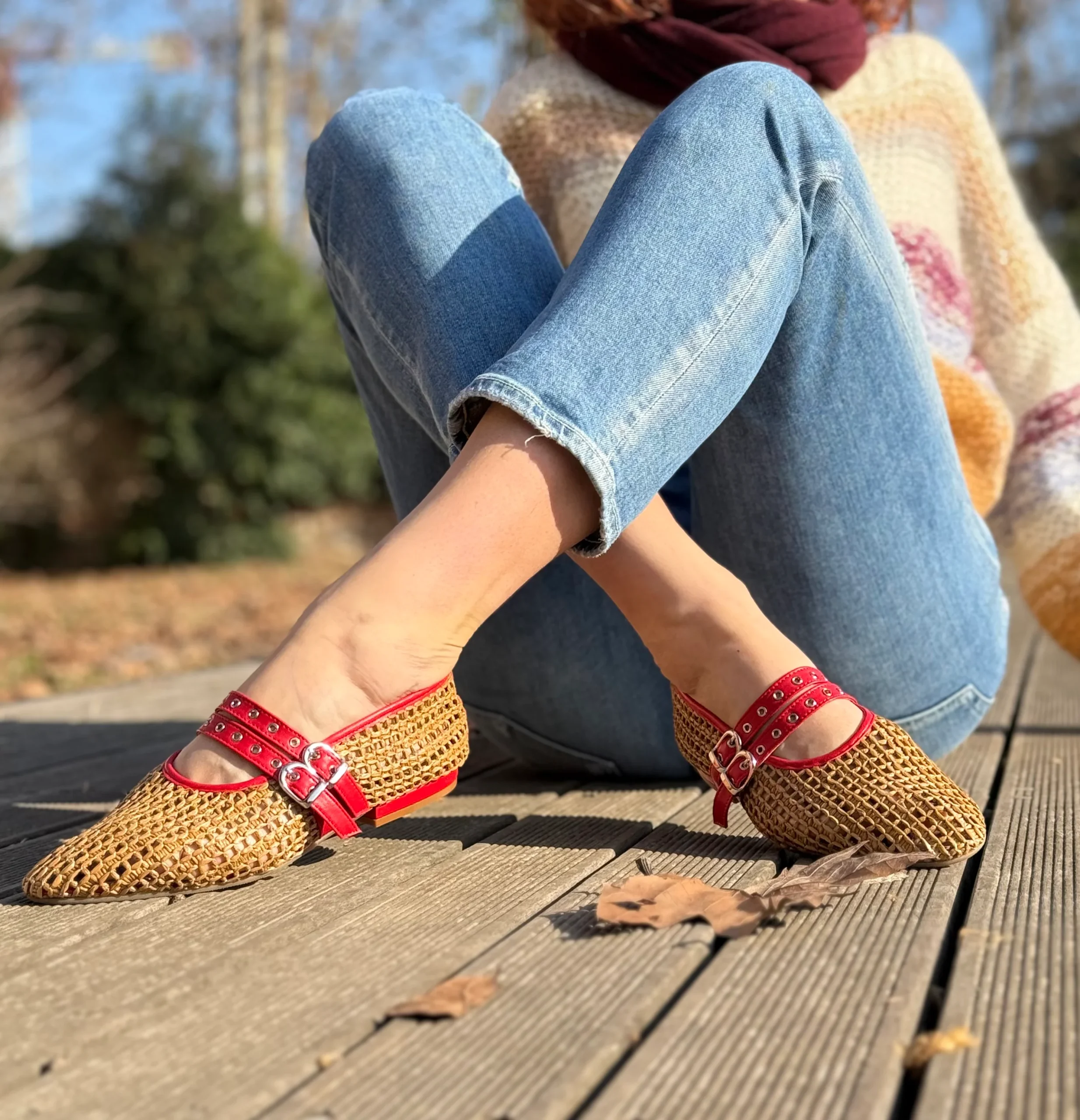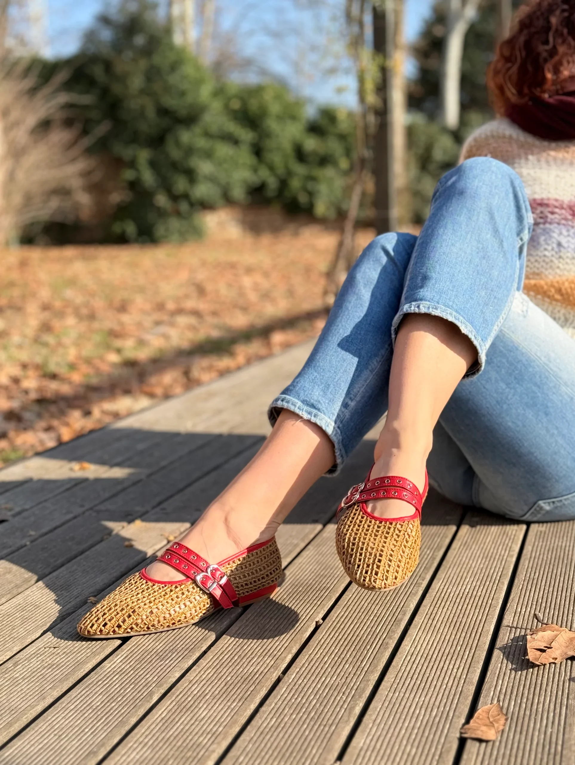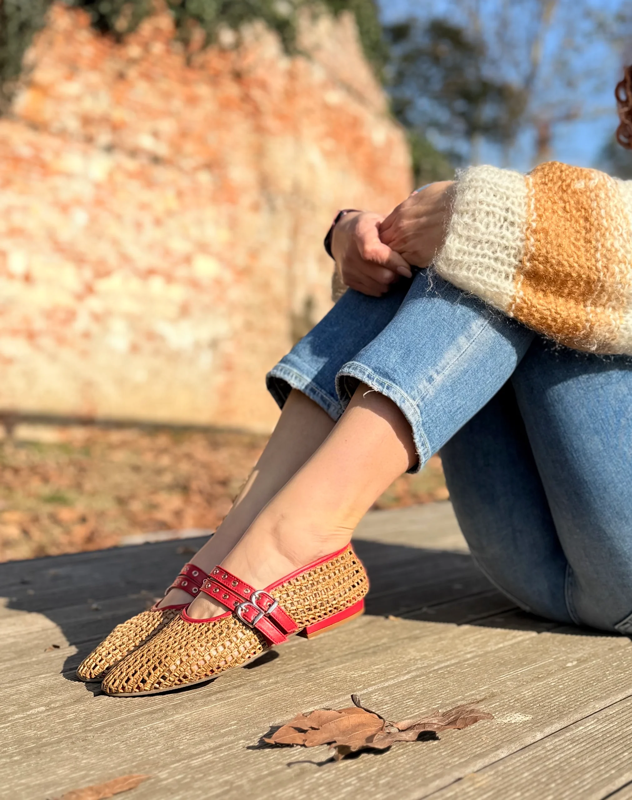Mistero Red scarpina bassa in rafia noce tacco 1 artigianale toscana