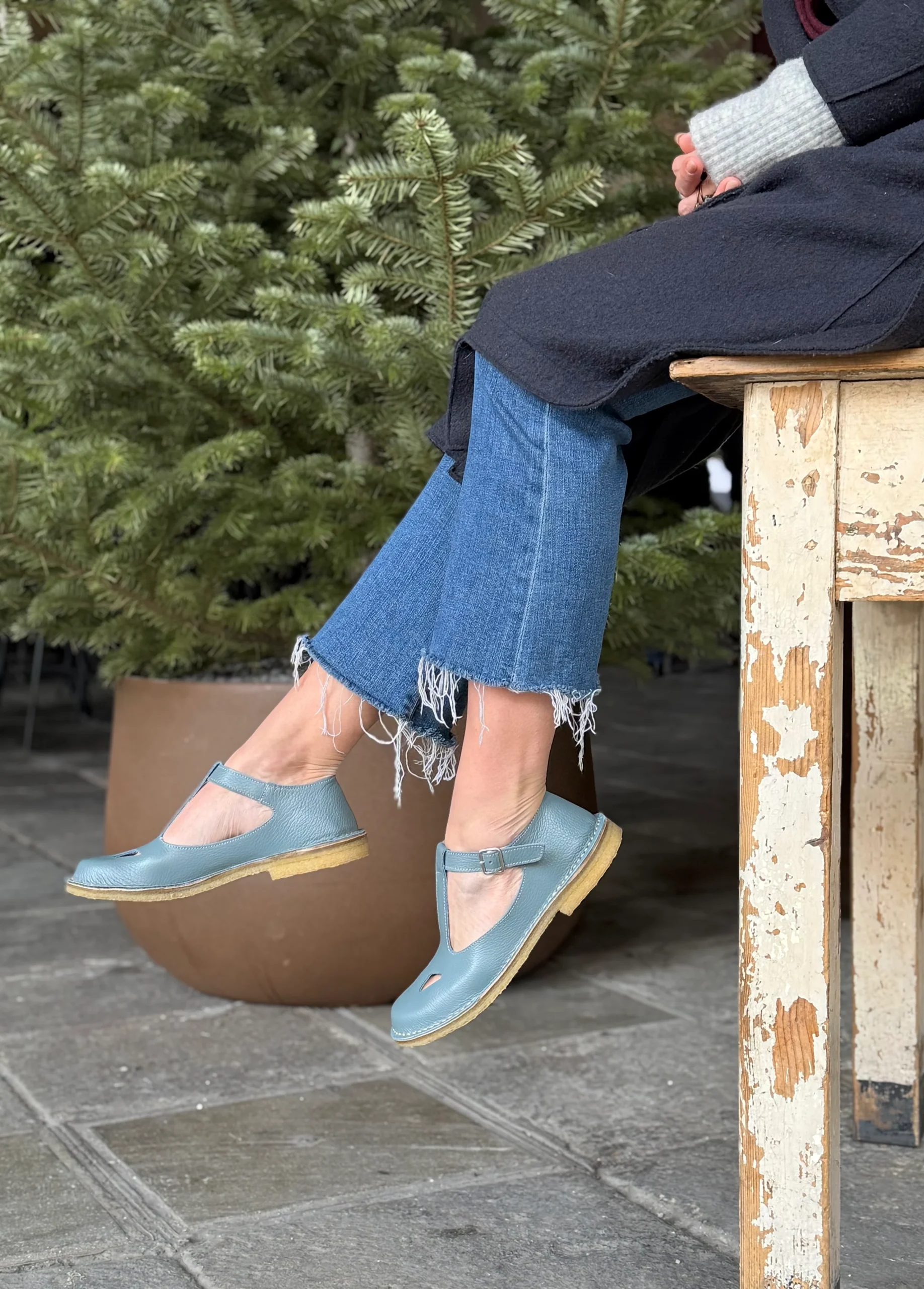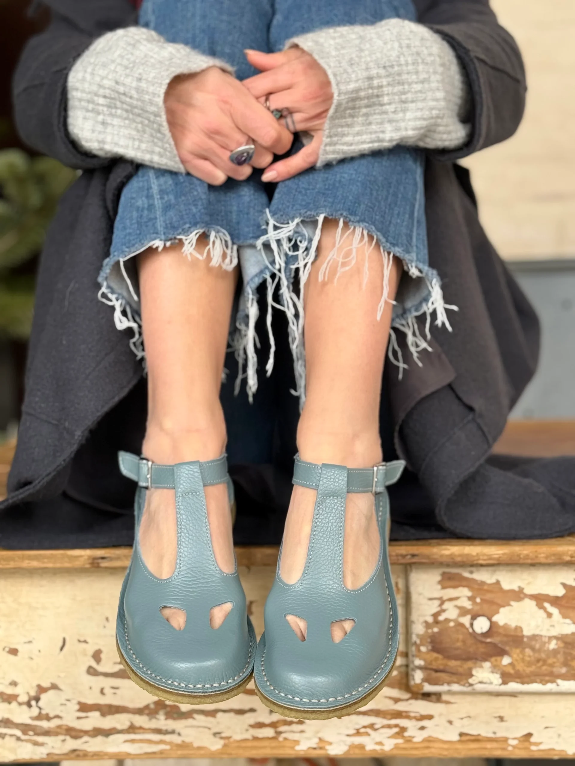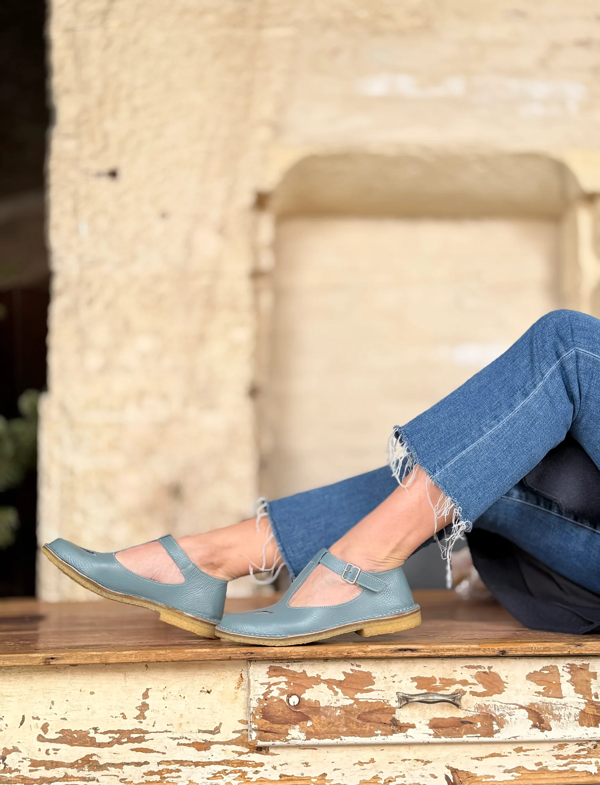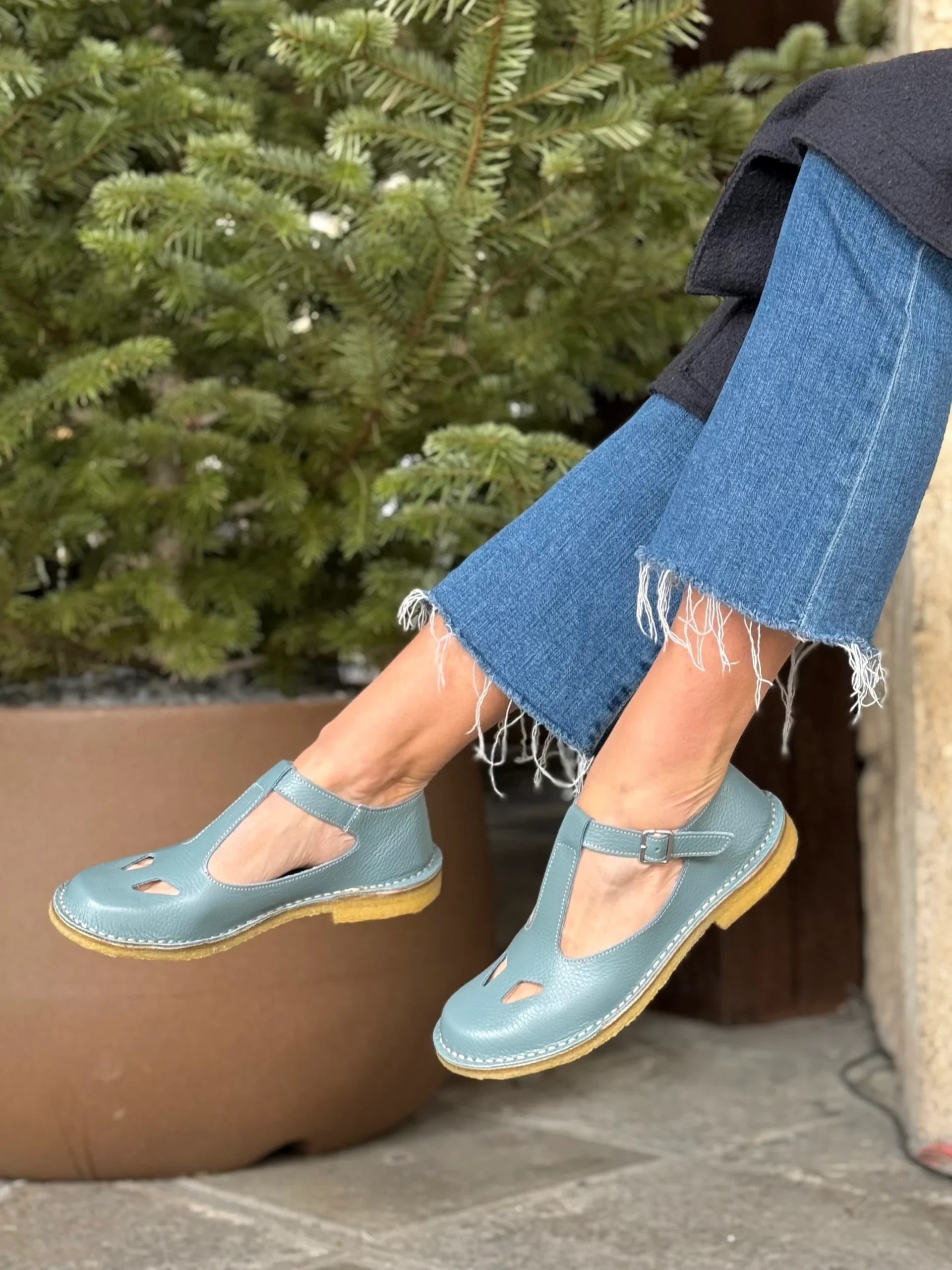 Paturnia Polvere bebe con occhietti in pelle azzurro chiaro artigianale toscana