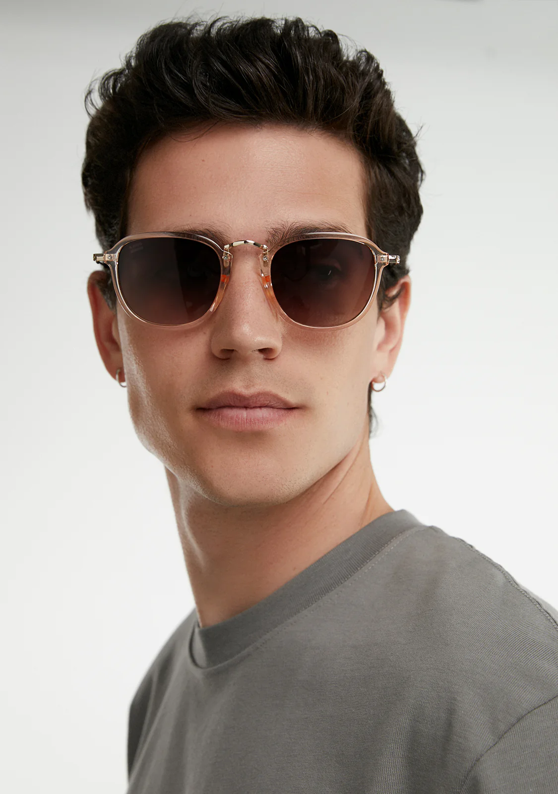 Le lenti in policarbonato presentano una tonalità marrone affumicata su una silhouette quadrata color champagne. Presenta i dettagli distintivi del nostro marchio: il logo inciso su entrambe le tempie in metallo e il nostro emblema sulla lente destra. Con una larghezza della lente di 53,5 mm e una montatura frontale di 147 mm, questi occhiali valorizzano qualsiasi viso. Le tempie laterali sono realizzate in acciaio inossidabile e hanno una lunghezza di 145 mm.