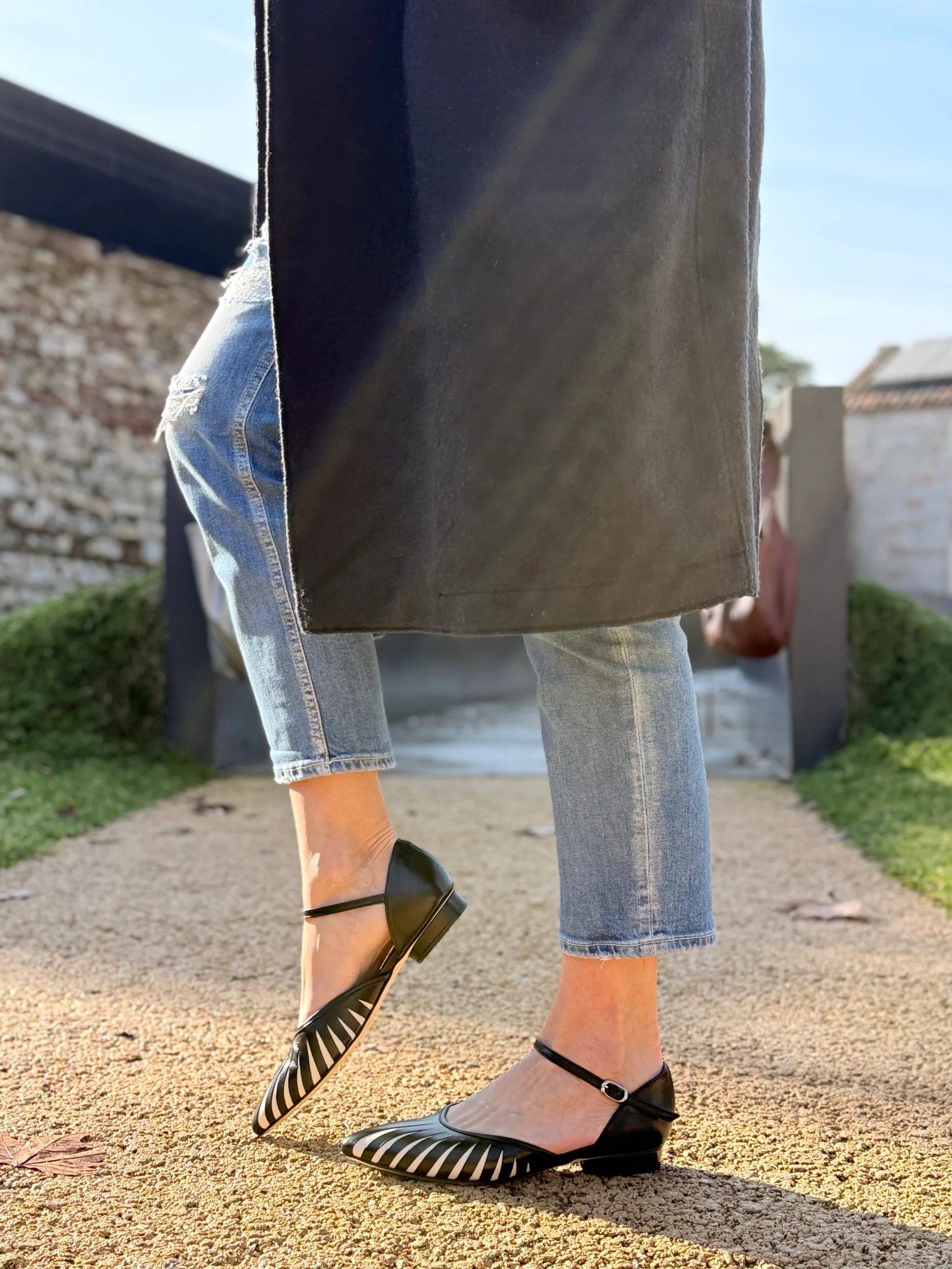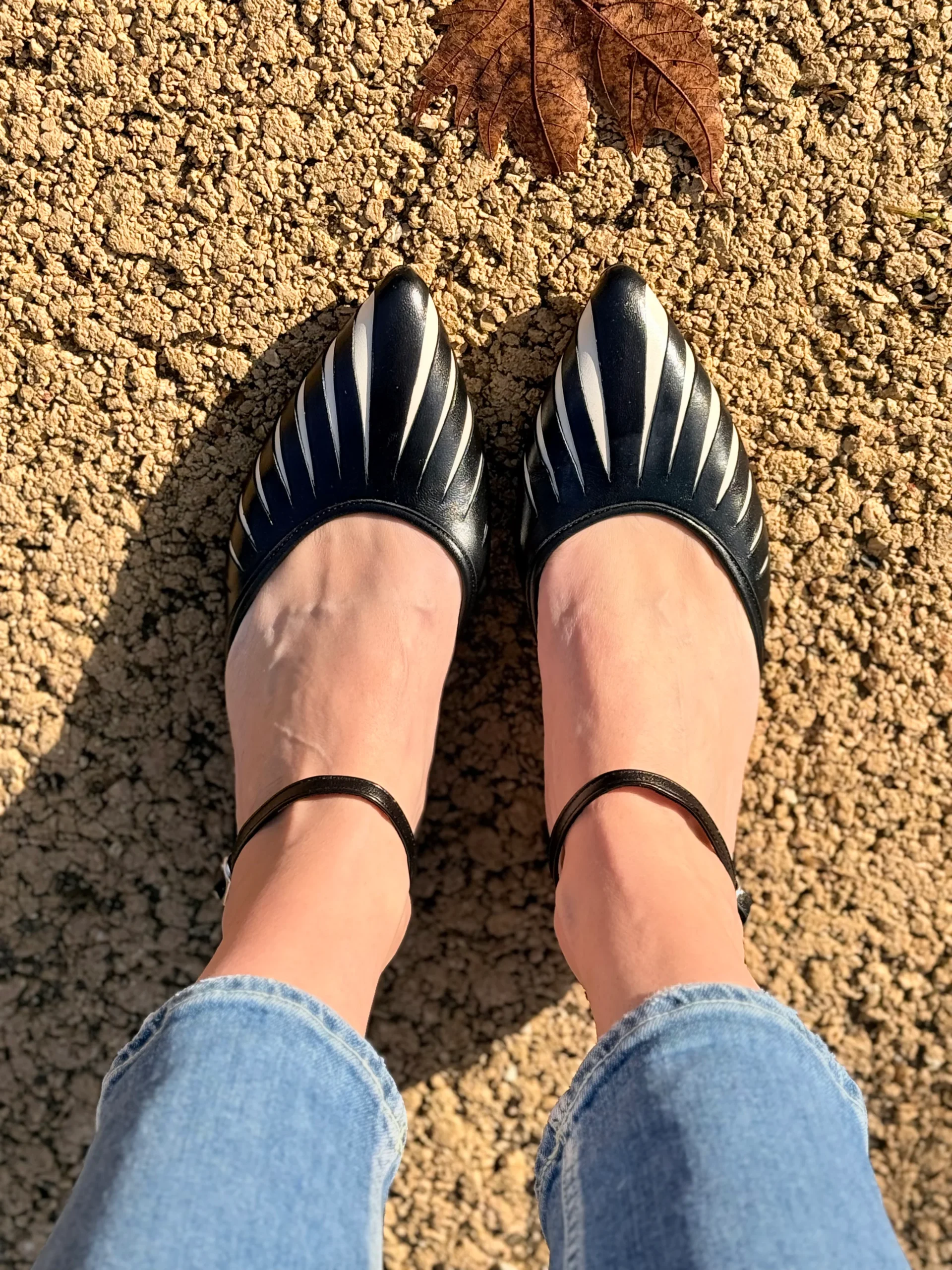 Realizzata in morbida nappa nera e avorio, si distingue per la sua costruzione artigianale: la tomaia avorio avvolge delicatamente il piede, mentre la mascherina fustellata nera, sapientemente cucita, crea un raffinato contrasto cromatico.