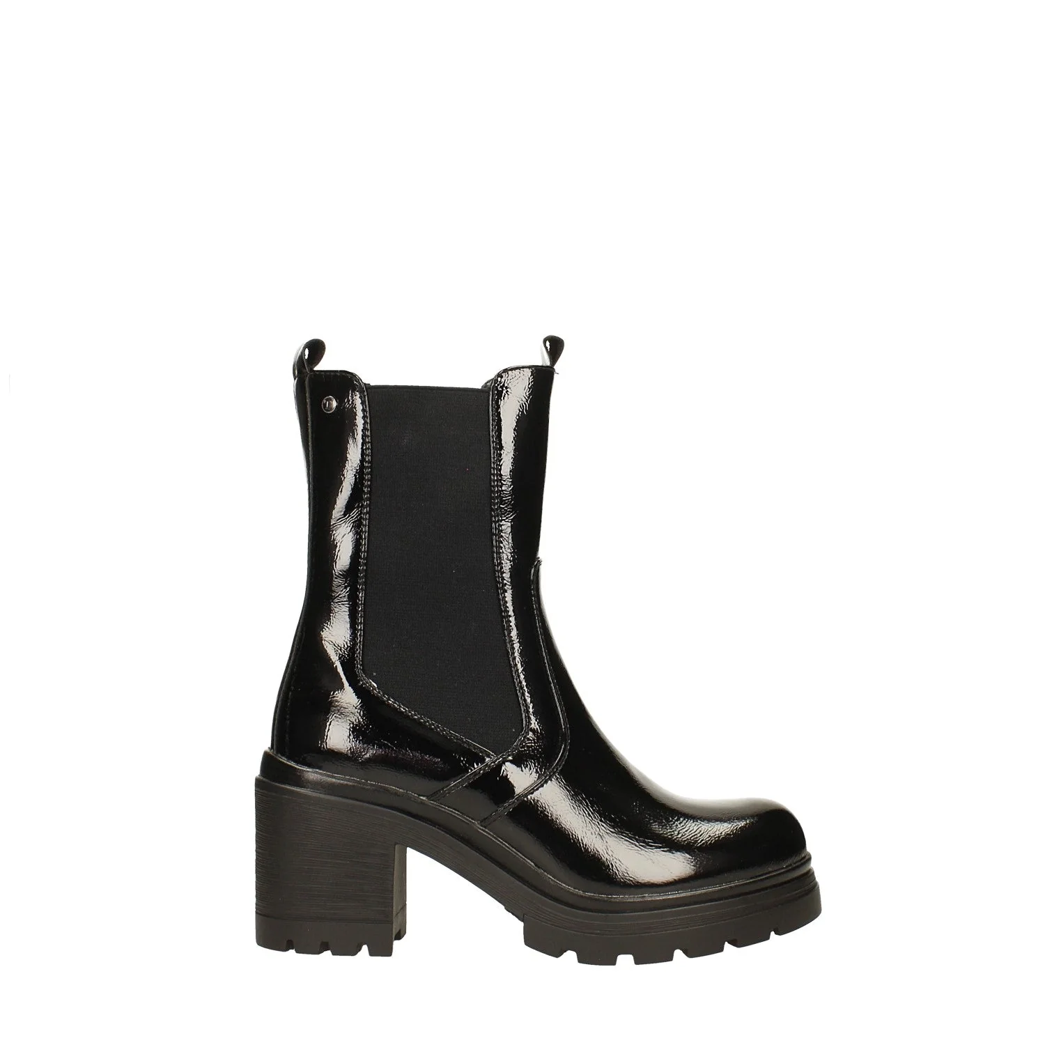 Stivaletti in vernice.Doppia fascia elastica laterale.Suola in gomma tassellata Altezza gambale: 18cmCirconferenza gambale: 28cm Altezza tacco: 7cm