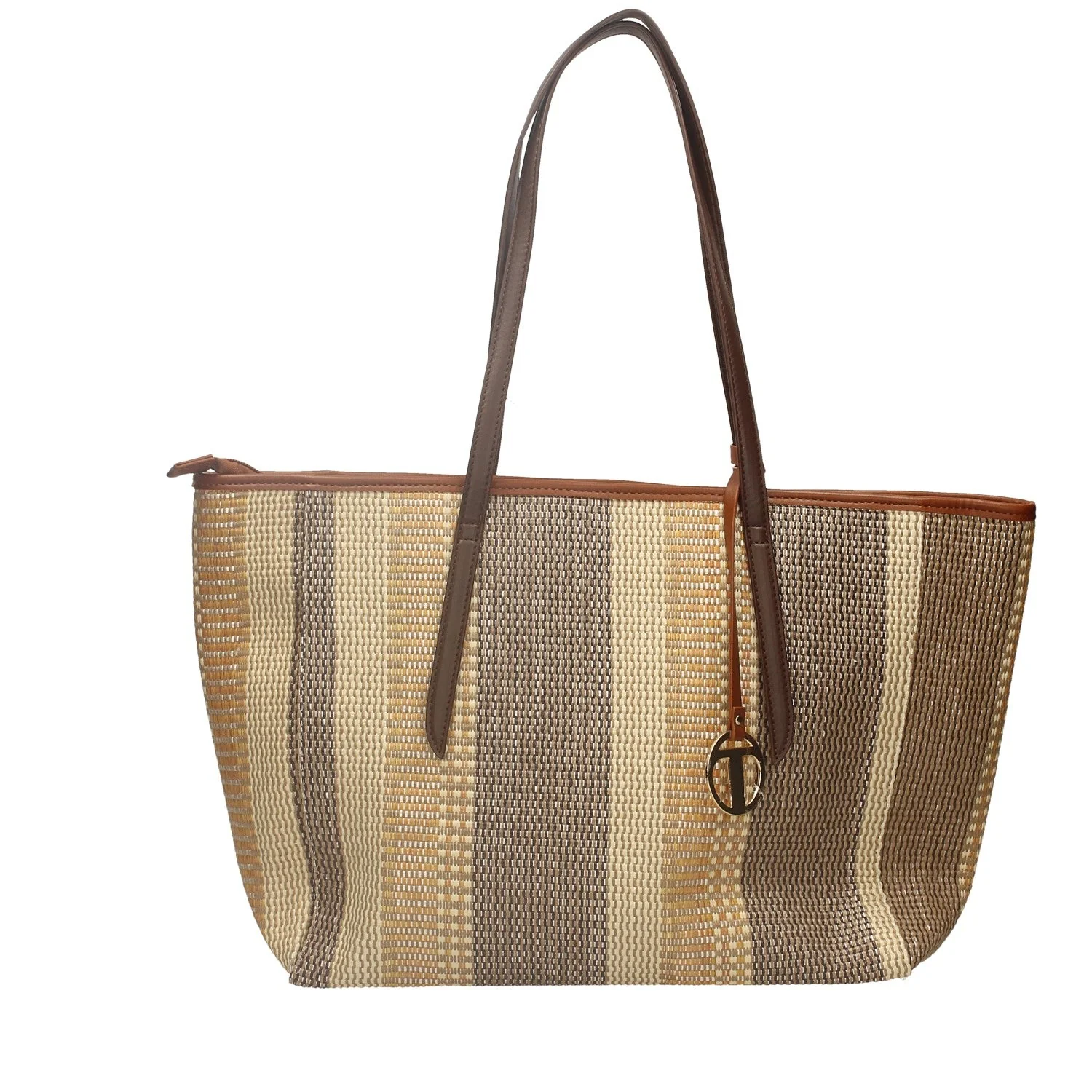 Tote bag blu con contrasto marrone.Tessuto in paglia intrecciata.Dettaglio con manico rigido e pendente.