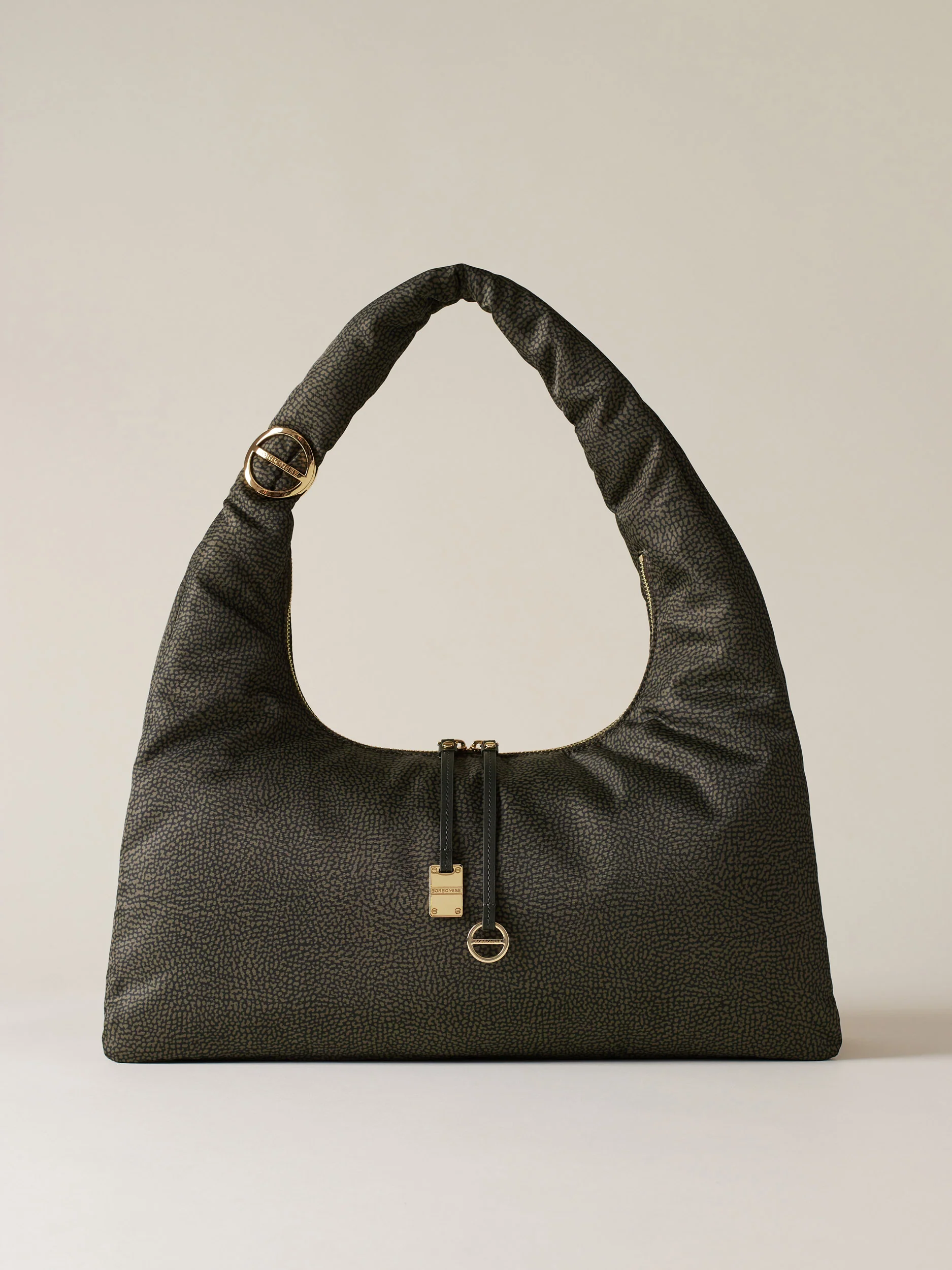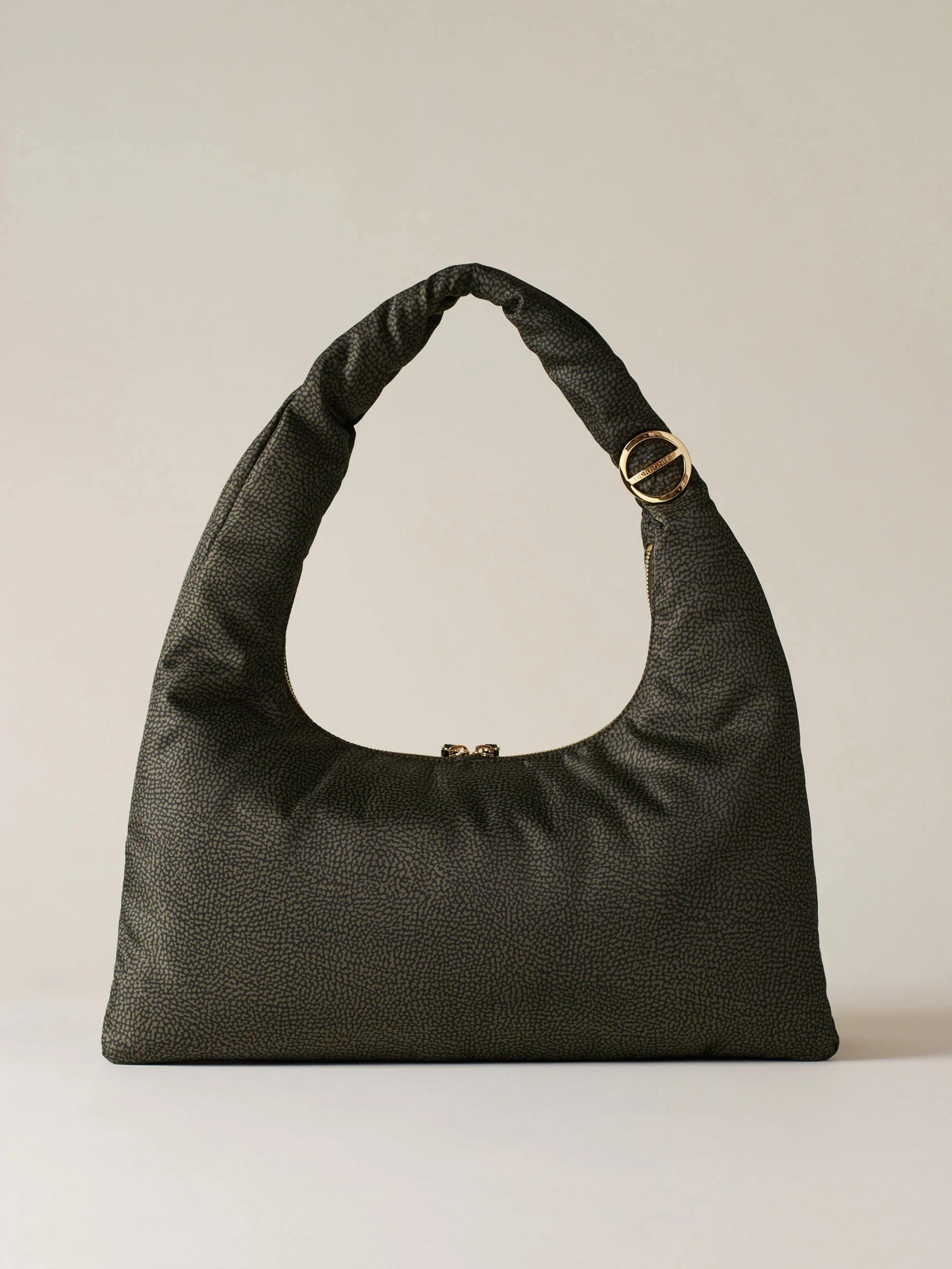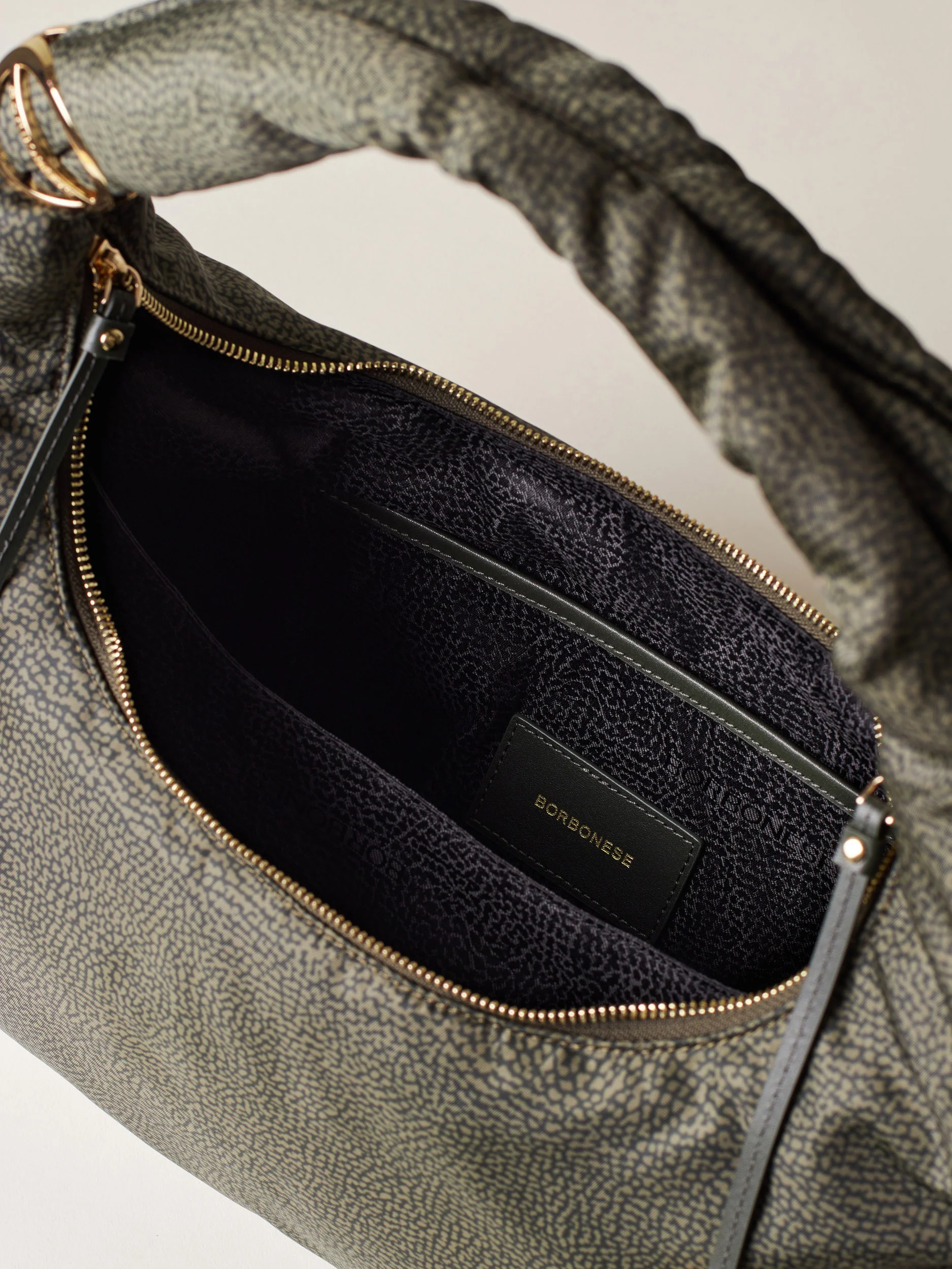 Tessuto riciclato stampato Op Fodera di tessuto jacquard riciclato Chiusura esterna con zip metallo e doppio cursore, tirazip in pelle con elementi Decorativi a vite e placchetta logati Due scomparti interni aperti Una tasca interna aperta Metallerie oro chiaro Misura large