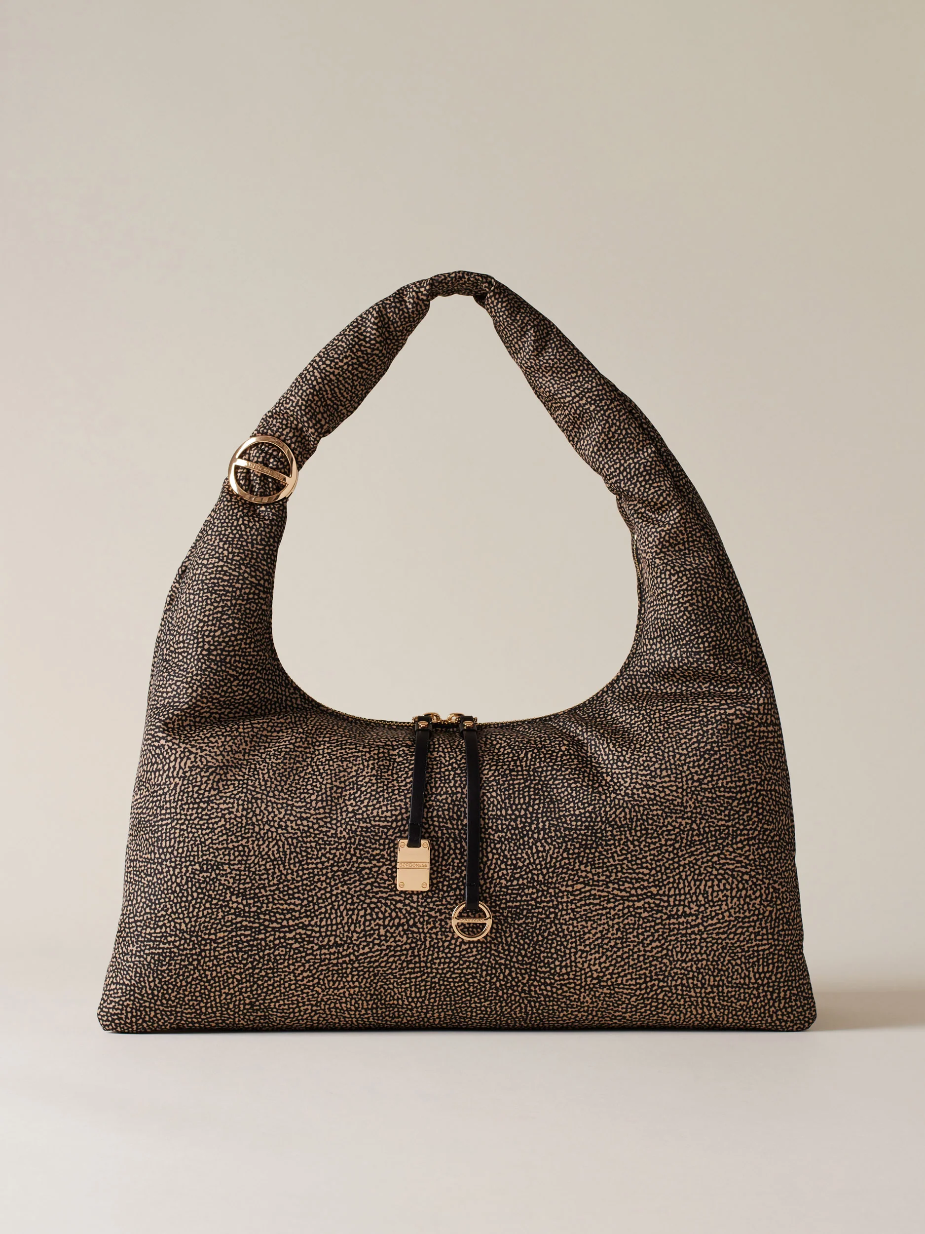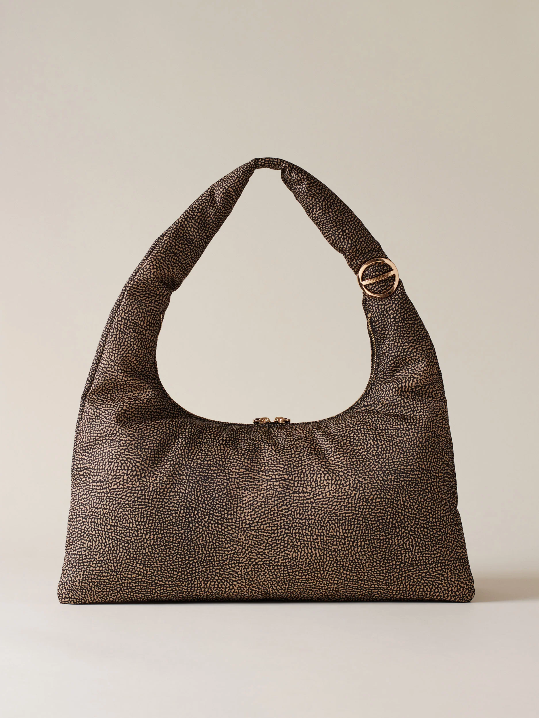 Tessuto riciclato stampato Op Fodera di tessuto jacquard riciclato Chiusura esterna con zip metallo e doppio cursore, tirazip in pelle con elementi Decorativi a vite e placchetta logati Due scomparti interni aperti Una tasca interna aperta Metallerie oro chiaro Misura large
