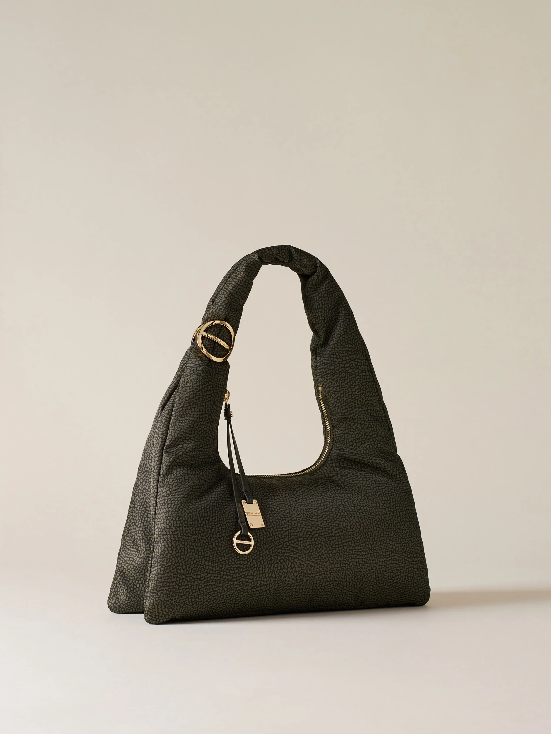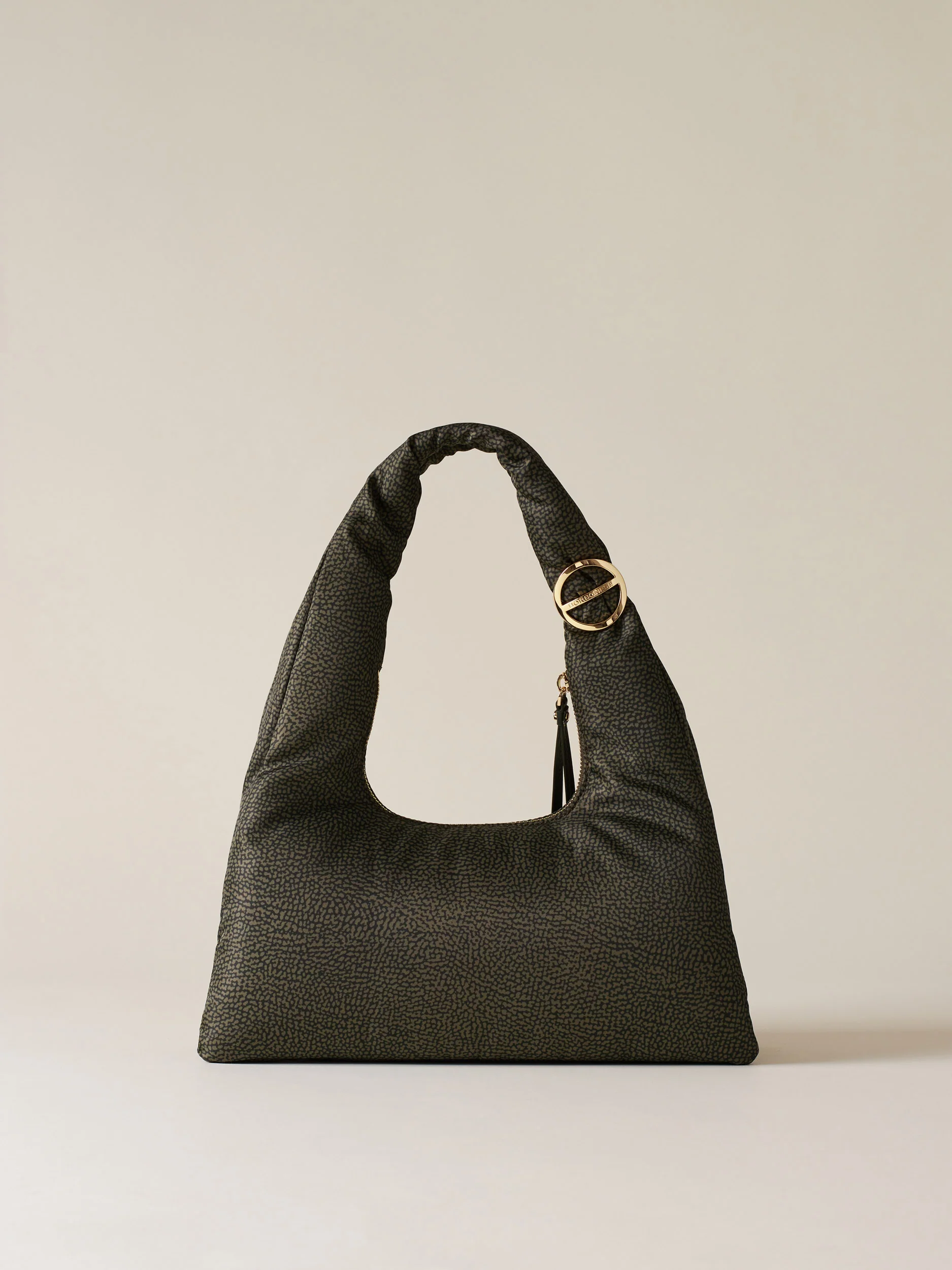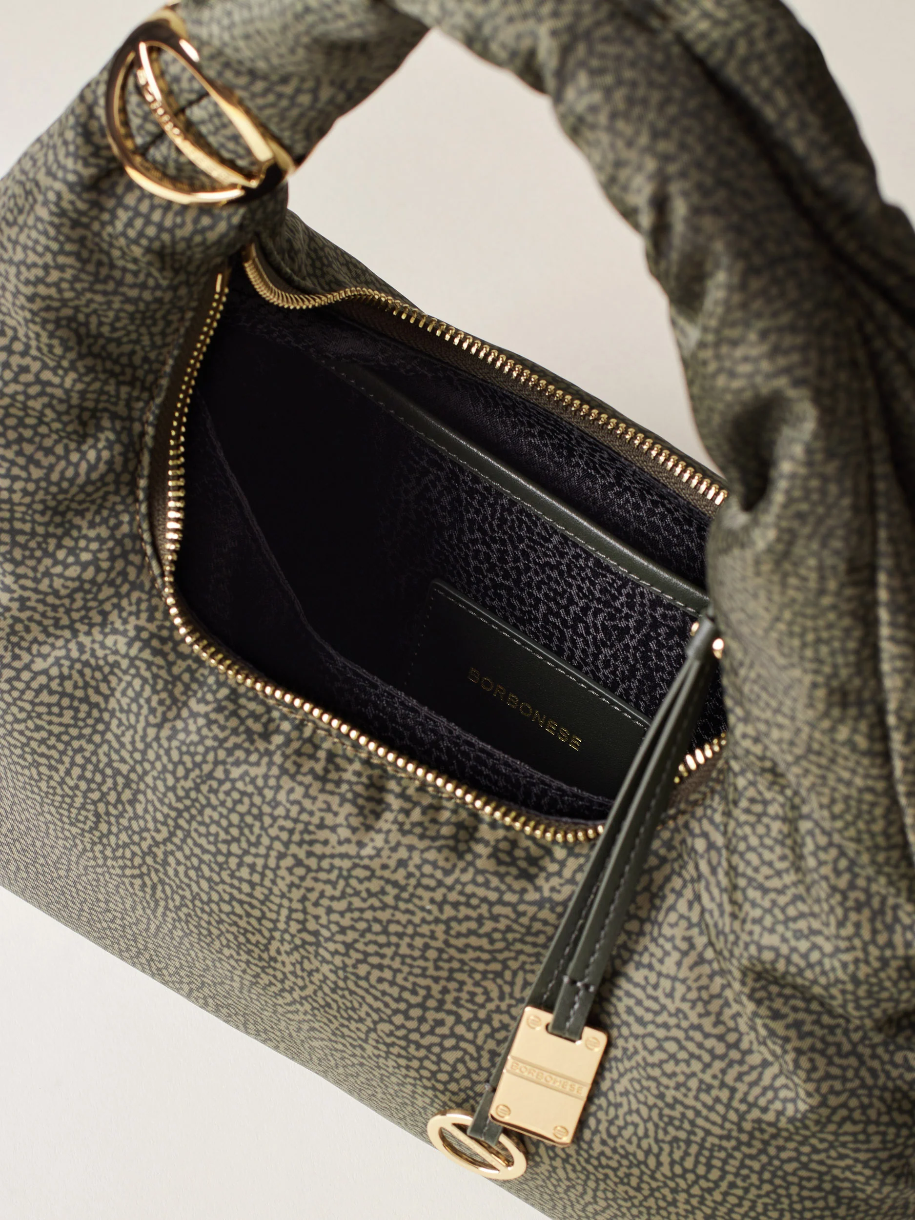 Tessuto riciclato stampato Op Fodera di tessuto jacquard riciclato Chiusura esterna con zip metallo e tirazip in pelle con elementi decorativi a vite e placchetta logati Due scomparti interni aperti Una tasca interna aperta Metallerie oro chiaro Misura small