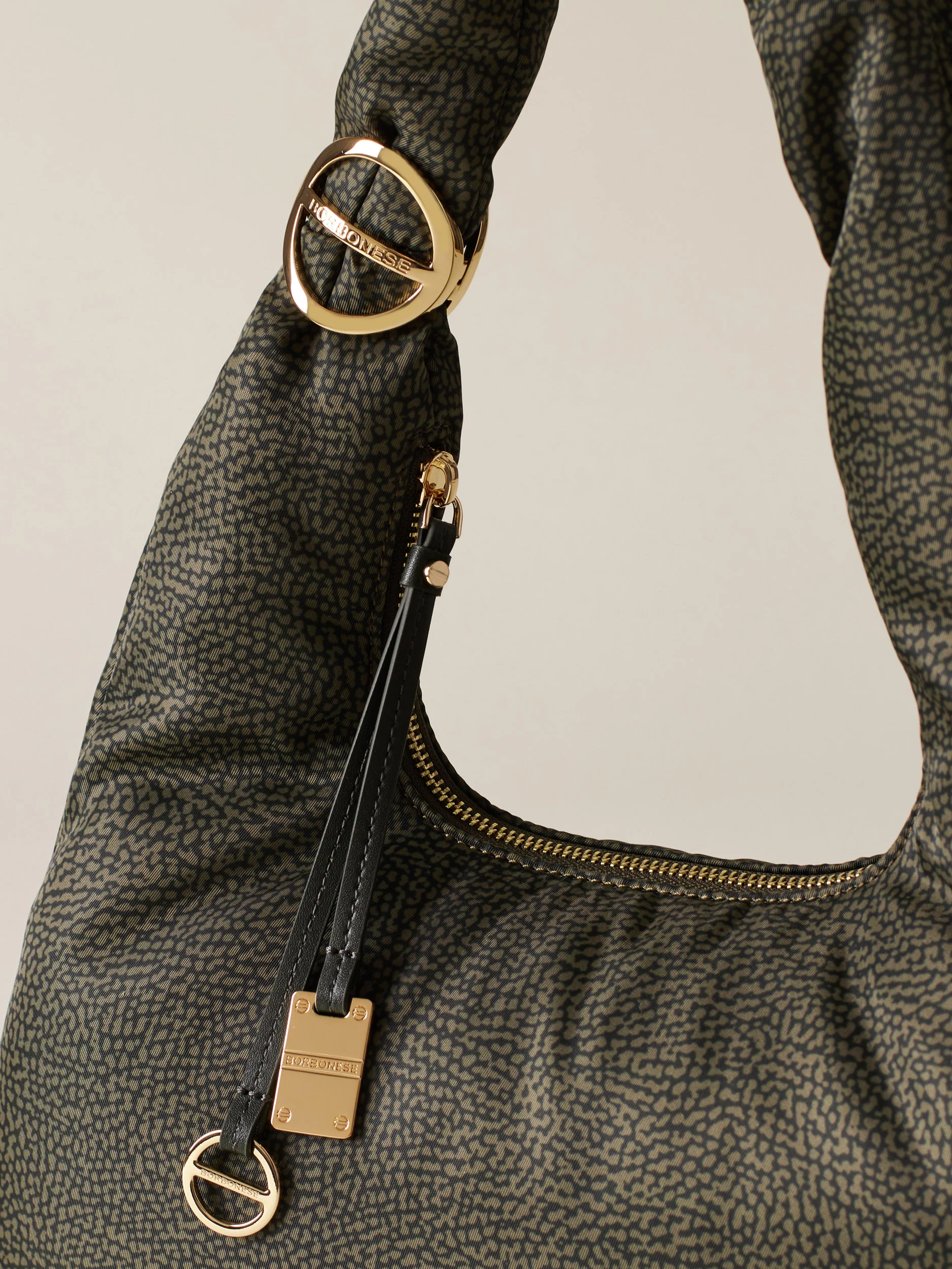 - Chiusura esterna con zip metallo e tirazip in pelle con elementi decorativi a vite e placchetta logati