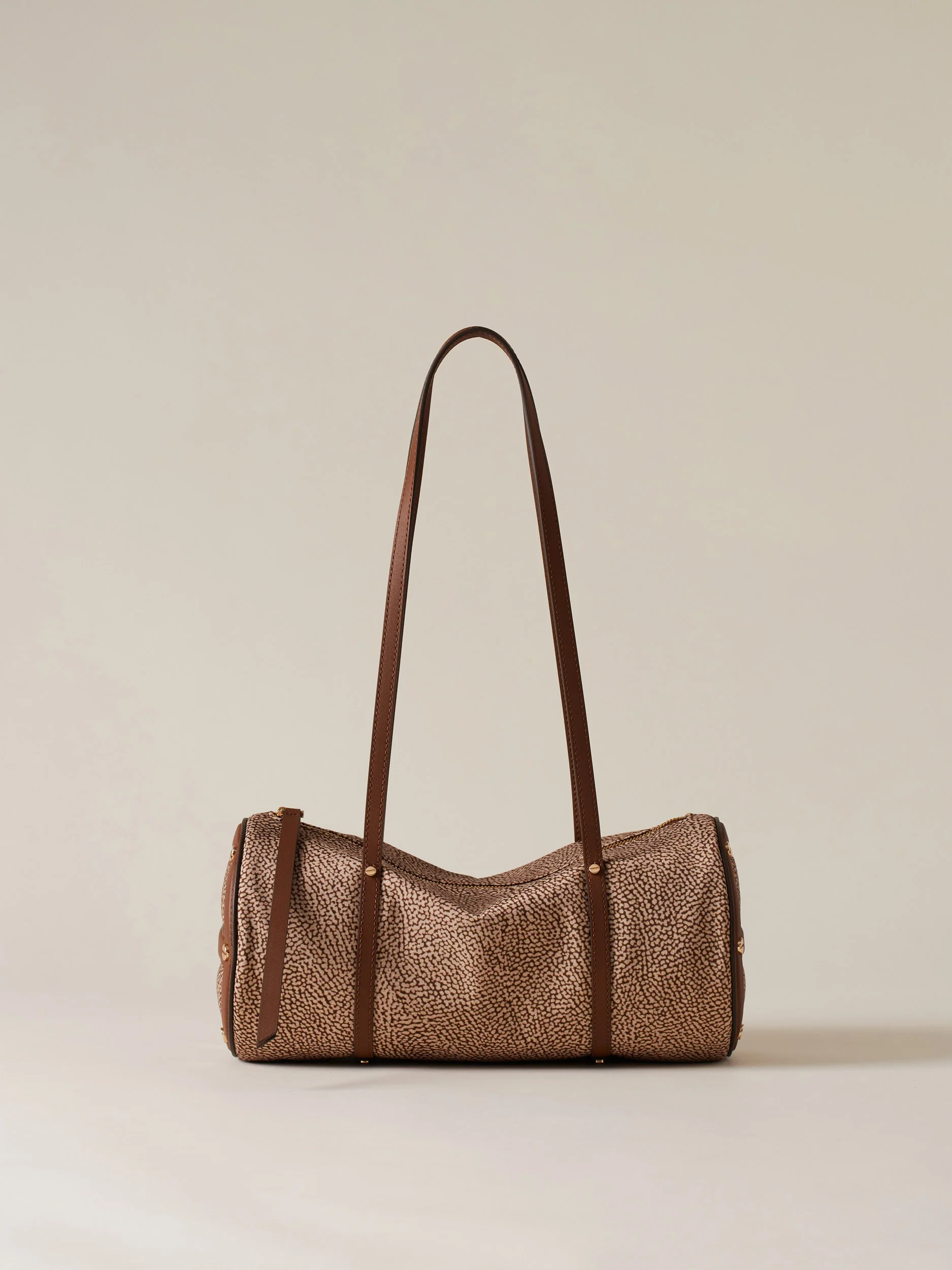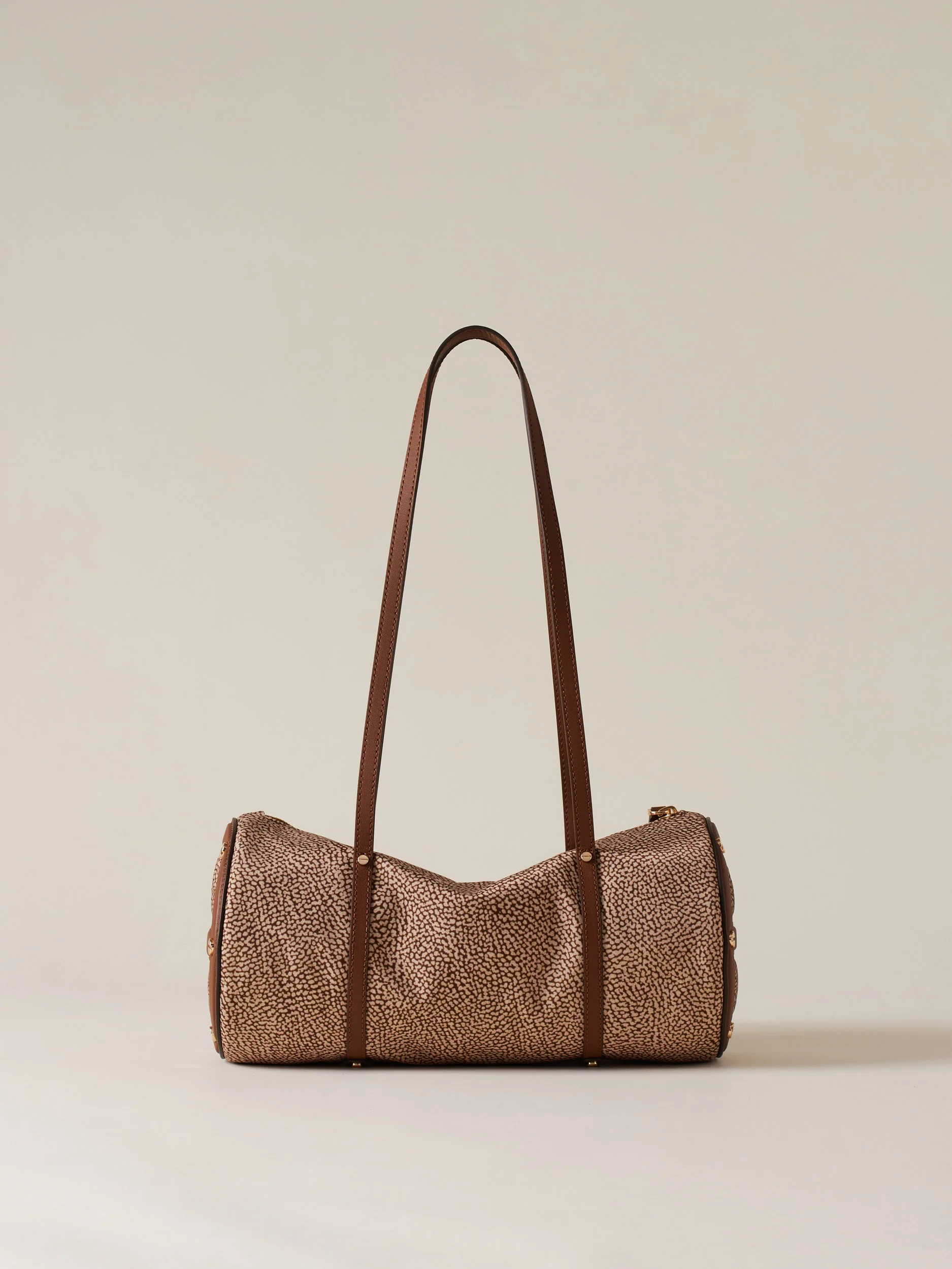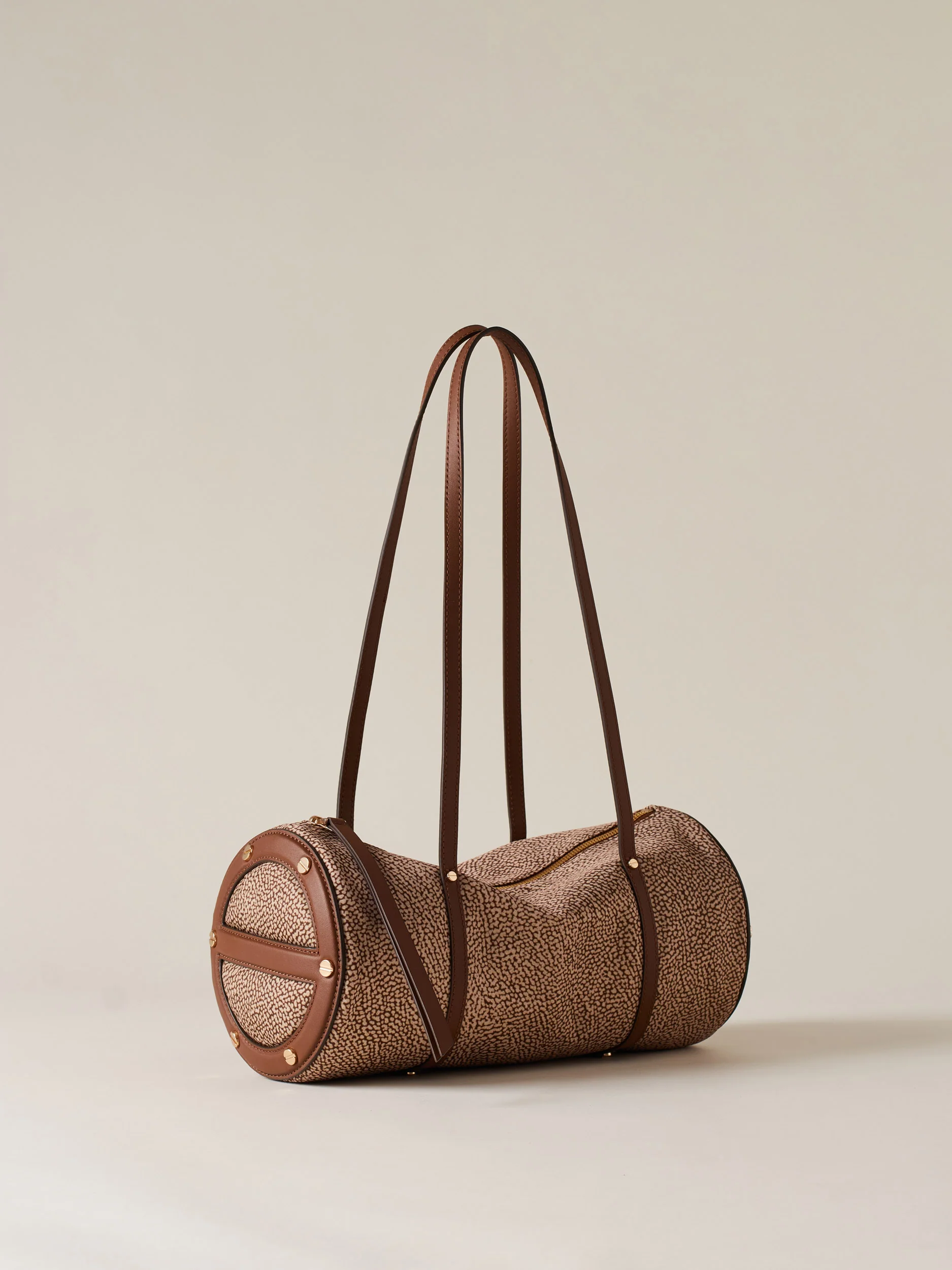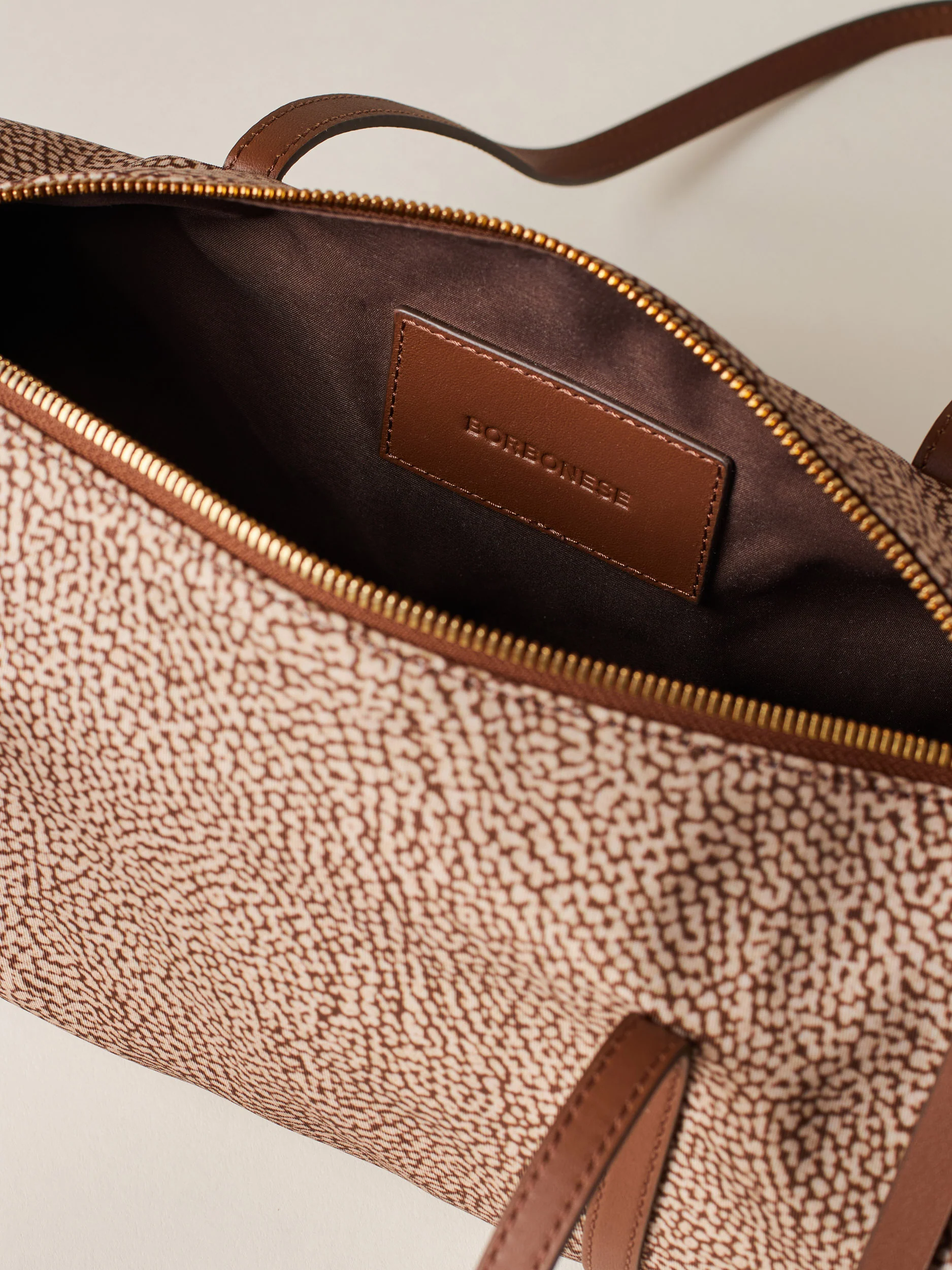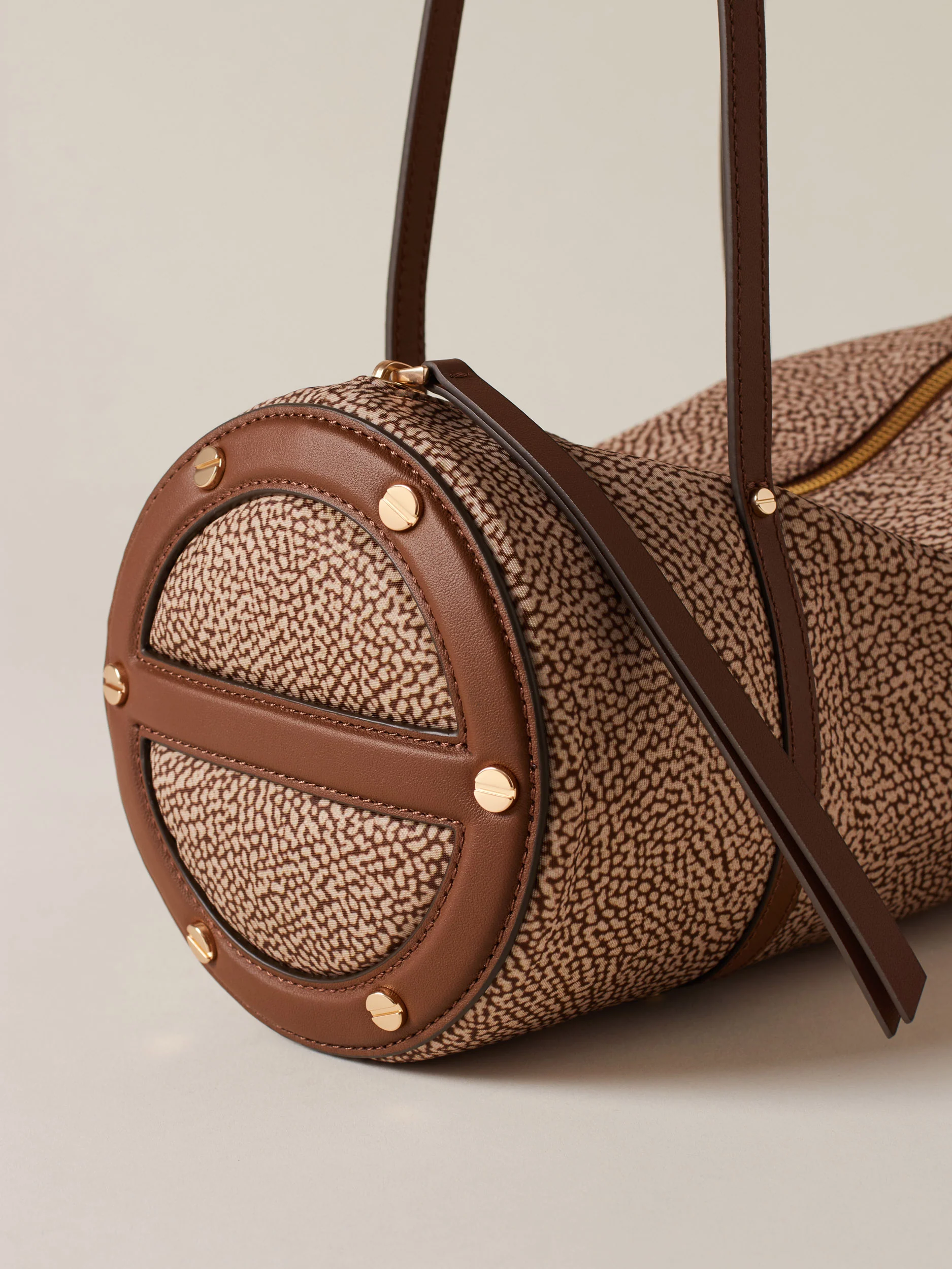 Tessuto riciclato stampa op Dettagli in vitello Fodera in tessuto Chiusura con zip metallo e tirazip in pelle Lateralmente dettagli in pelle a forma di vite Metallerie oro chiaro opaco Misura medium