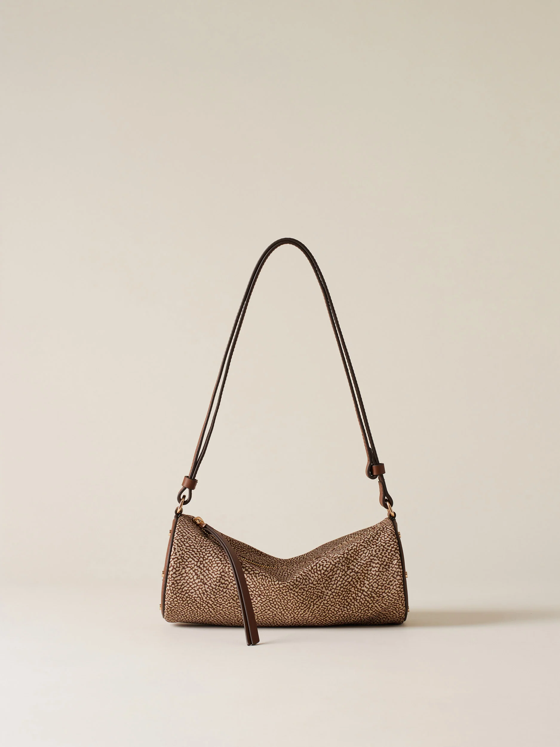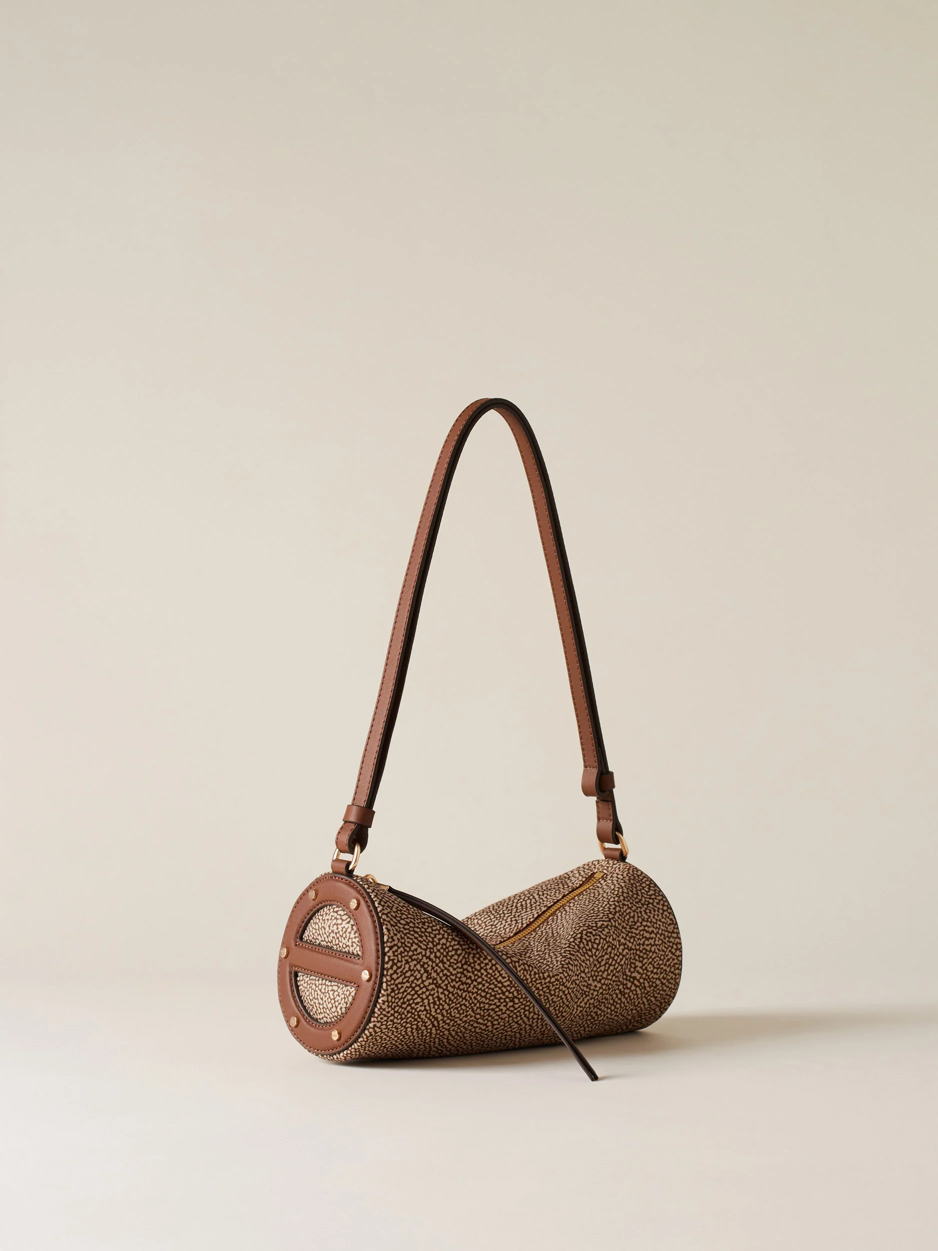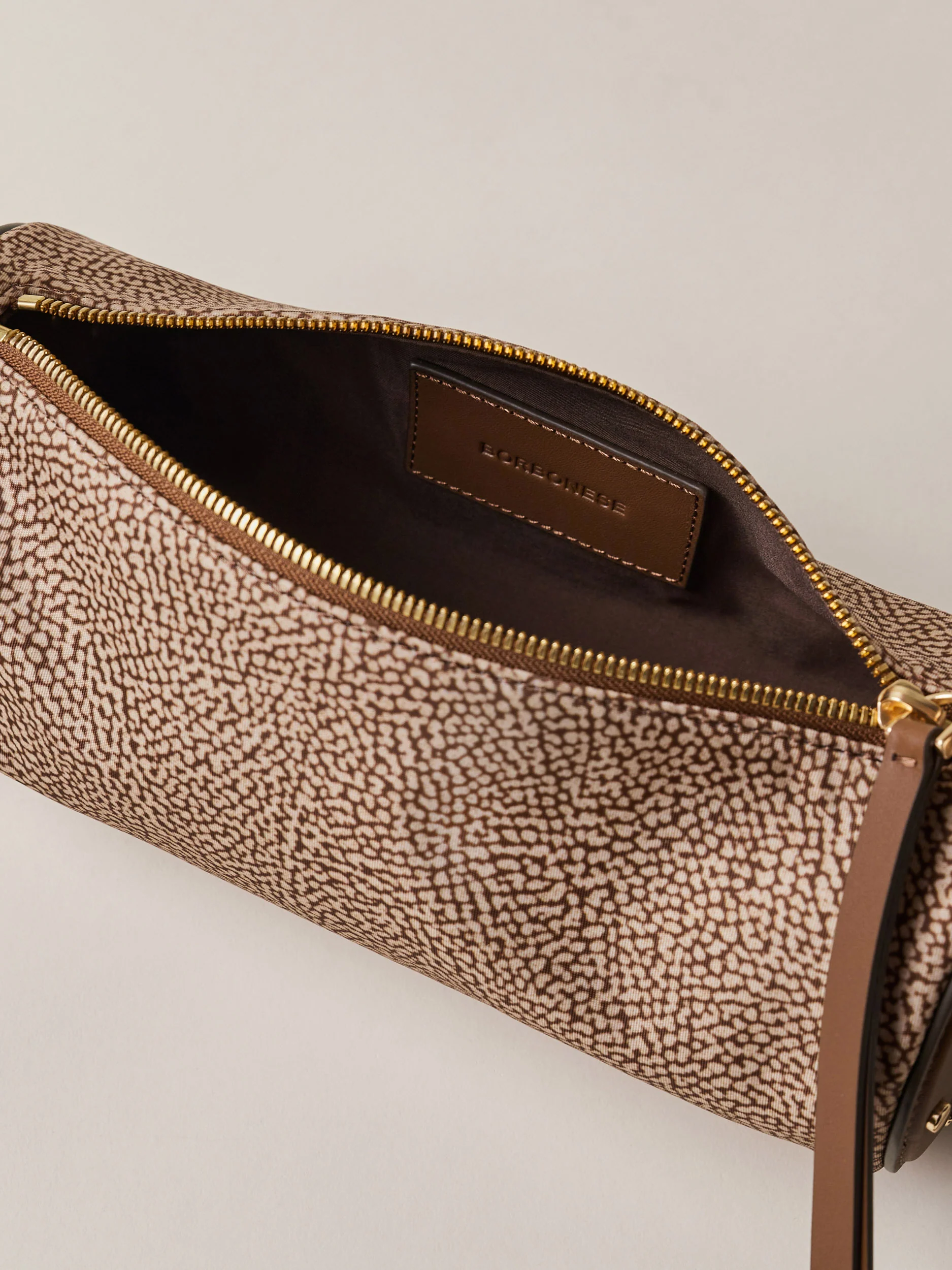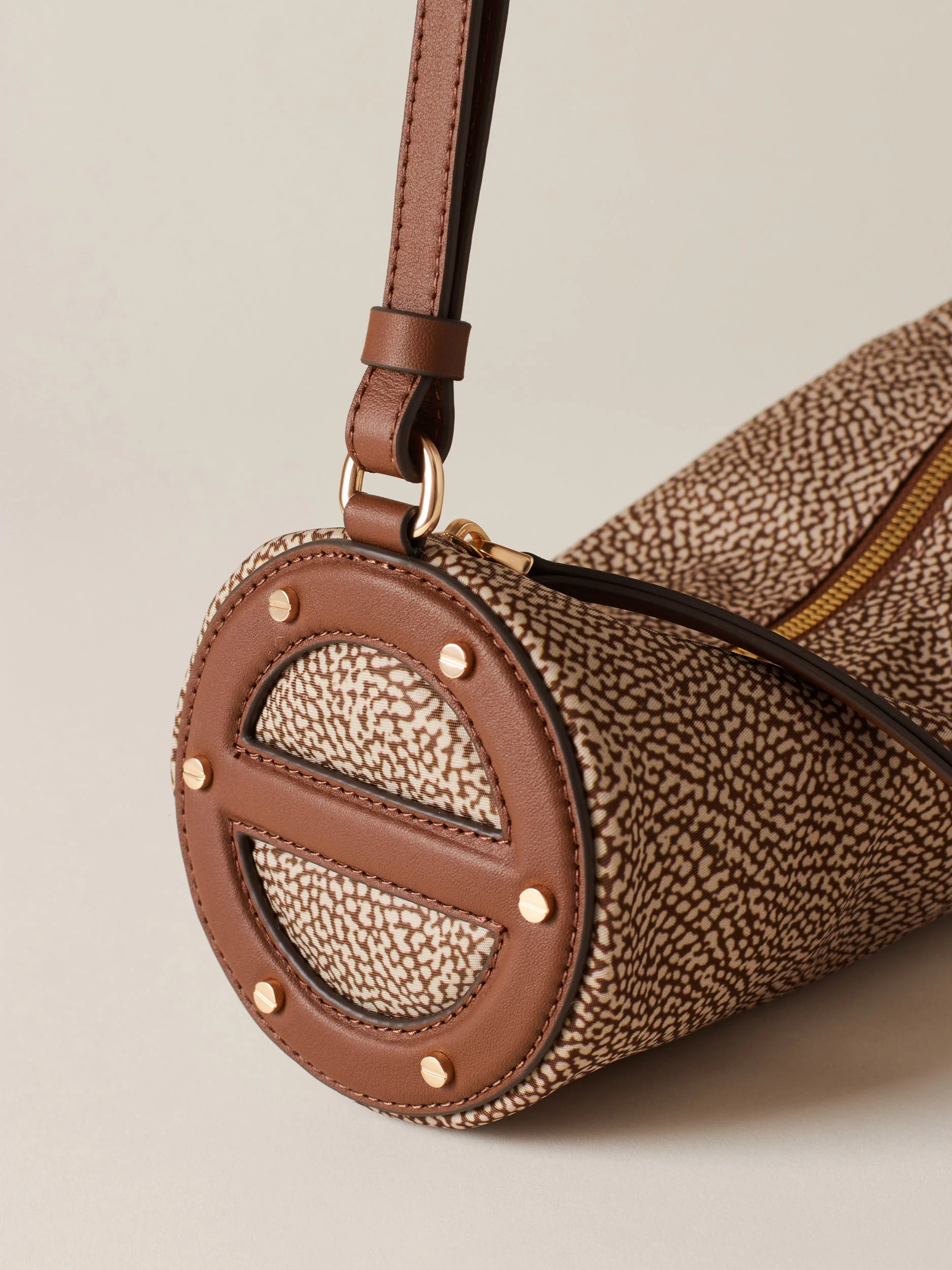 Tessuto riciclato stampa op Dettagli in vitello Fodera in tessuto Chiusura con zip metallo e tirazip in pelle Tracolla in vitello regolabile Lateralmente dettagli in pelle a forma di vite Metallerie oro chiaro opaco Misura small