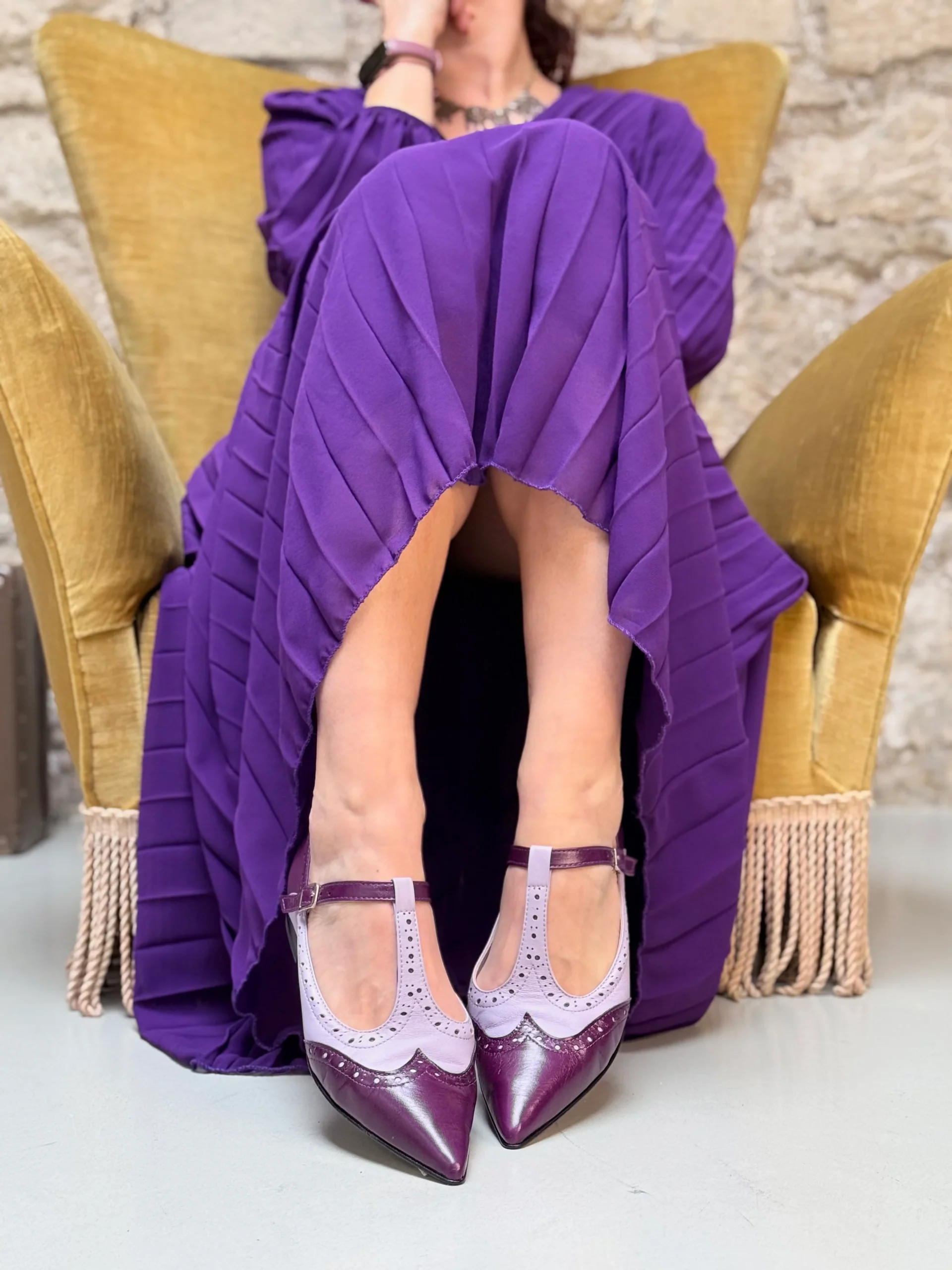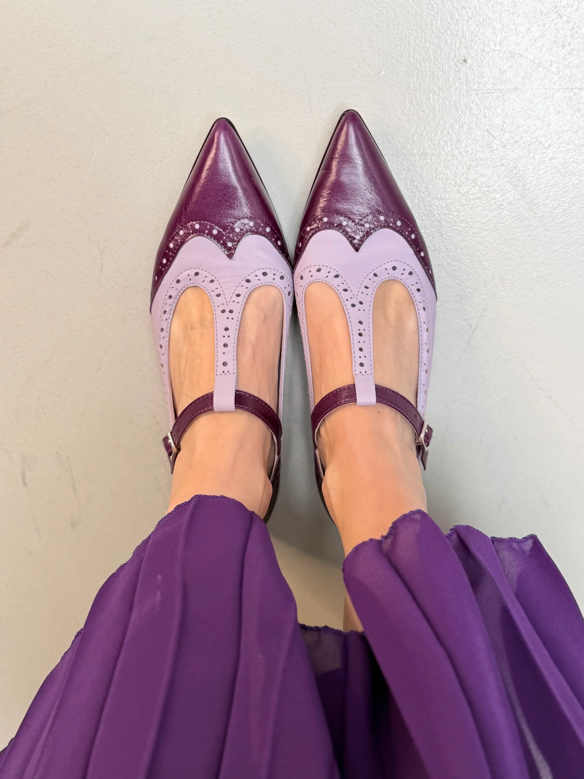 Wendy Uva è una scarpina bassa realizzata in morbida nappa, presenta punta e tallone in viola profondo, bilanciati dai lati e dal T-bar in elegante tonalità glicine.
