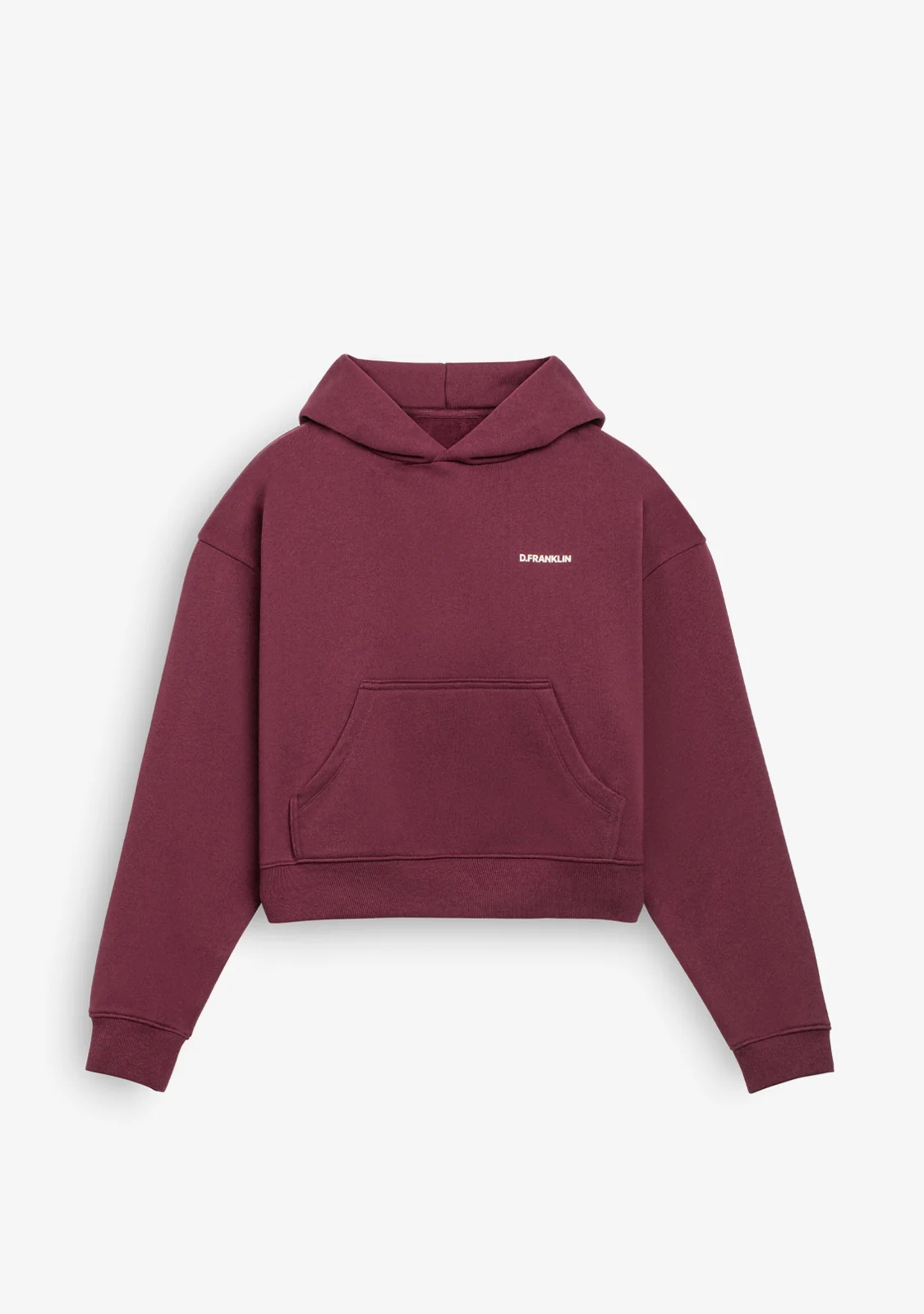 Questa felpa bordeaux corta con cappuccio presenta il logo D.Franklin sulla parte superiore sinistra in bianco a contrasto. Inoltre, il retro presenta un design esclusivo dello stesso colore.