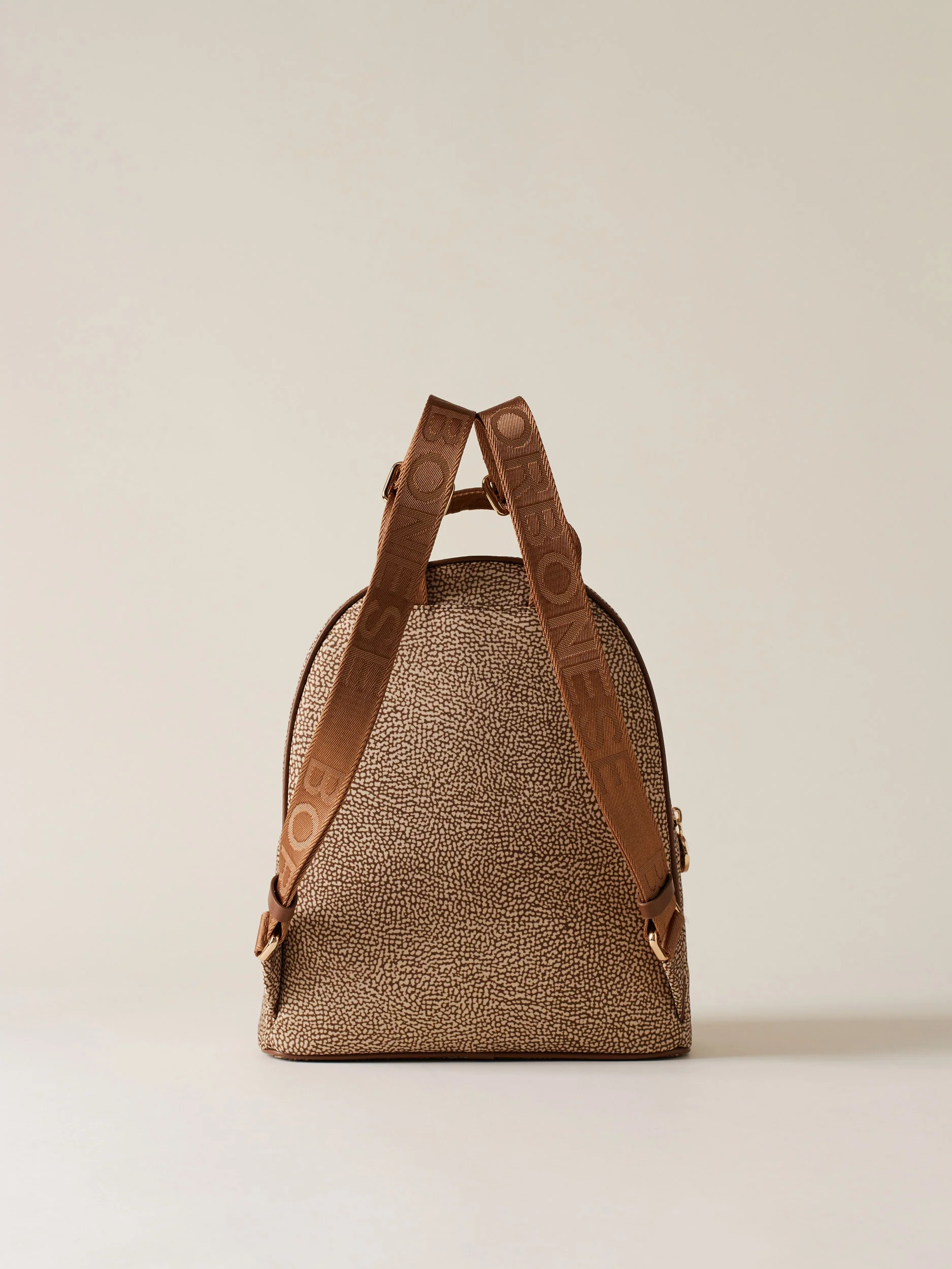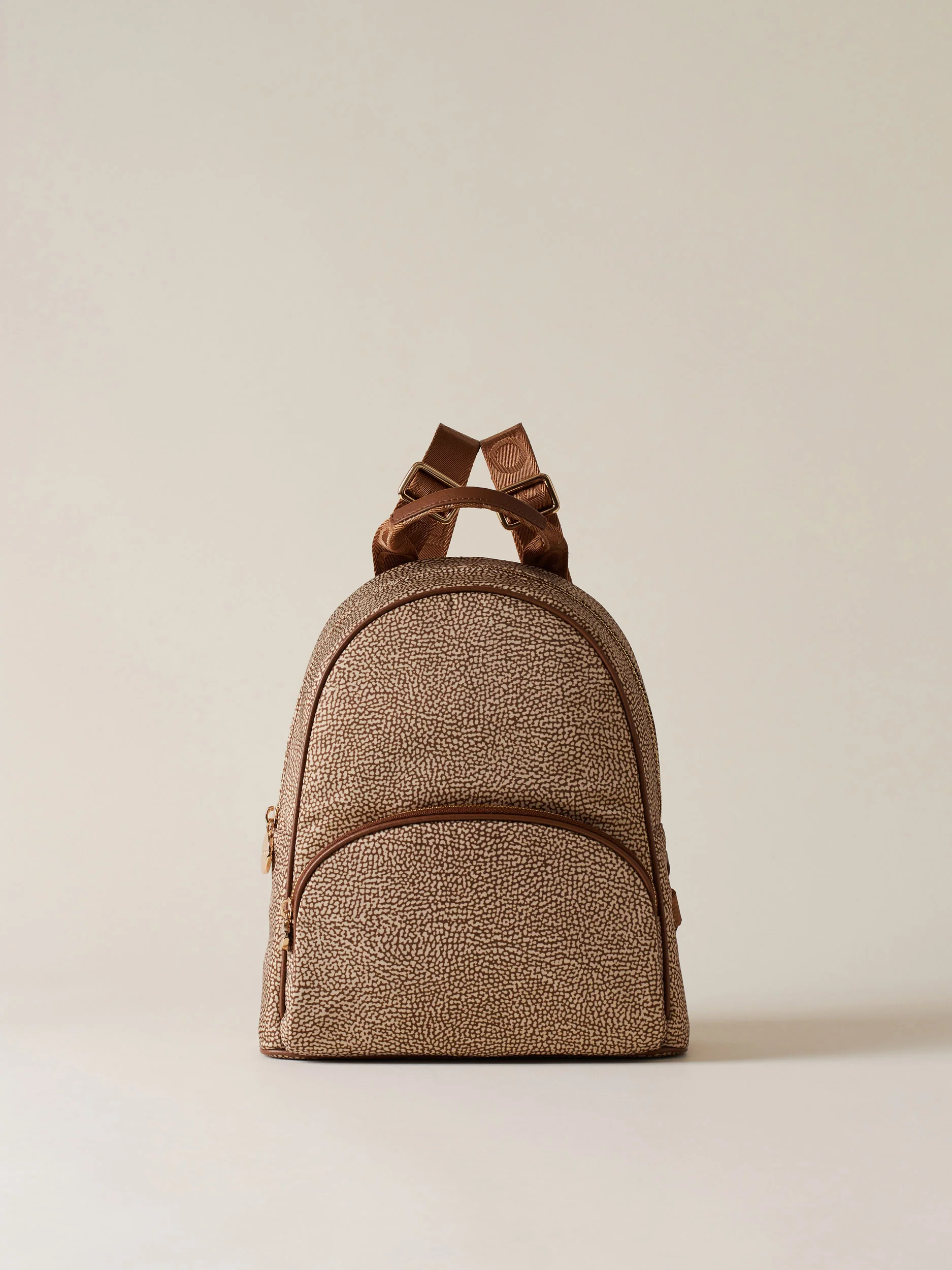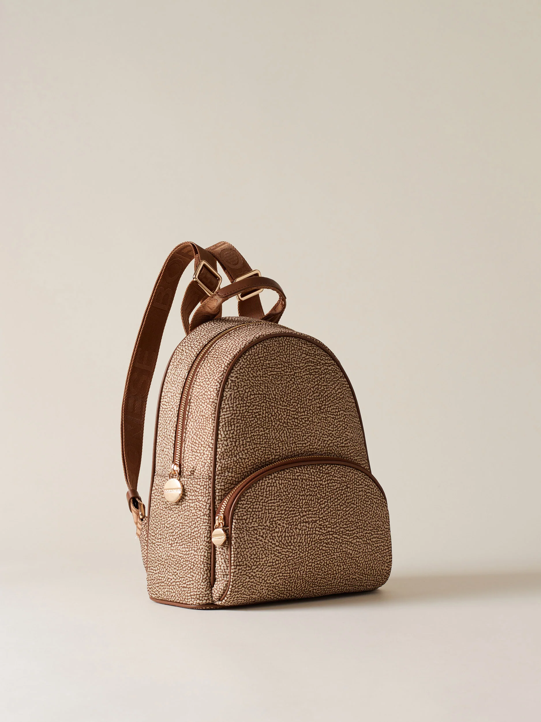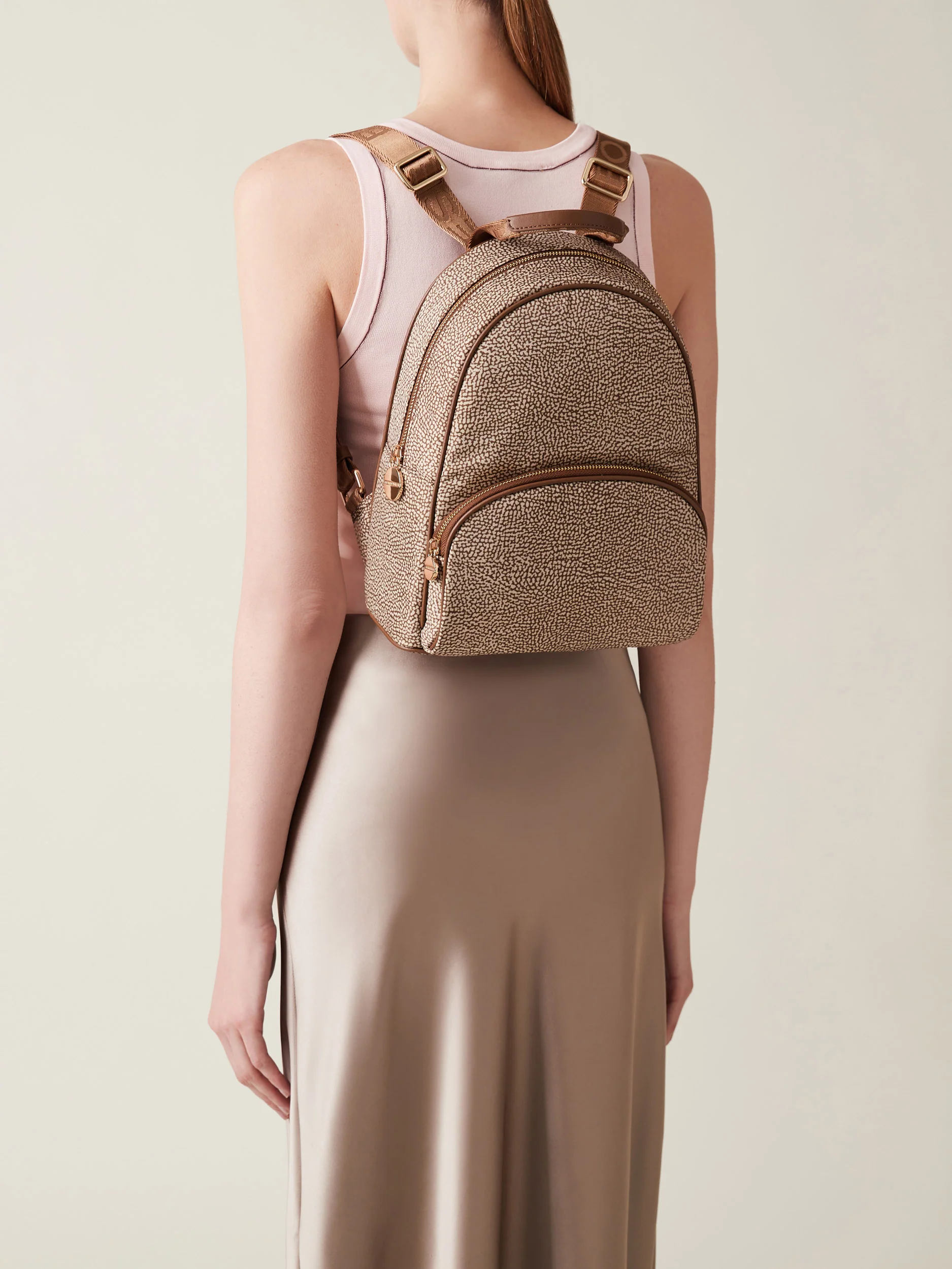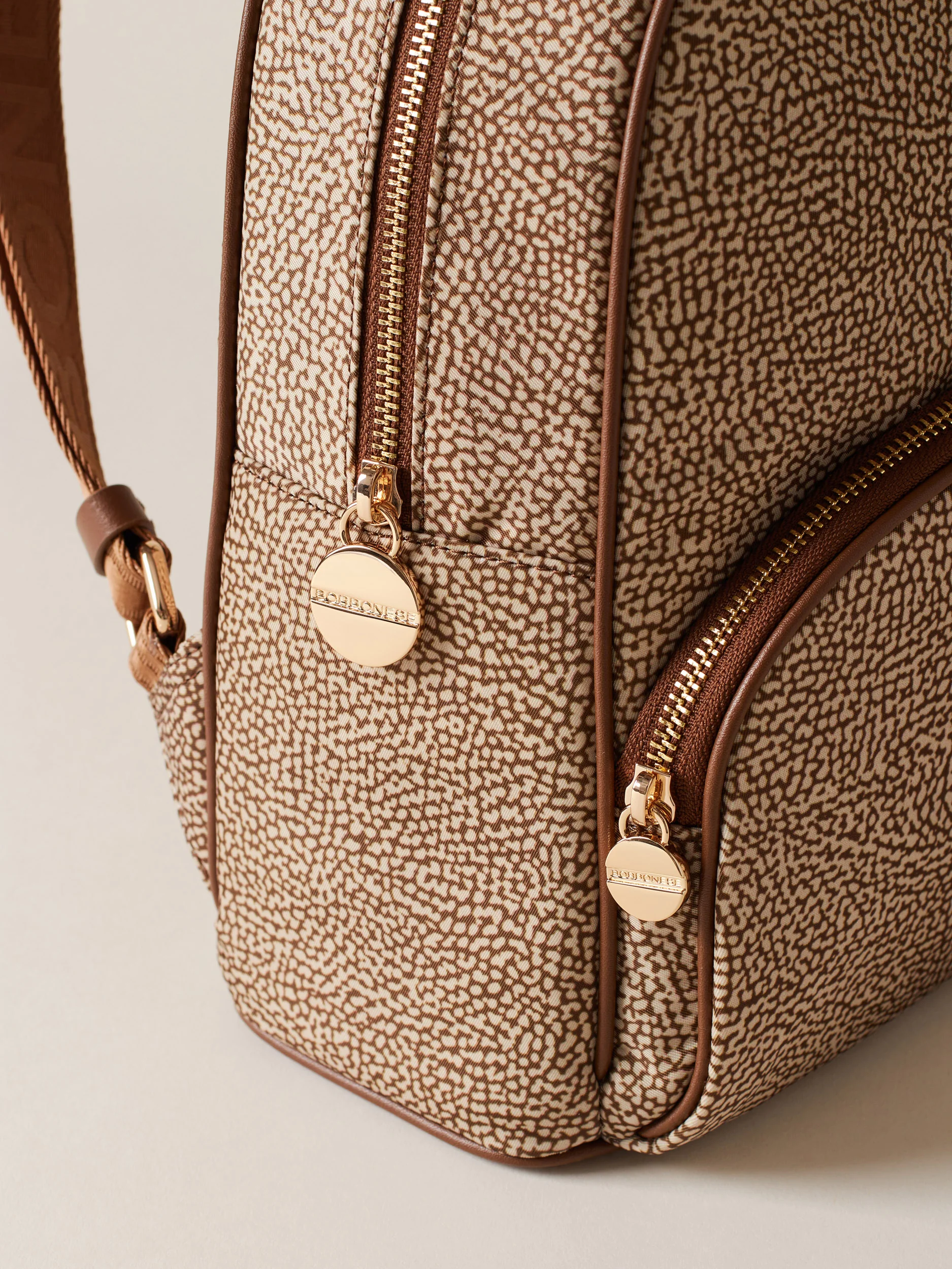 Tessuto riciclato stampato Op Dettagli di pelle di vitello Tasca esterna con zip Chiusura regolata con zip Tirazip di metallo a forma di vite logata Impugnatura con nastro logato e dettaglio in pelle Tasca interna aperta Spallacci regolabili di nastro logato Fodera di tessuto riciclato jacquard Op Metallerie oro chiaro Misura medium